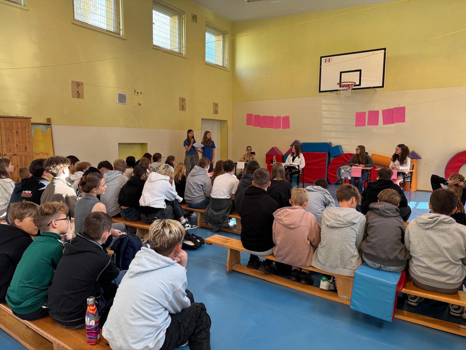 Zgodnie z kalendarzem wyborów, odbyła się szkolna debata przedwyborcza. Kandydatki na przewodniczącą Rady Samorządu Uczniowskiego i Rzecznika Praw Ucznia opowiedziały o sobie i o swoich zainteresowaniach. Przestawiły swoje programy wyborcze, wytłumaczyły jakie działania chcą przeprowadzić w szkole. Pojawił się pomysł na kącik wyciszeń, zajęcia dodatkowe, debatę międzyszkolną. Wywiązała się dyskusja, która pomogła zrozumieć pomysły kandydatek.