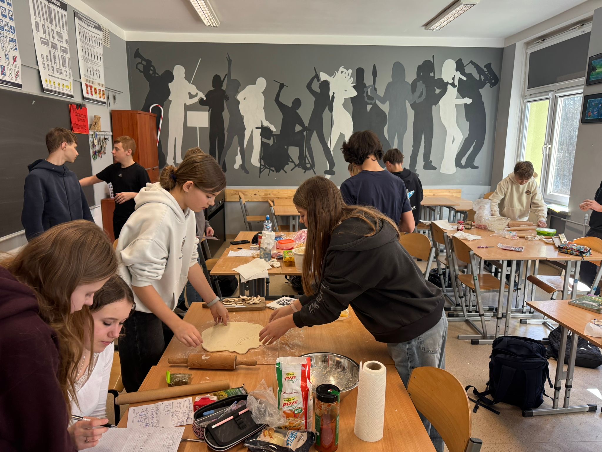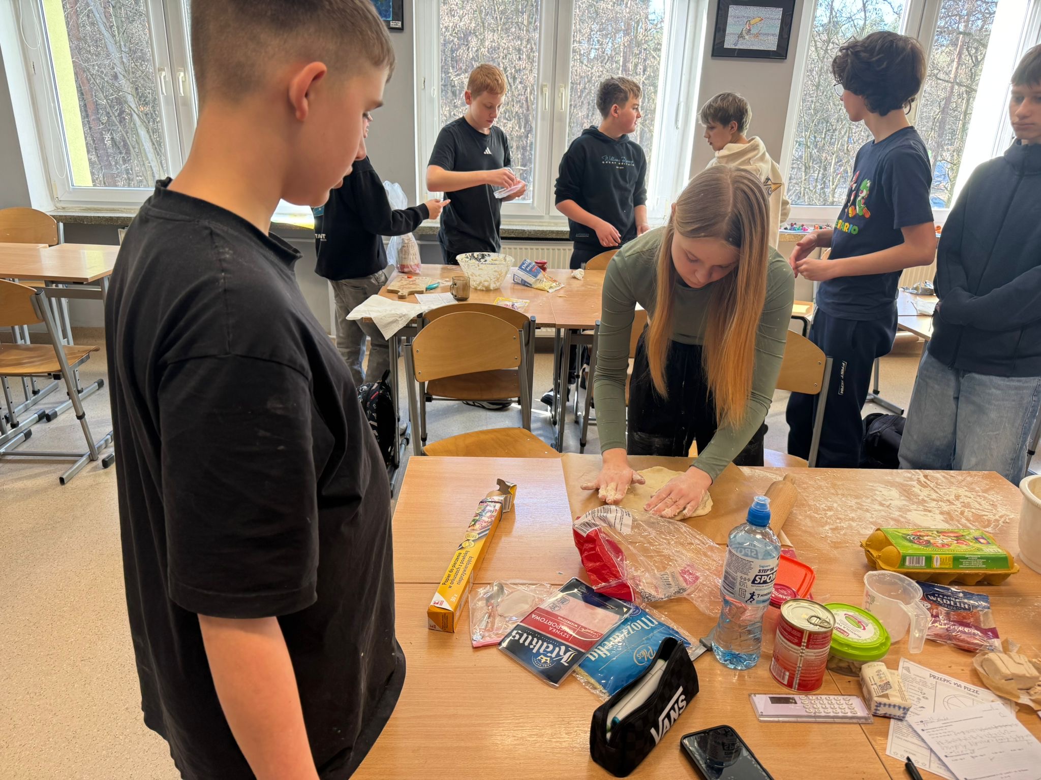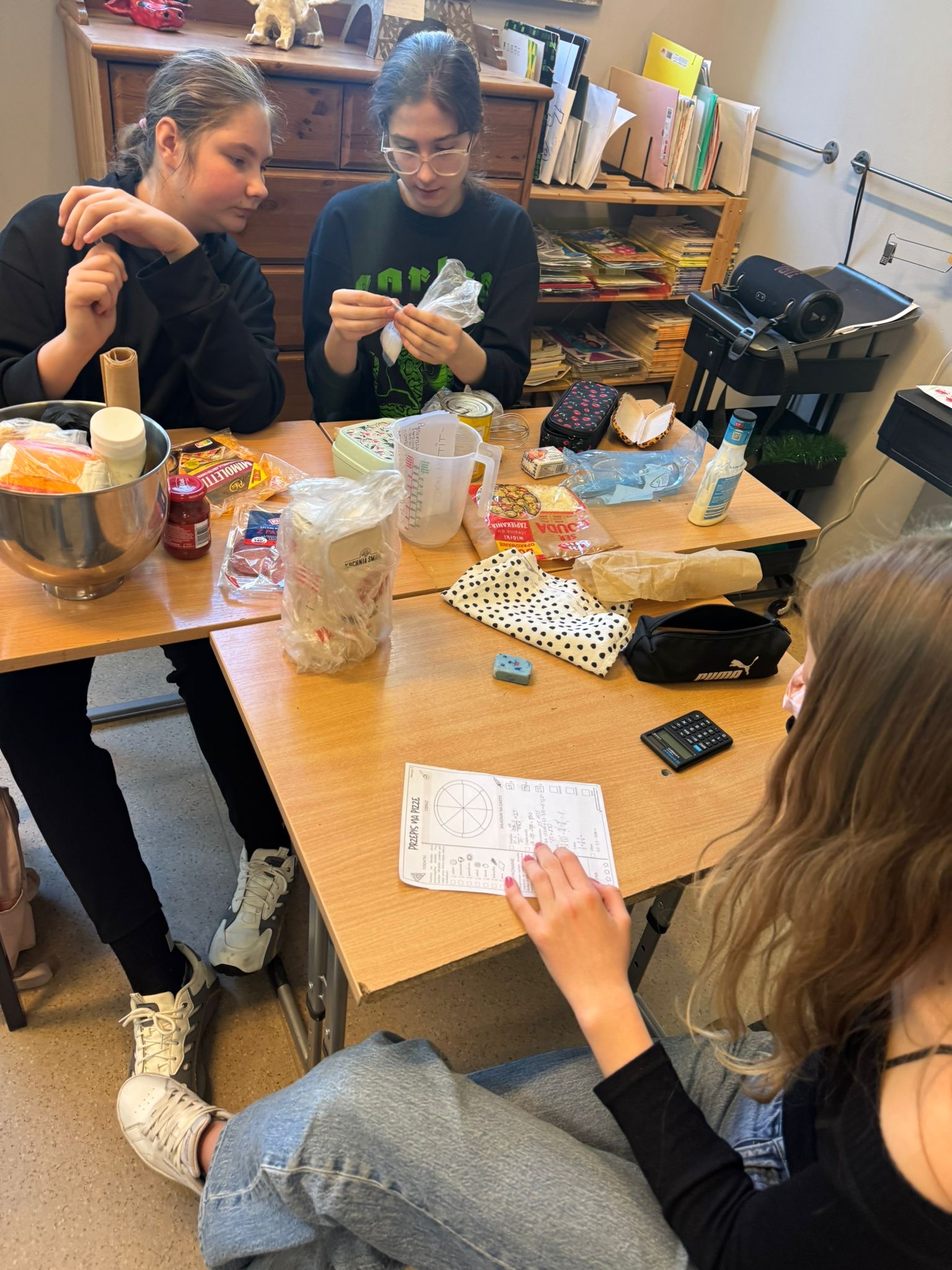 Niedawno obchodziliśmy Dzień Pizzy. Z tej okazji uczniowie klasy 7d otrzymali zaszyfrowany przepis na pizzę. Aby dwiedzieć się, ile i jakich składników będzie potrzebnych do przygotowania ciasta, musieli najpierw rozwiązać zadania matematyczne. Wykonując działania rozszyfrowywali odpowiednie ilości składników, Następnie samodzielnie przygotowali ciasto, dokładnie odmierzając potrzebne produkty. Podczas pracy uczniowie utrwalali między innymi zamianę jednostek, działania na ułamkach oraz pracę z instrukcją krok po kroku. Była to świetna okazja do połączenia matematyki z praktyką i dobrą zabawą. A co najważniejsze- pizze wyszły wyśmienite!
