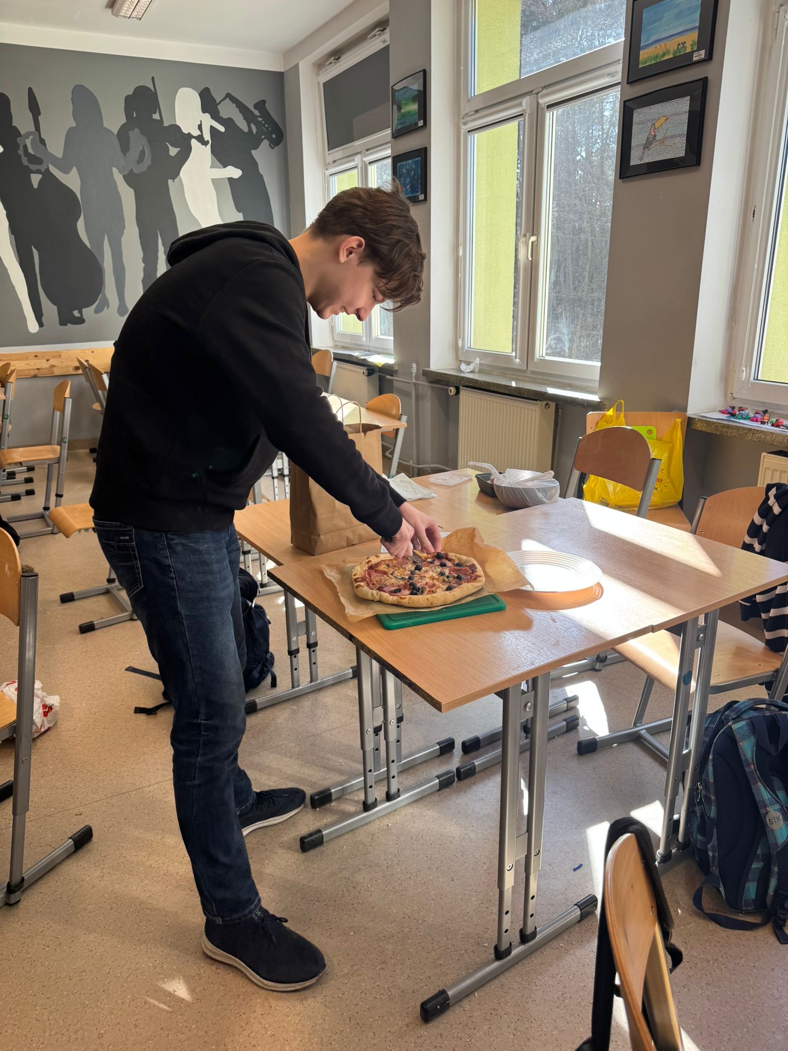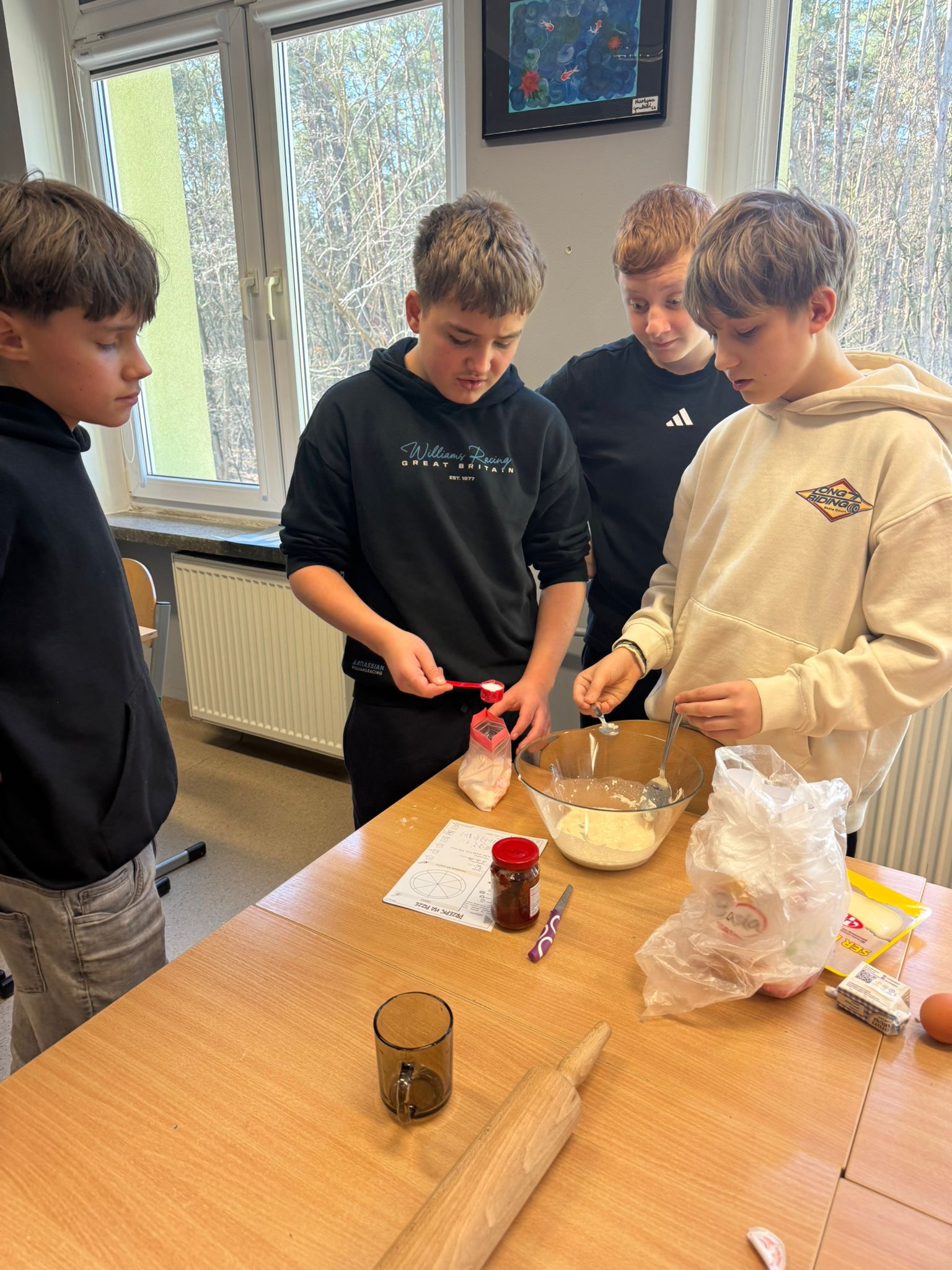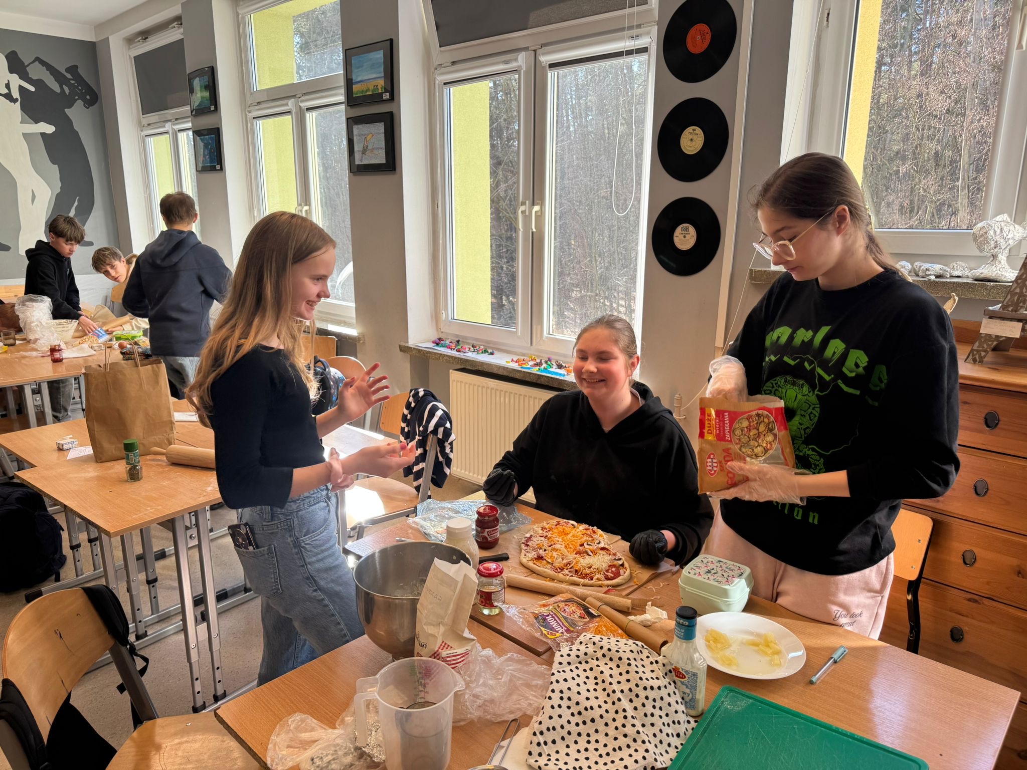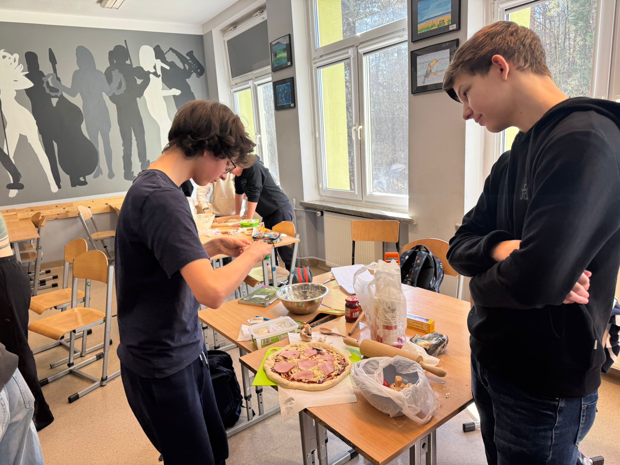 Niedawno obchodziliśmy Dzień Pizzy. Z tej okazji uczniowie klasy 7d otrzymali zaszyfrowany przepis na pizzę. Aby dwiedzieć się, ile i jakich składników będzie potrzebnych do przygotowania ciasta, musieli najpierw rozwiązać zadania matematyczne. Wykonując działania rozszyfrowywali odpowiednie ilości składników, Następnie samodzielnie przygotowali ciasto, dokładnie odmierzając potrzebne produkty. Podczas pracy uczniowie utrwalali między innymi zamianę jednostek, działania na ułamkach oraz pracę z instrukcją krok po kroku. Była to świetna okazja do połączenia matematyki z praktyką i dobrą zabawą. A co najważniejsze- pizze wyszły wyśmienite!
