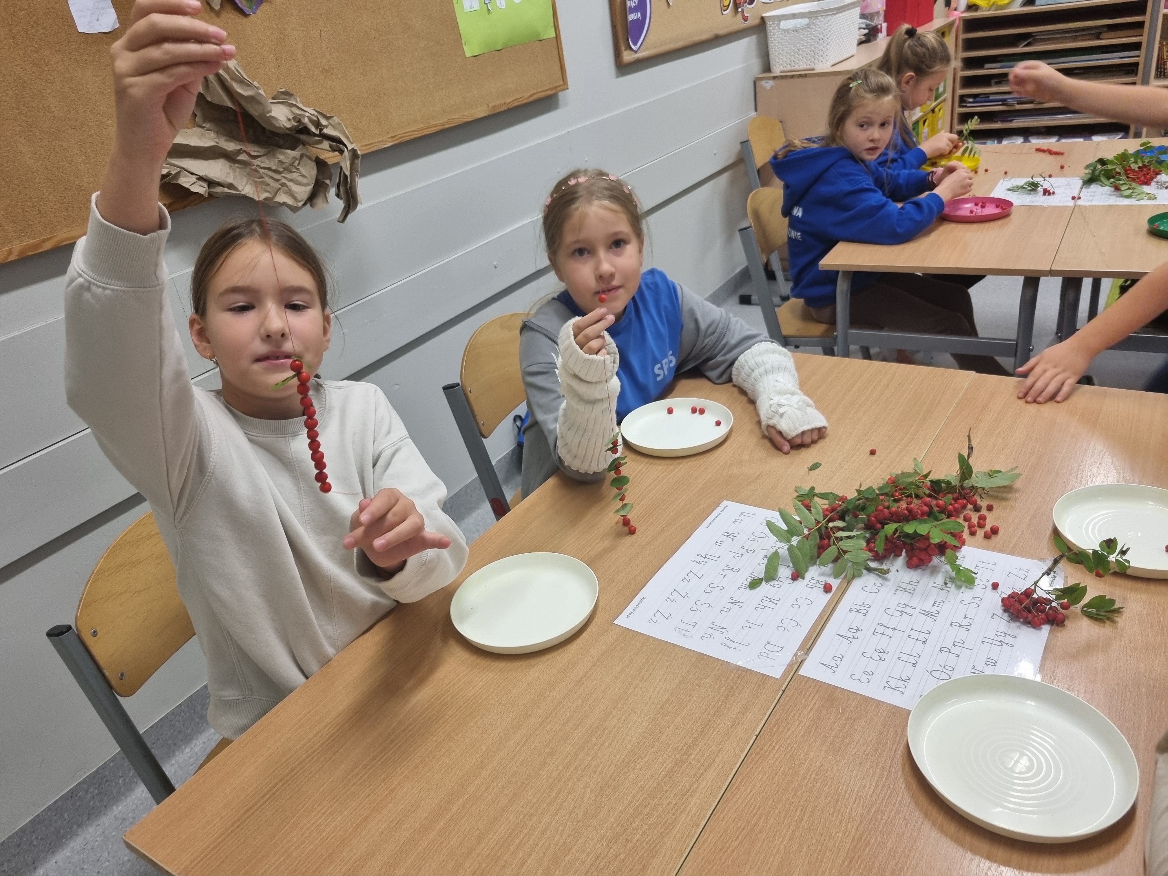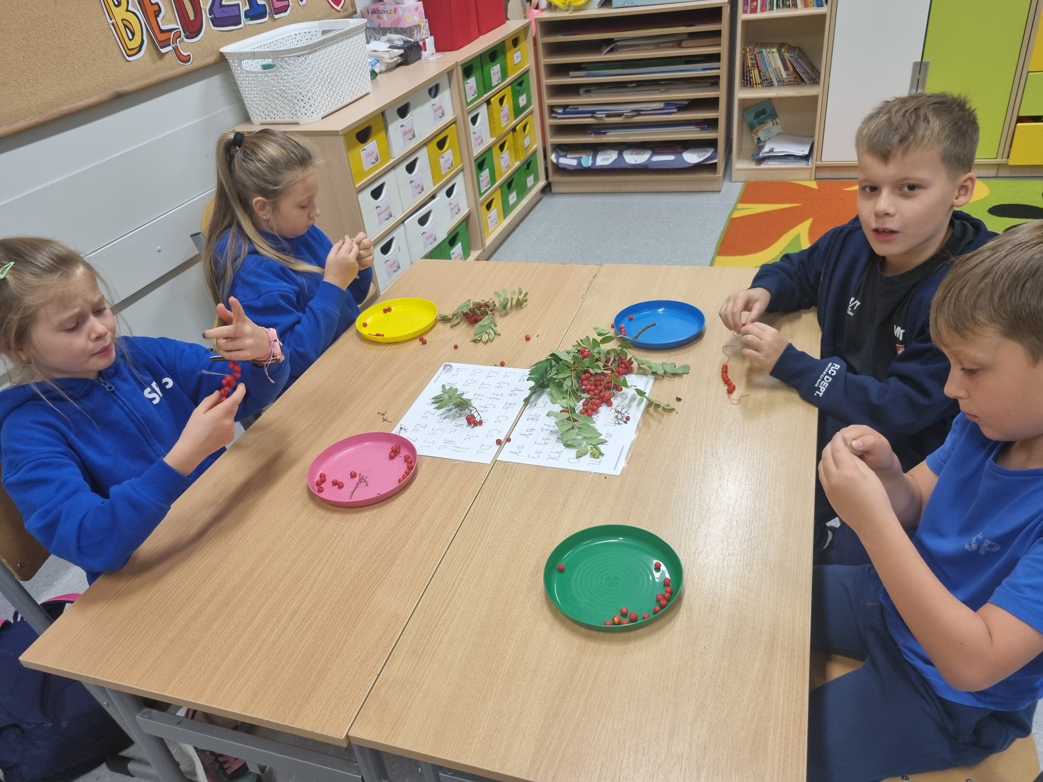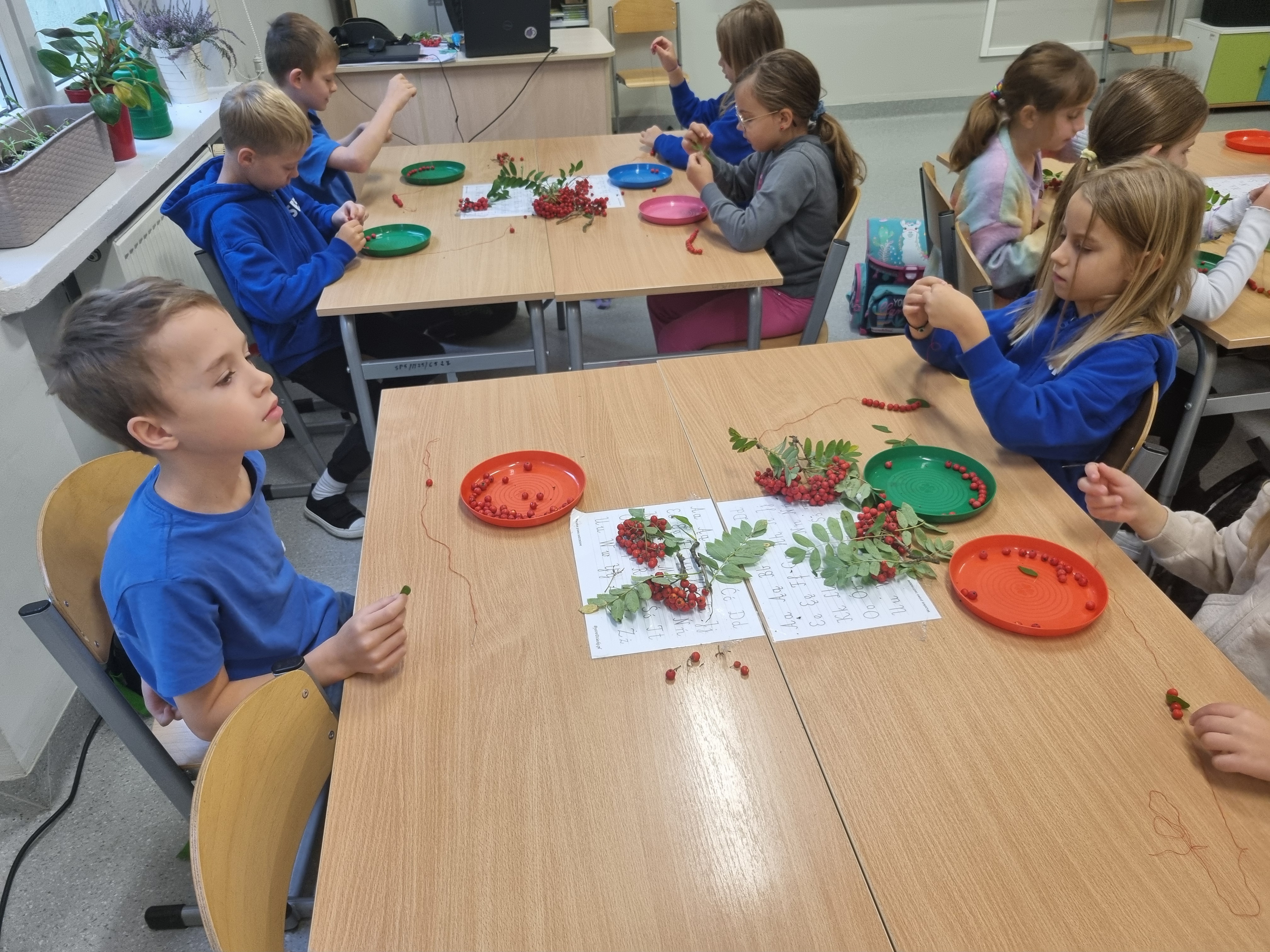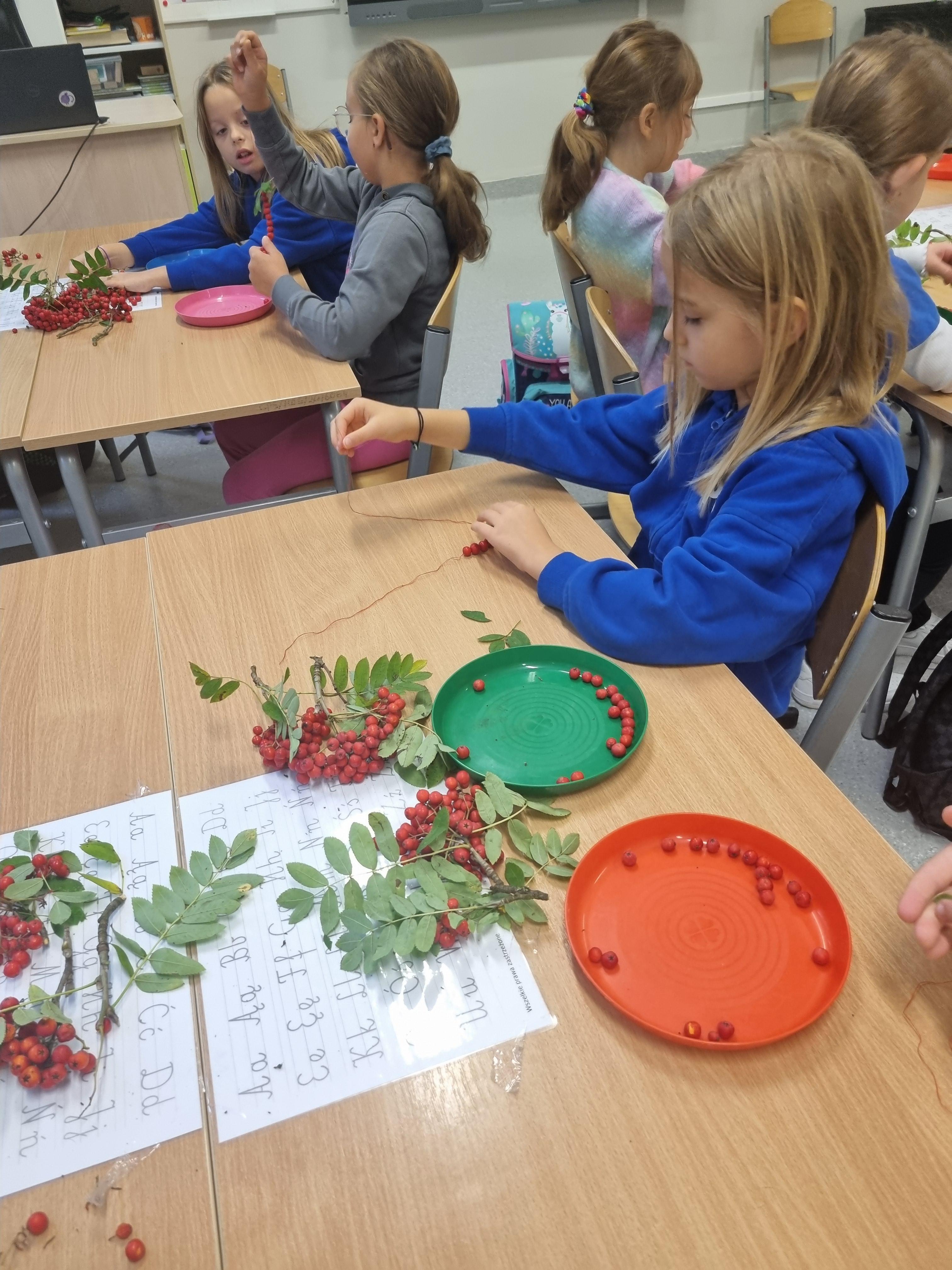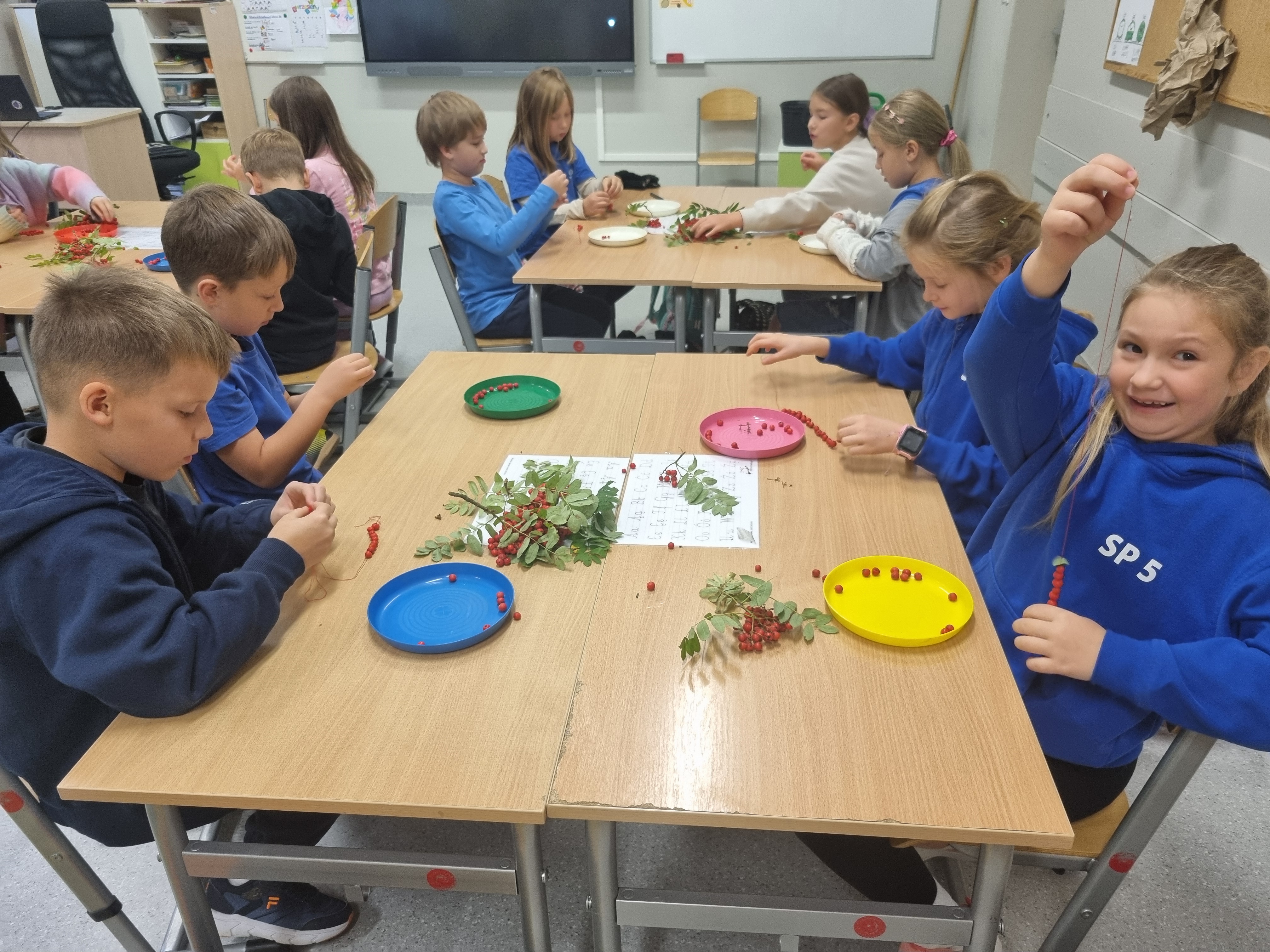 Pod koniec lekcji klasa 2b wyglądała niezwykle kolorowo. Niektórzy przygotowali klasyczne naszyjniki, inni bransoletki, a jeszcze inni postanowili stworzyć długie girlandy, które ozdobią naszą salę.Teraz nasze korale będą powoli wysychać, przypominając nam o tym słonecznym, jesiennym dniu. Zapraszamy do obejrzenia fotorelacji poniżej!