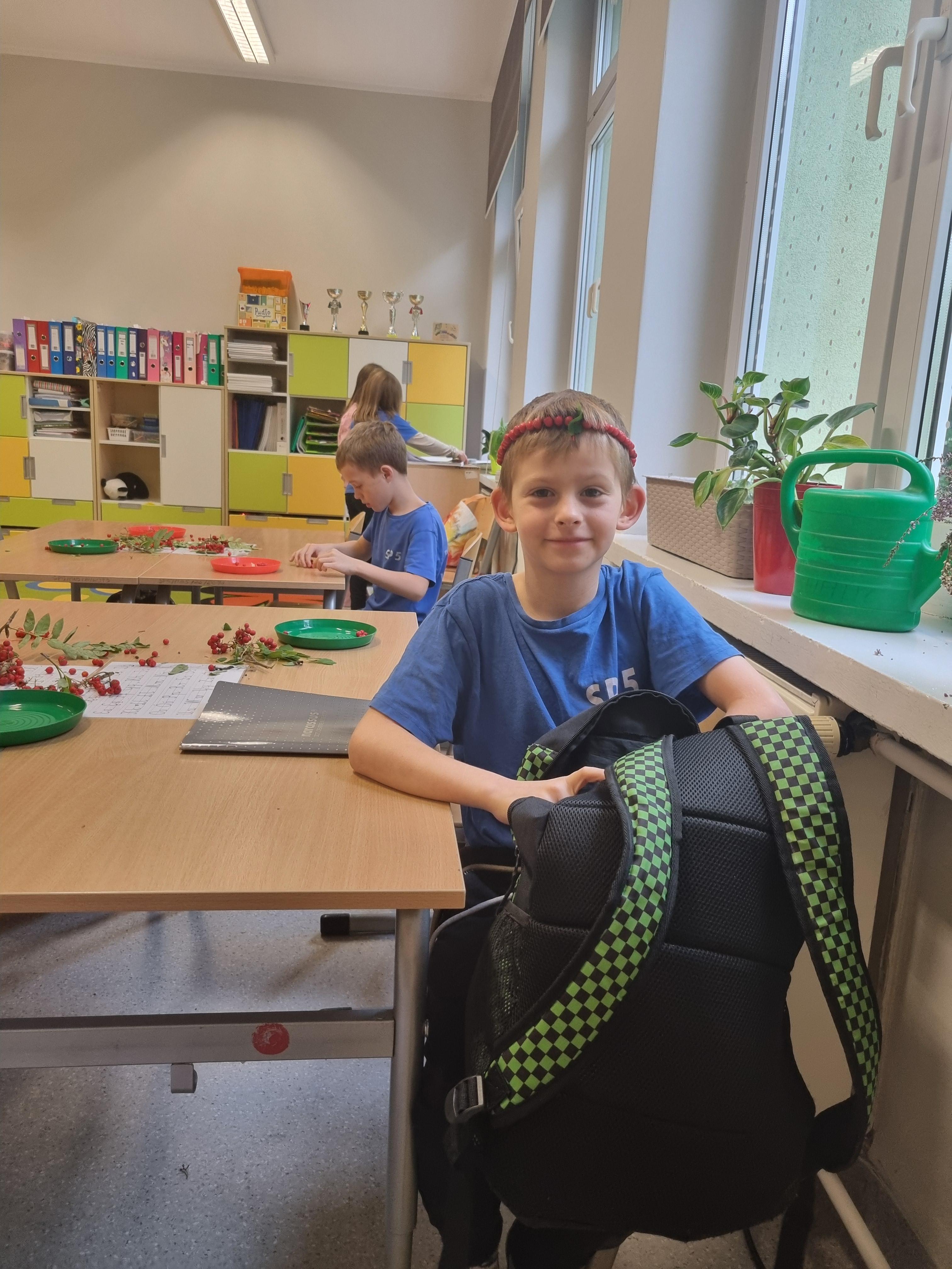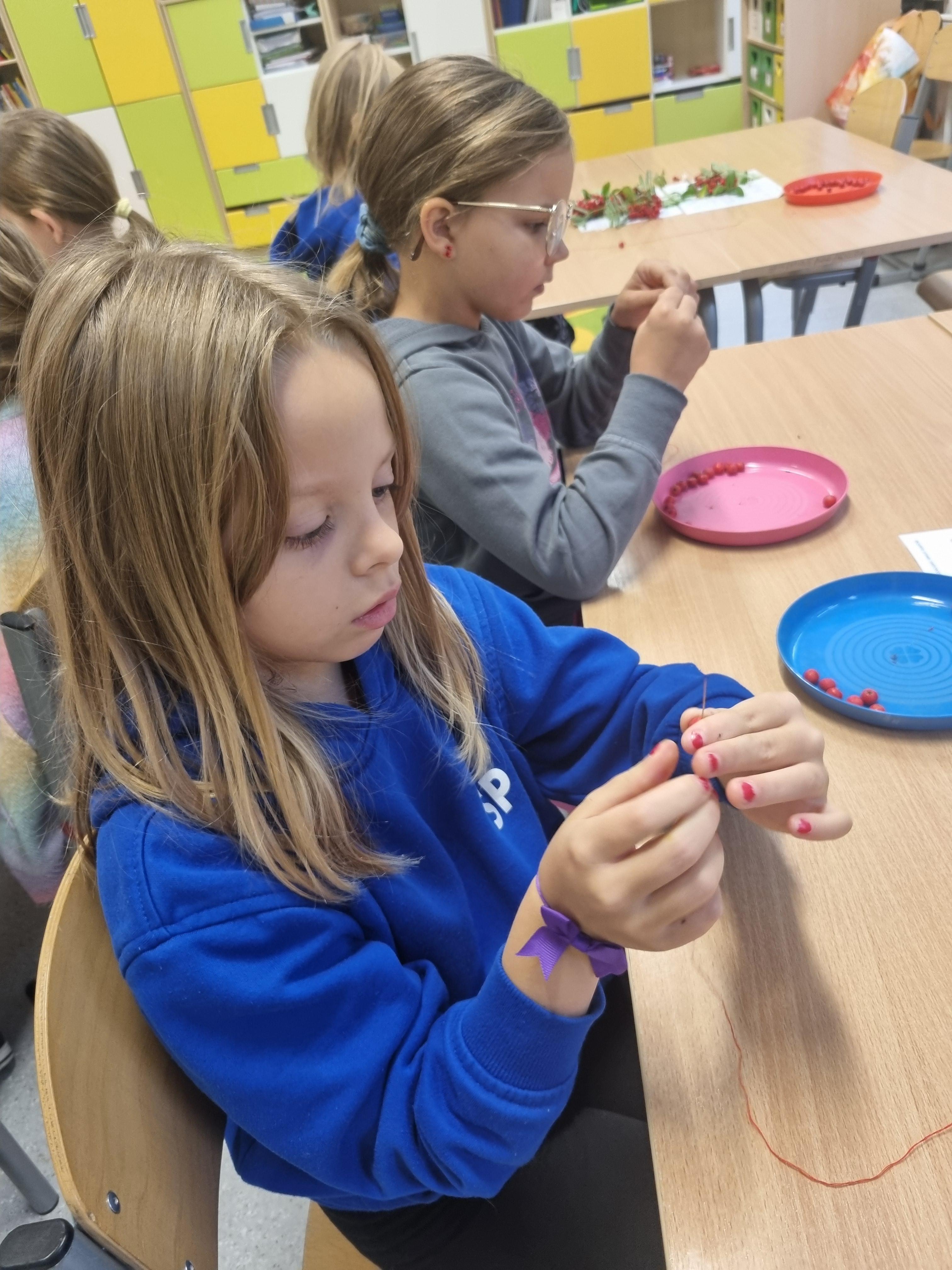 Jesień zawitała do naszej szkoły nie tylko w kalendarzu, ale i w szkolnych ławkach! W minionym tygodniu sala klasy 2b zamieniła się w prawdziwą manufakturę biżuterii. Zamiast drogich kamieni i pereł, na stołach królowały dary natury – intensywnie czerwone owoce jarzębiny. Zadanie wcale nie było takie proste, na jakie wyglądało. Każdy uczeń otrzymał igłę, mocny sznurek i miseczkę pełną jesiennych skarbów. Trzeba było wykazać się nie lada skupieniem i sokolim wzrokiem, aby trafić igłą w sam środek twardego owocu. "Na początku igła trochę uciekała, ale po dziesiątym koraliku szło mi już jak prawdziwemu jubilerowi!" – relacjonuje jeden z uczniów. Praca z jarzębiną to nie tylko zabawa, ale też ważna lekcja: