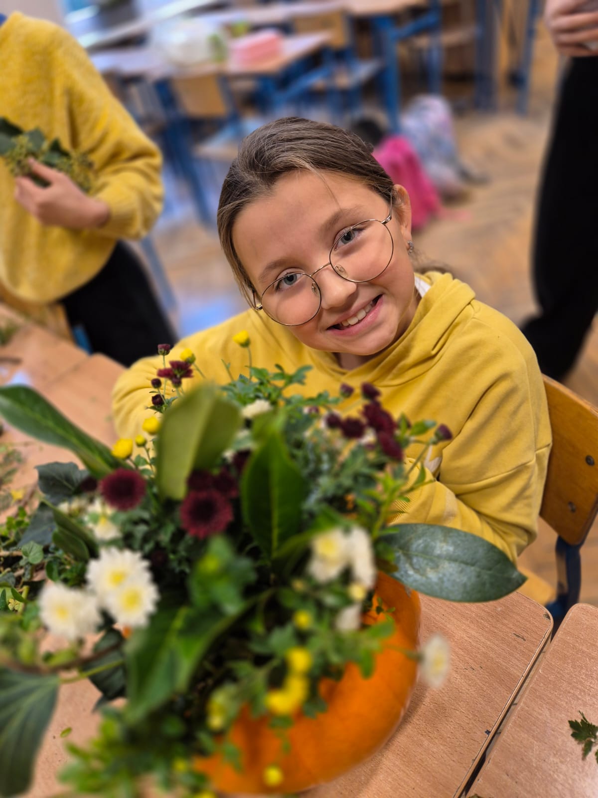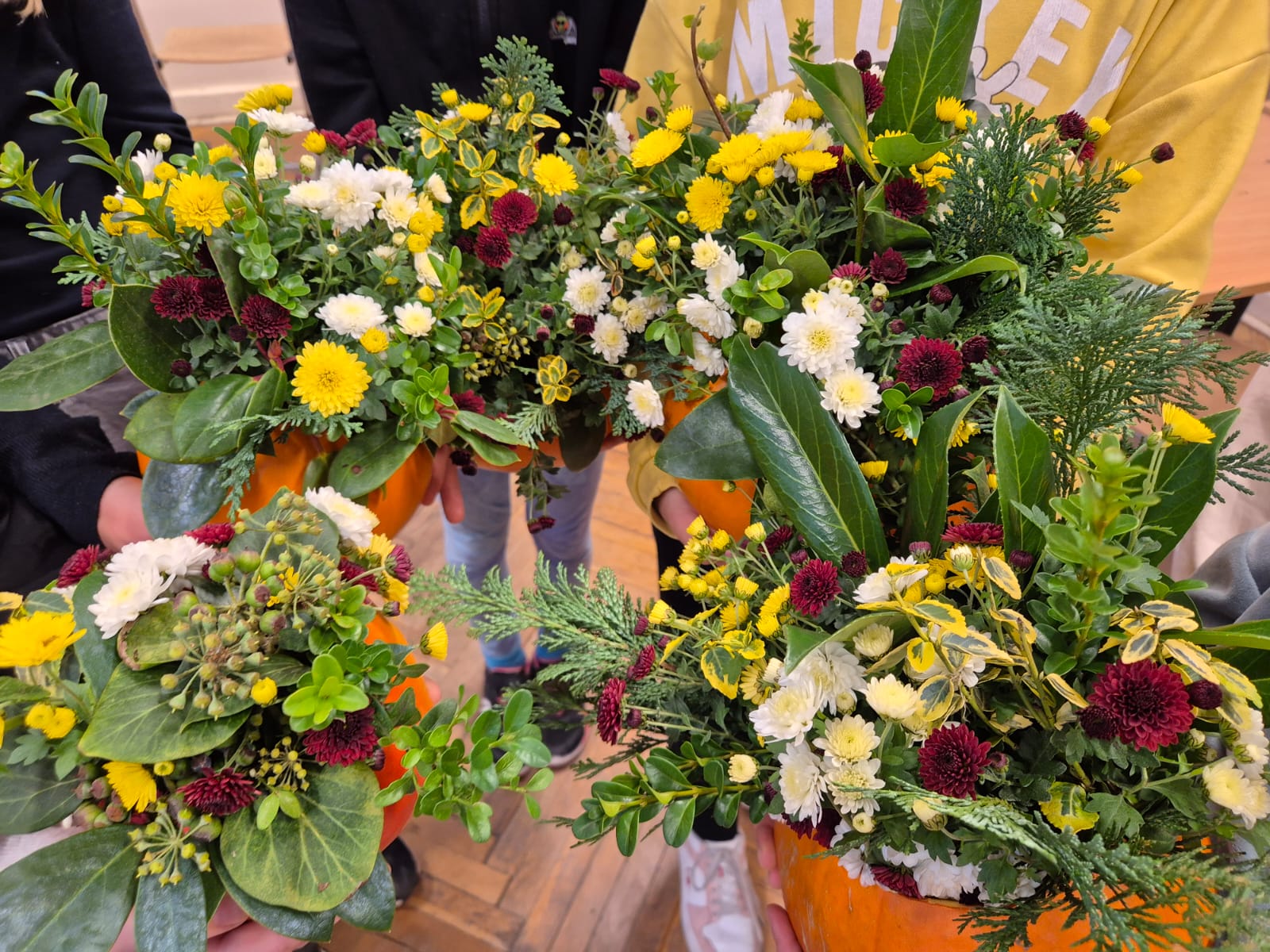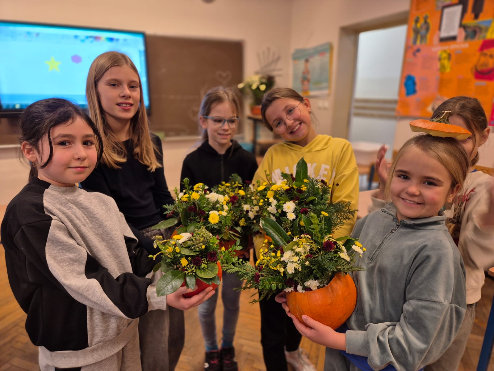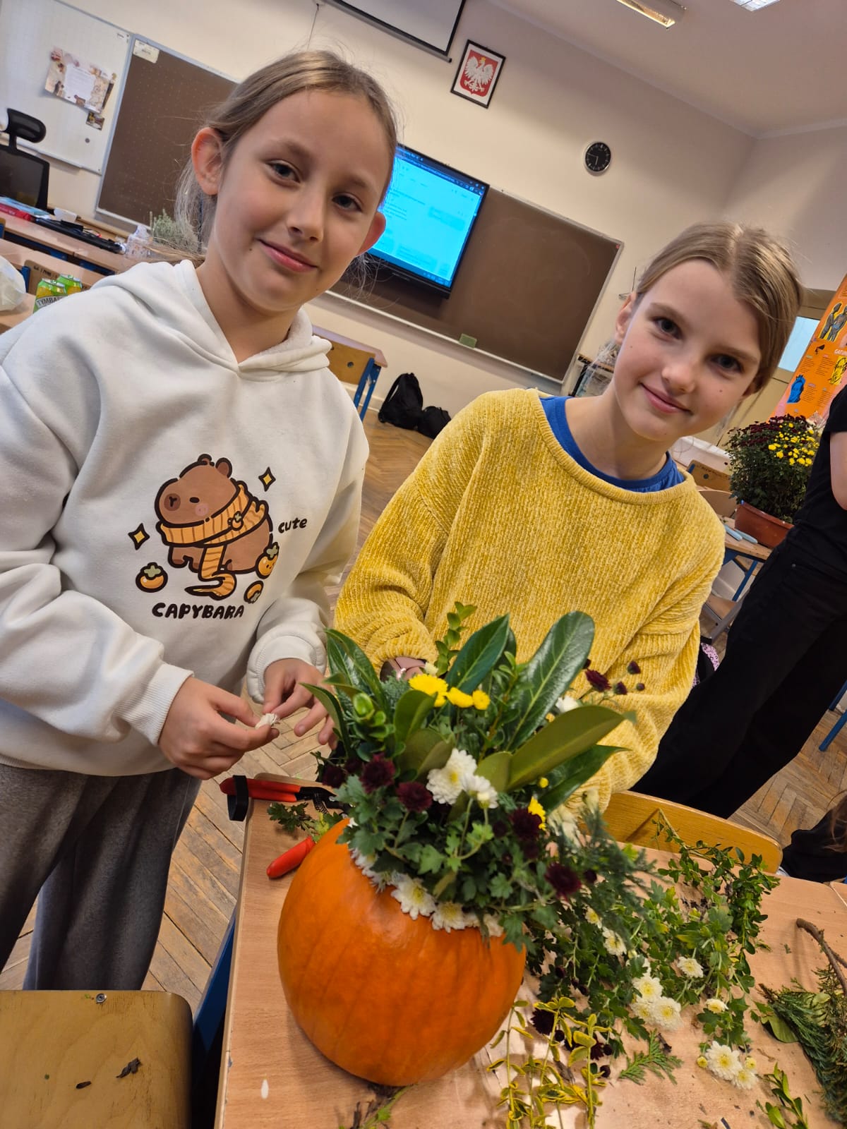Dziś na zajęciach florystycznych zawitala jesień w pełnej prasie- z gałązek, liści i jesiennych kwiatów powstały kompozycje w dyniach.