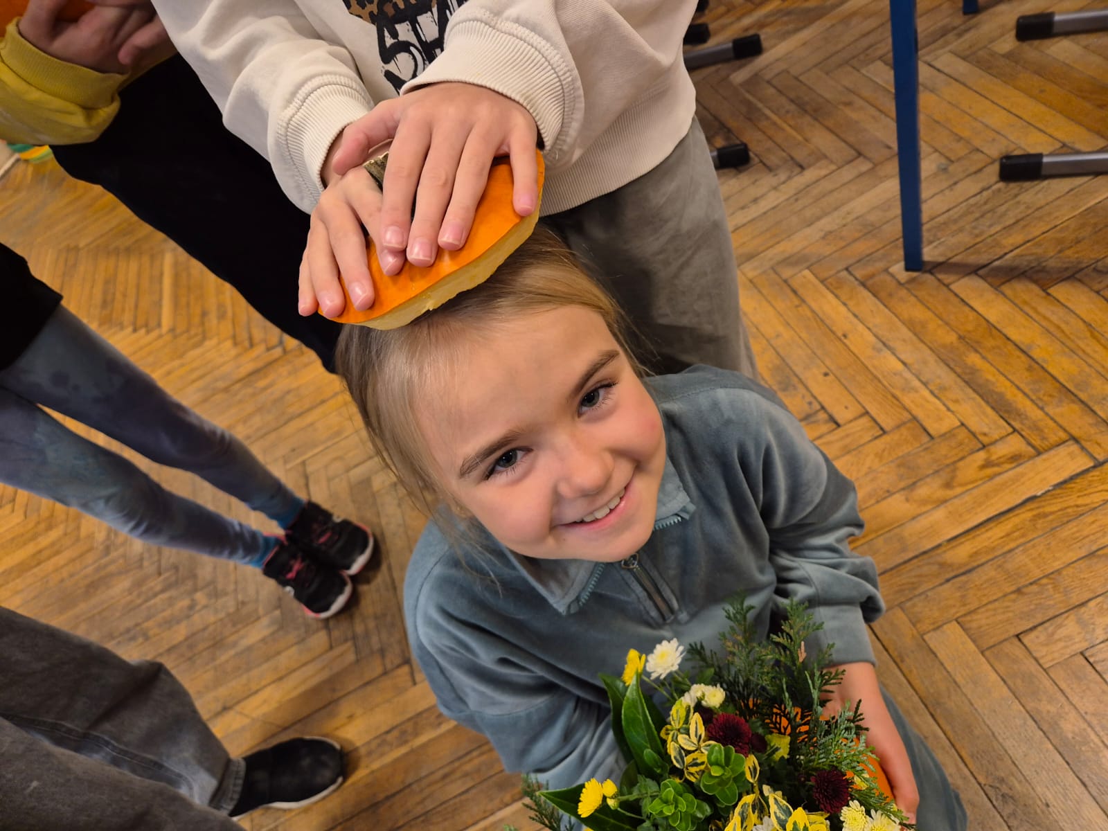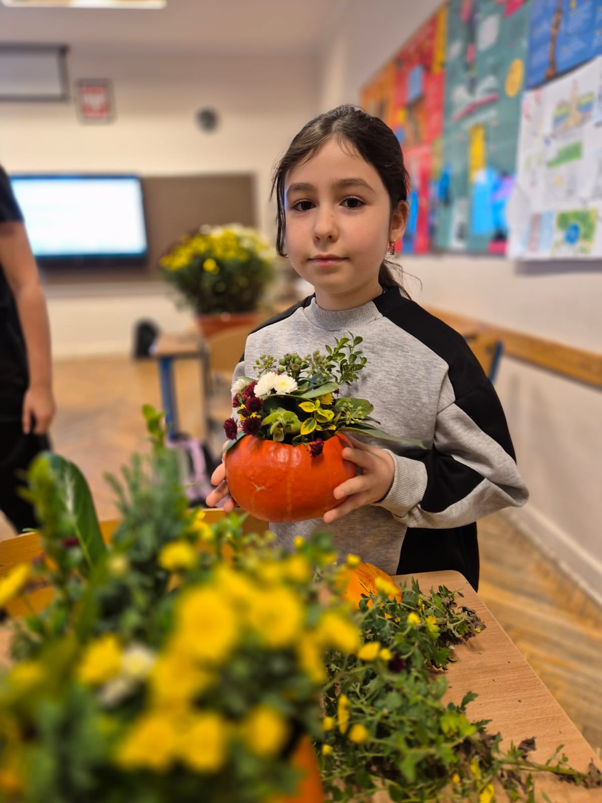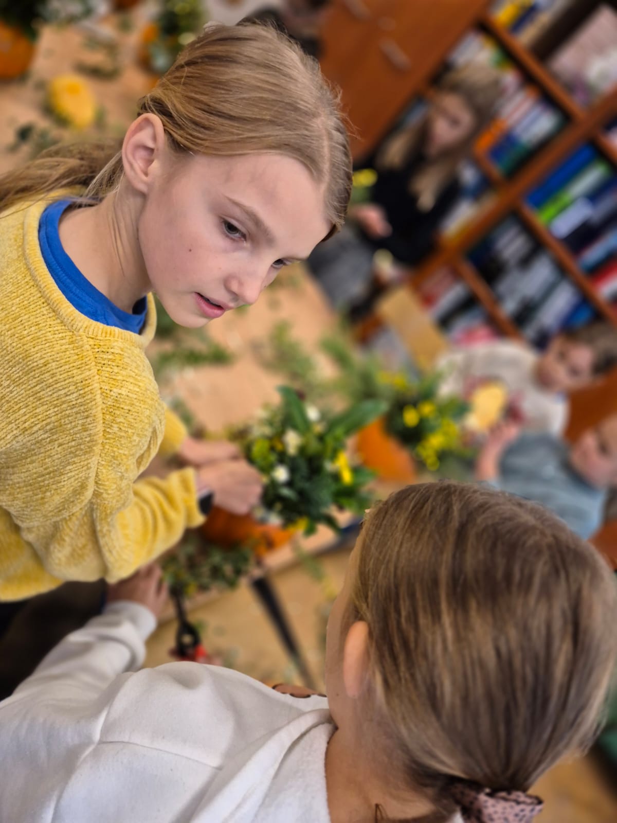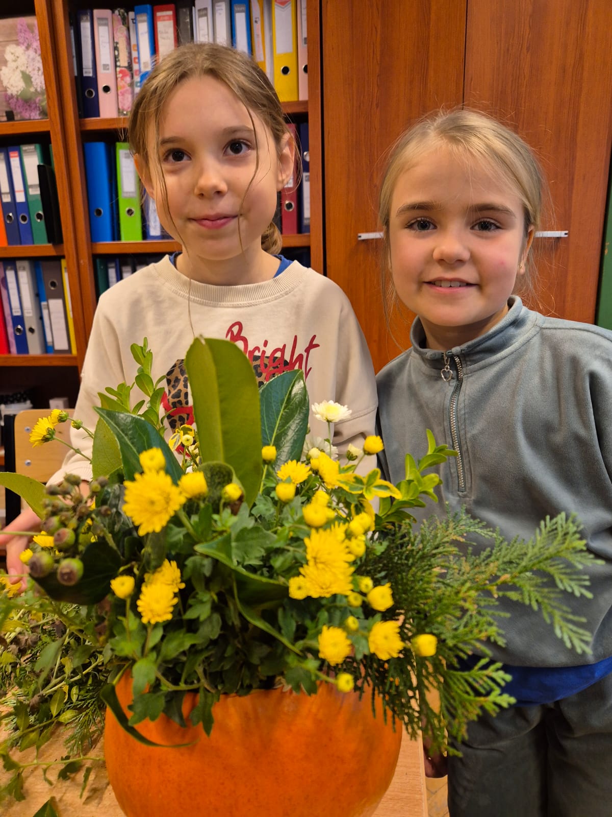 Dziś na zajęciach florystycznych zawitala jesień w pełnej prasie- z gałązek, liści i jesiennych kwiatów powstały kompozycje w dyniach.