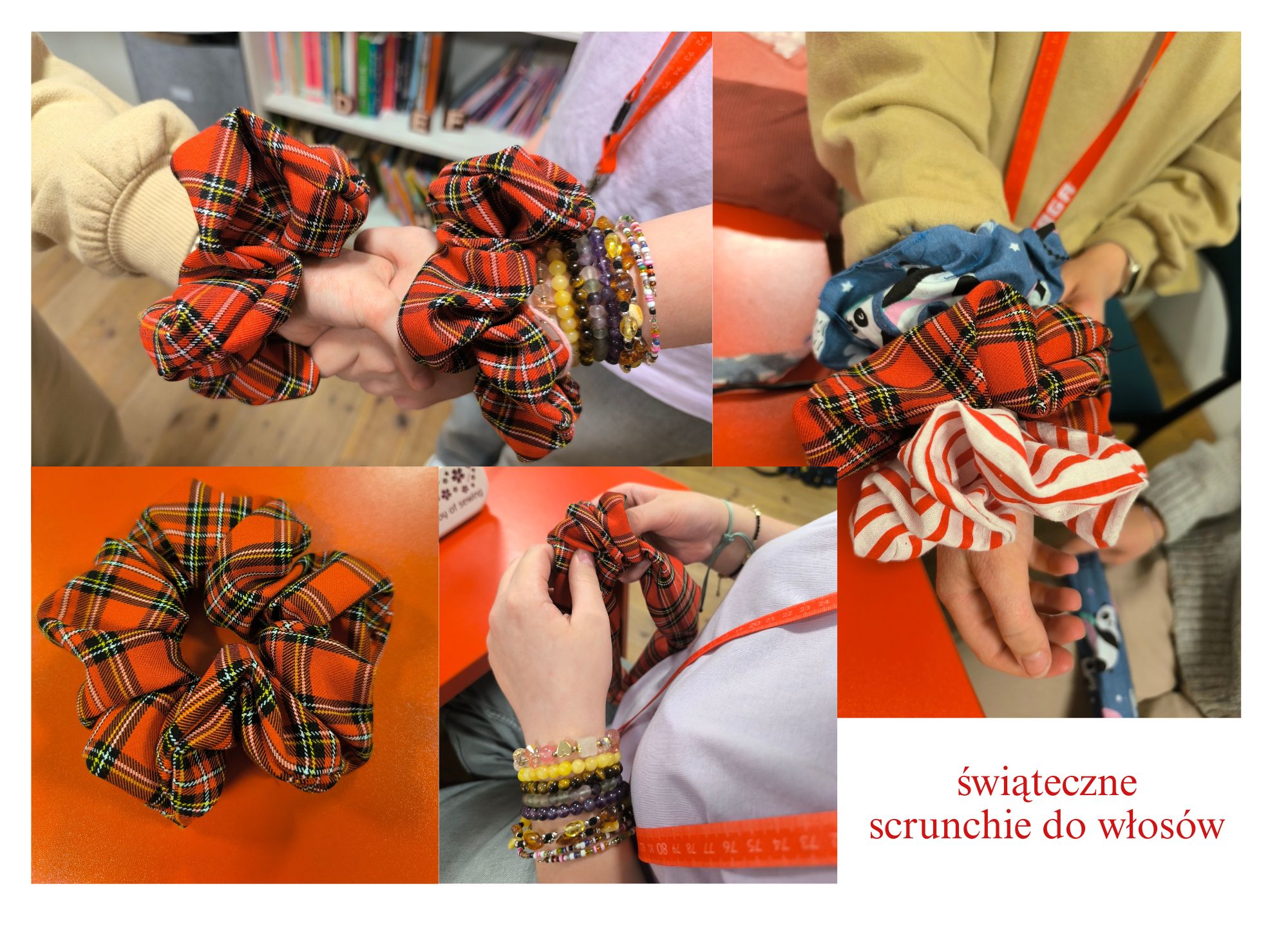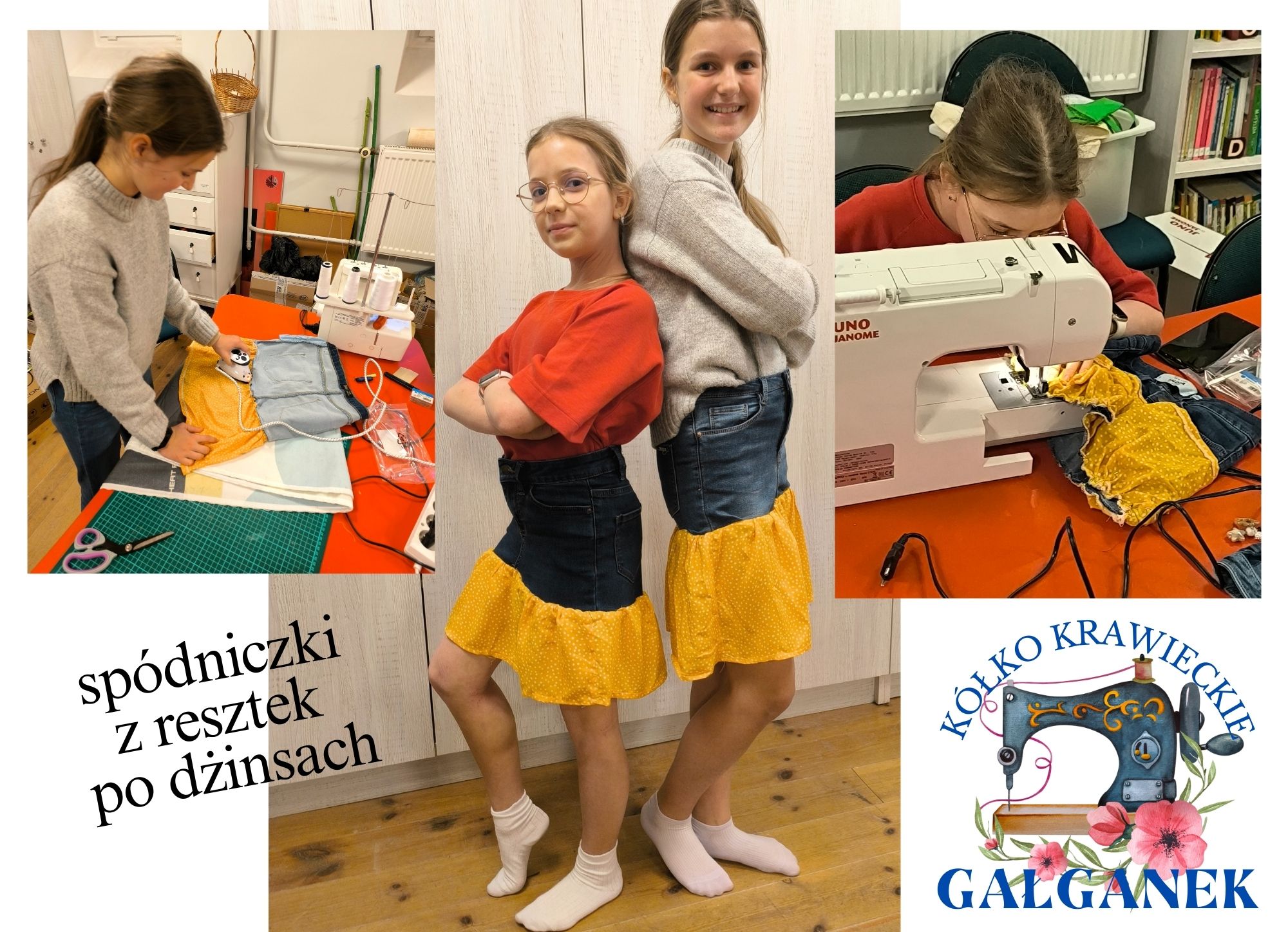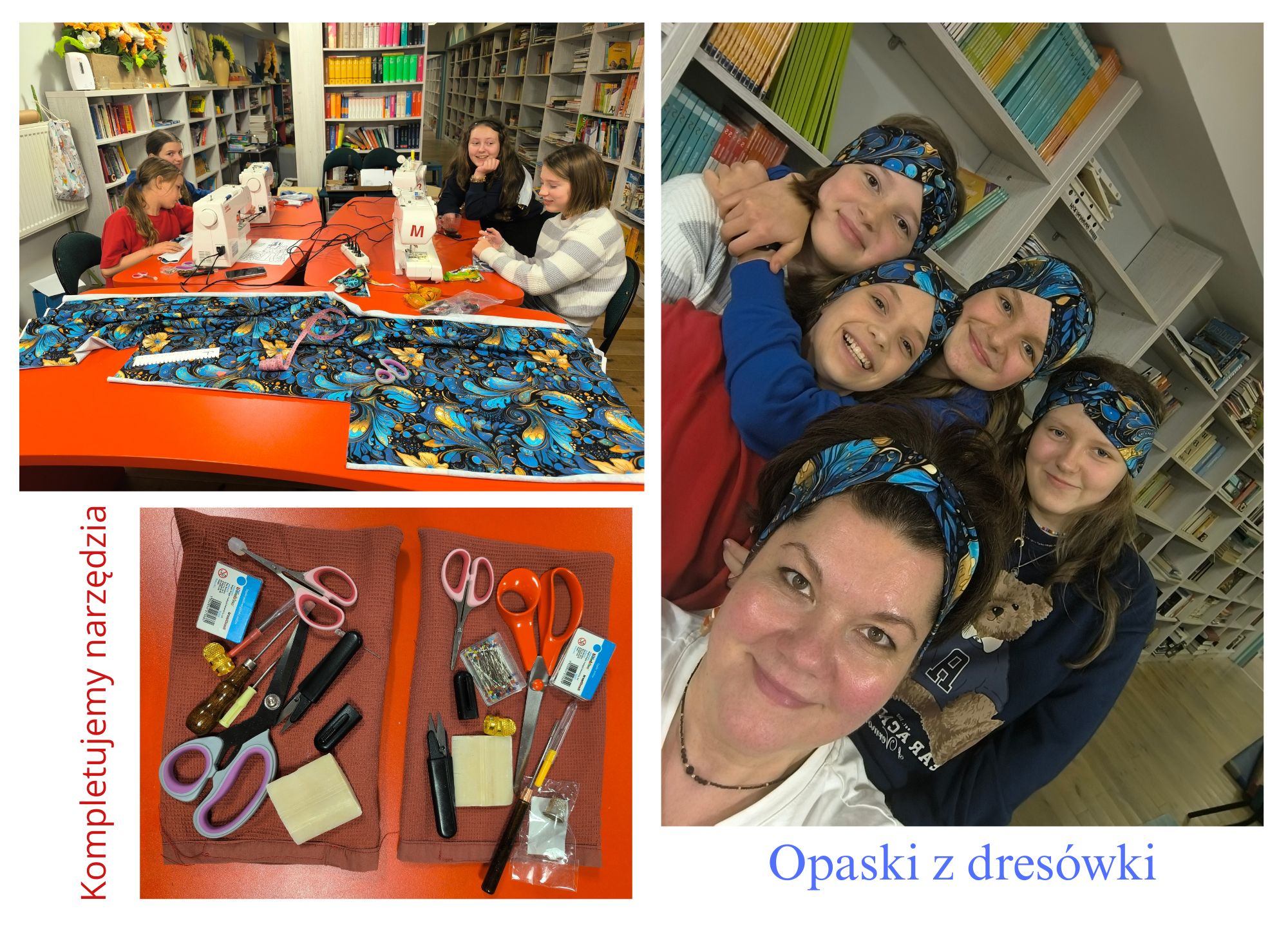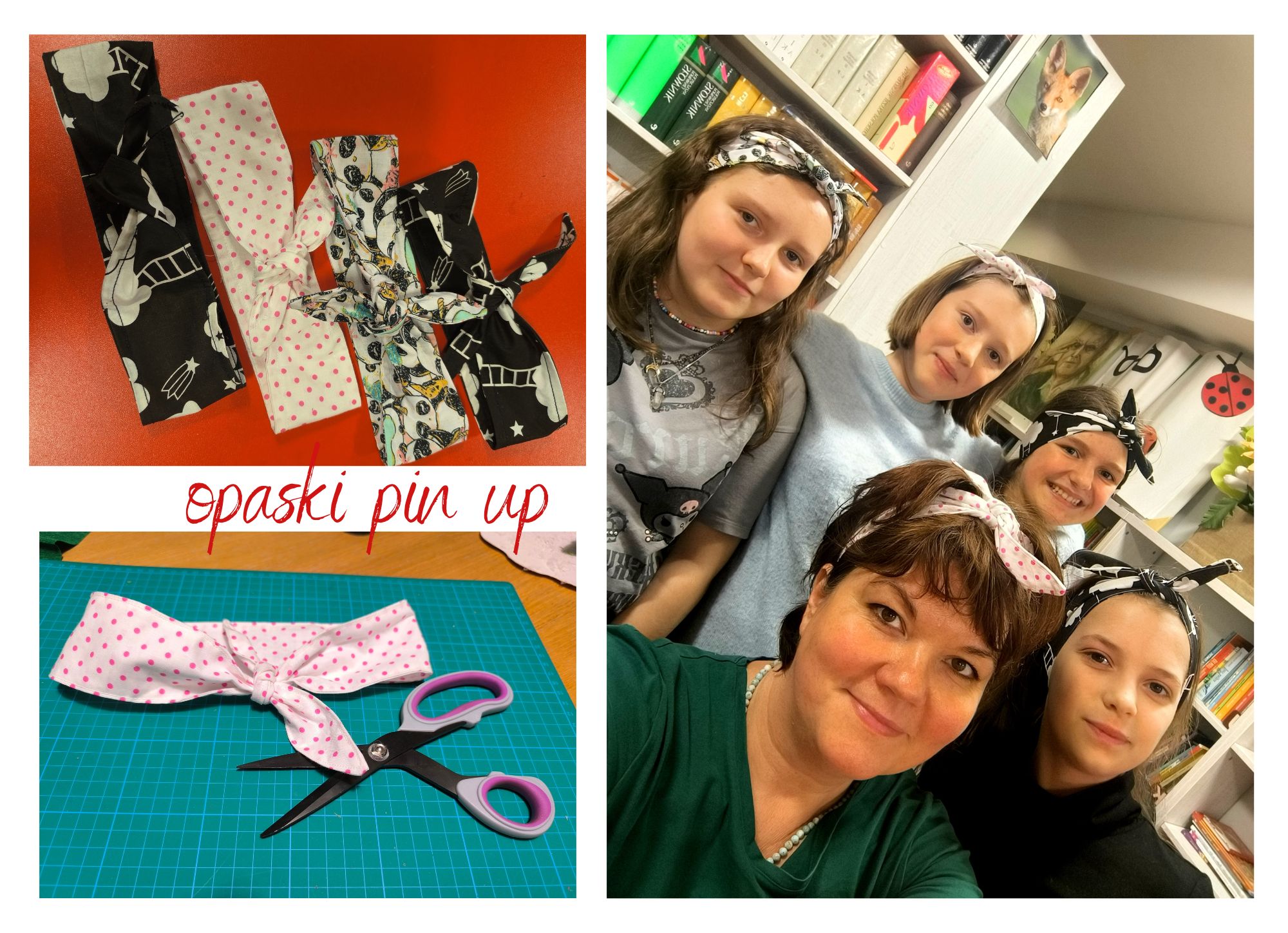 GAŁGANKOWE krawcowe, tj. Maja, Julia, Marysia i Tosia weszły na kolejny stopień szyciowego wtajemniczenia. Dziewczynki kontynuowały przerabianie starych spodni dżinsowych. Tym razem przerobiły je na spódniczki doszywając żółtą falbankę. Potem uszyły zwykły bawełniany worek, ponieważ okazało się, że zwykła reklamówka jest mało elegancka i brakuje czegoś do przechowywania nieskończonych "uszytków". Kompletowanie podstawowych akcesoriów krawieckich, jak nożyce, obcinaczki, prujki, miarka... także było motywacją do uszycia małego woreczka - piórnika. Uwaga - nowe umiejętności: mierzenie materiału i krojenie, marszczenie materiału, przyszywanie rzepa, rozprasowywanie szwów, przeciąganie gumki. Absolutnych hitem było pozyskanie 250! skrojonych opasek w stylu pin -up. Widać na zdjęciach jak nam w nich do twarzy! Szycie opasek tak się dziewczynkom spodobało, że przychodziły przed lekcjami do biblioteki, wyciągały maszyny do szycia i uparcie szyły kolejne opaski na prezenty. Dresówka pętelka to tkanina, która także bardzo przypadła młodym krawcowym do gustu. Wyczarowały z niej opaski na zimę. Na ostatnich zajęciach zdecydowanie królowała tkanina w szkocką kratkę. Popularny świąteczny print posłużył do uszycia gumki do włosów czyli scrunchie, która udekoruje fryzury na święta.
