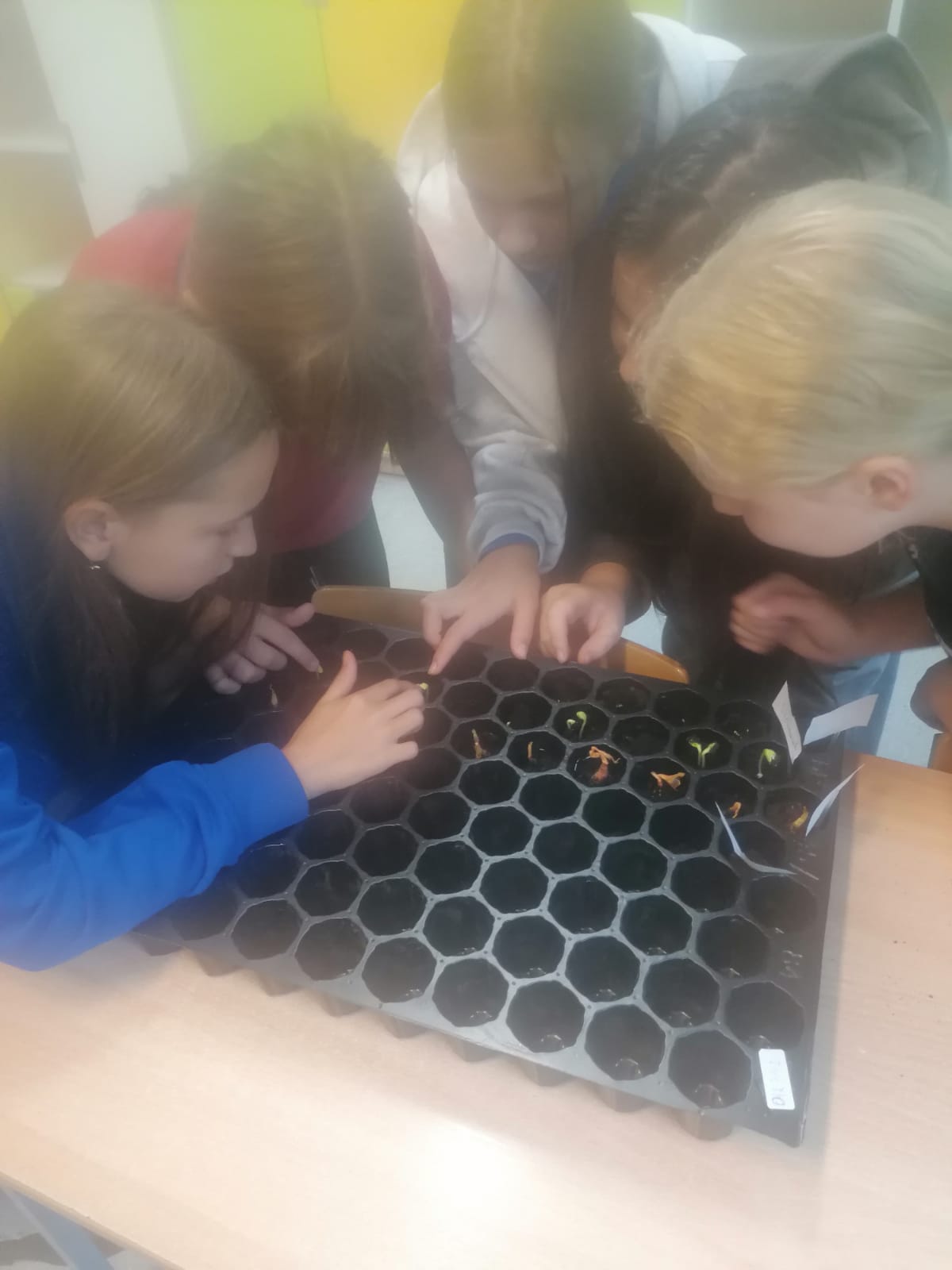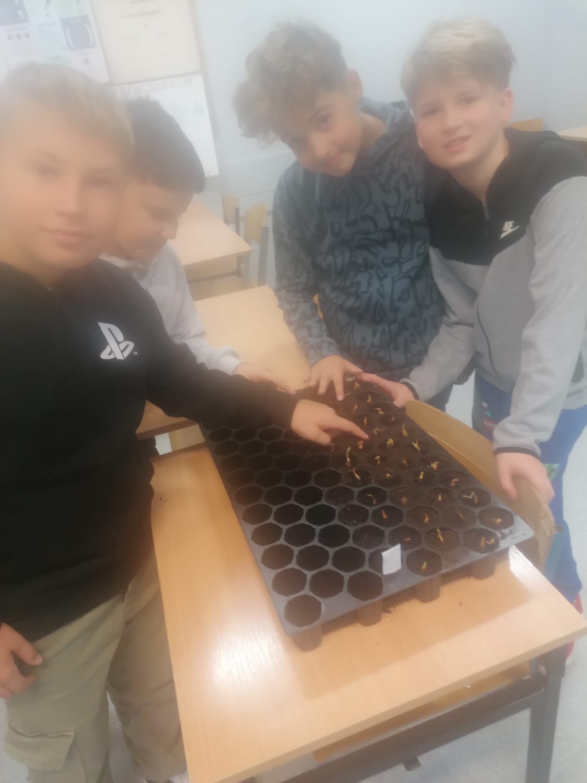 I tak krok po kroku uczniowie na kole pogrodnika posadzili cebule, bazylie, słonecznik, marchewkę. I na efekty pracy nie czekaliśmy długo, dziś widzimy gołym okiem naszą pracę.