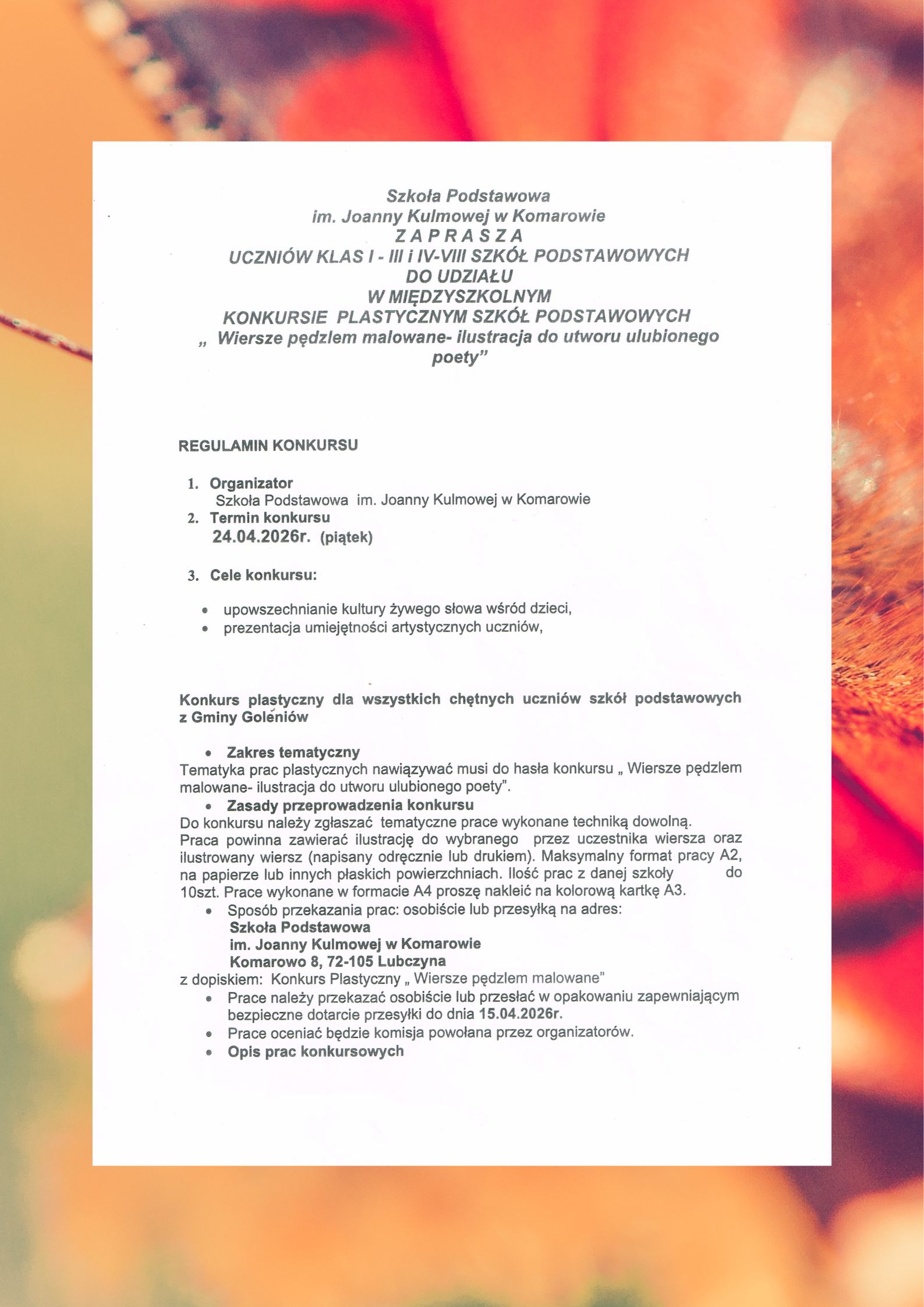 Prace plastyczne klas I-III przynosimy do sali nr 17 do dnia 10 kwietnia.