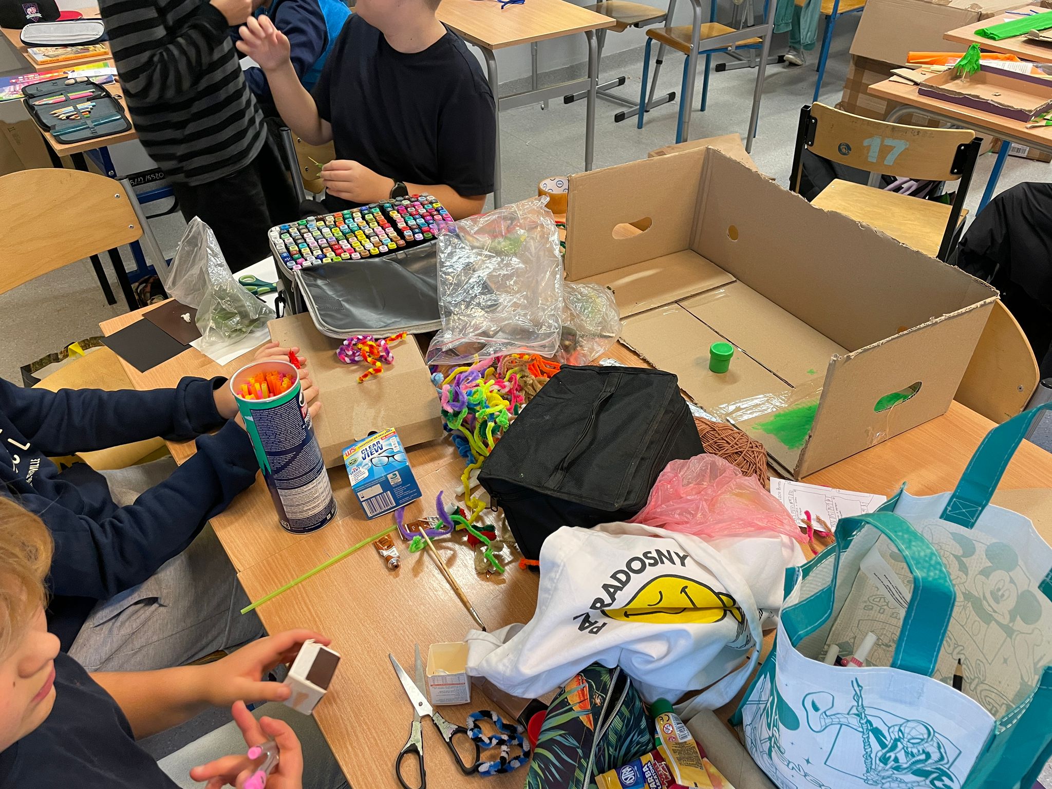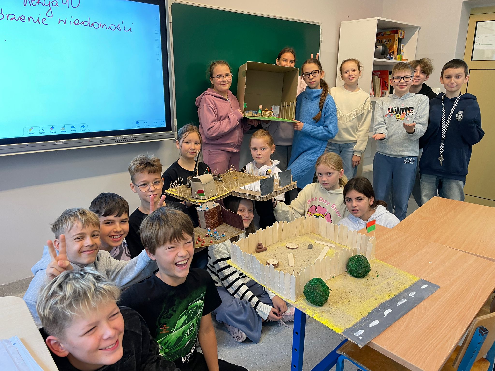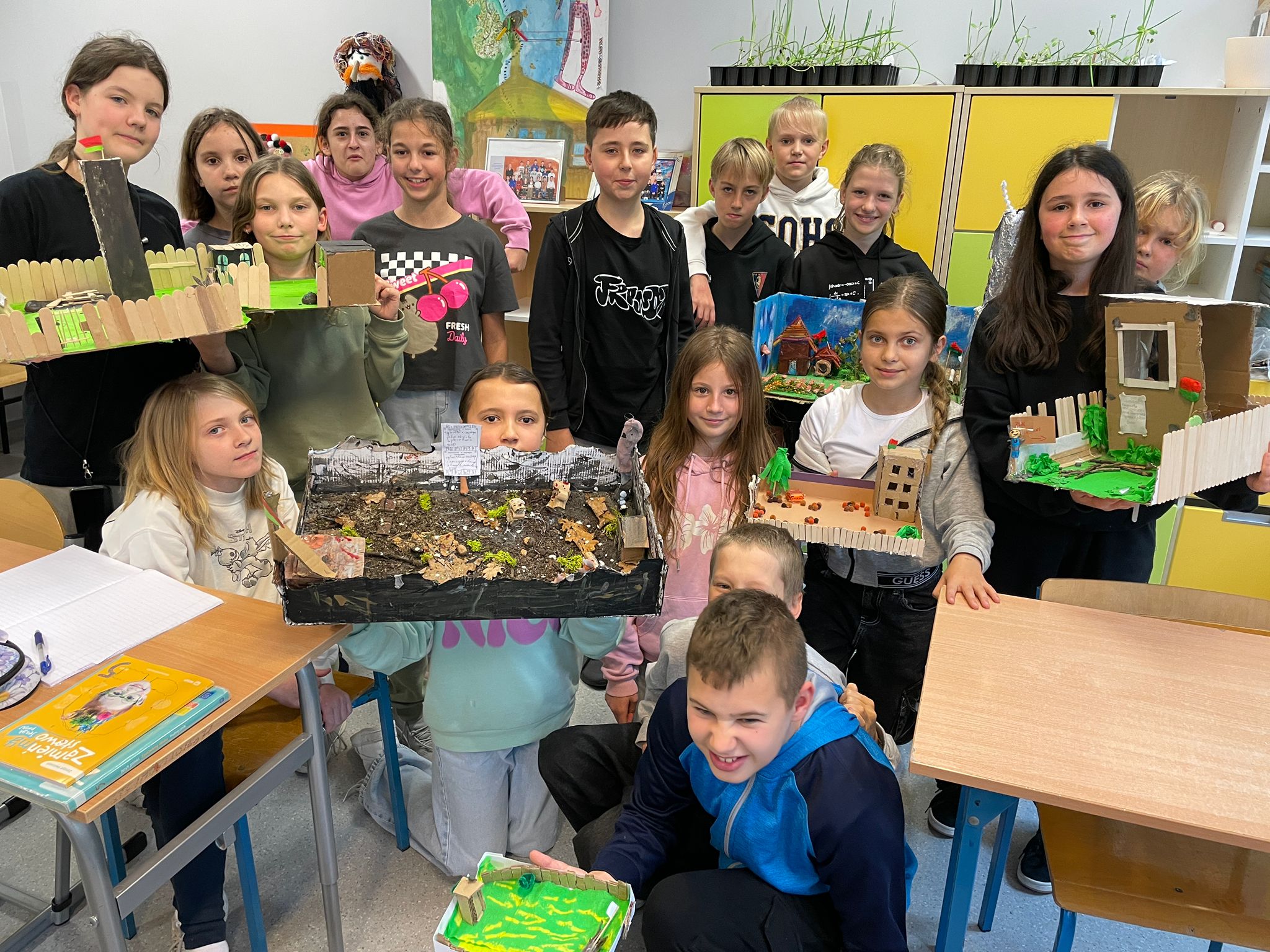" Chłopcy z Placu Broni" Ferenca Molnara to jedna z książek, która od lat zajmuje stałe miejsce na leście lektur obowiązkowych. Zadaniem uczniów było wykonanie makiety prezentującej Plac Broni. Piątoklasiści stworzyli świetne prace stanowiące wierne odwzorowanie tego miejsca. Każda makieta zawierała m. in.: sągi drewna, tartak,budkę, w której mieszkał Słowak pilnujący placu, flagę czy okoliczne kamienice. Nie zabrakło przedstawicieli czerwonych koszul czy obrońców Placu Broni. Na koniec uczniowie napisali ogłoszenie o zbiórce bohaterów książki Molnara. Do wykonania makiet piątoklasistom posłużyły m. in.:kamienie, gałązki, piasek, ziemia, patyczki po lodach, kwkałki drewna, plastelina czy pudełka