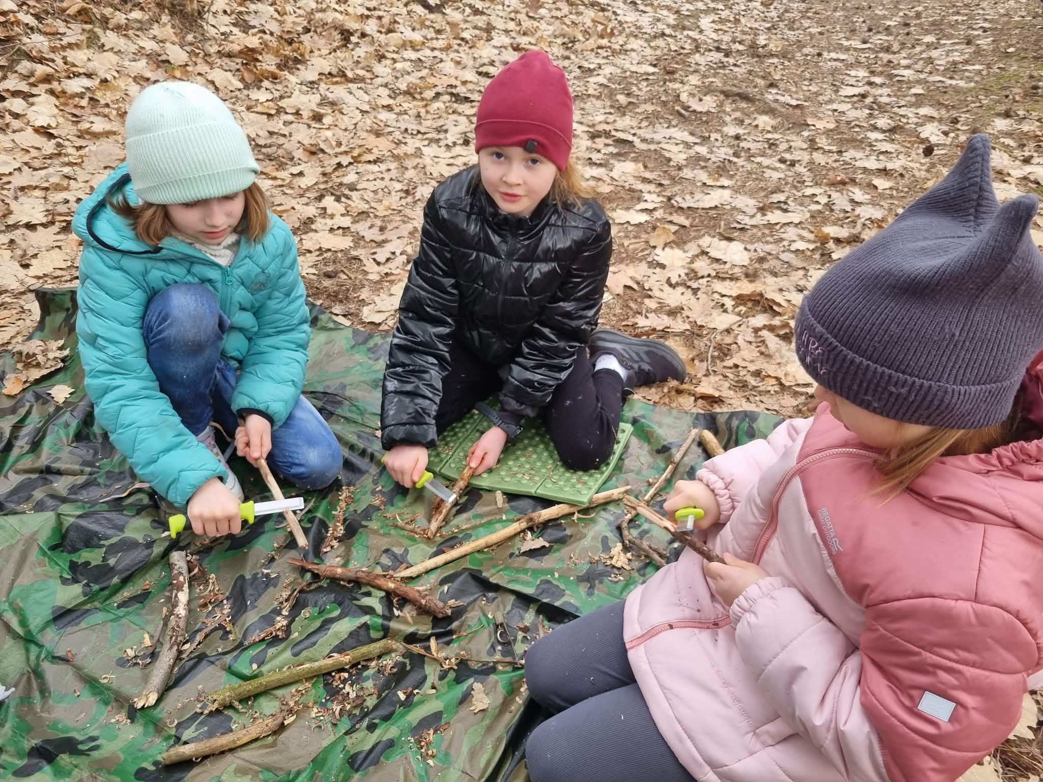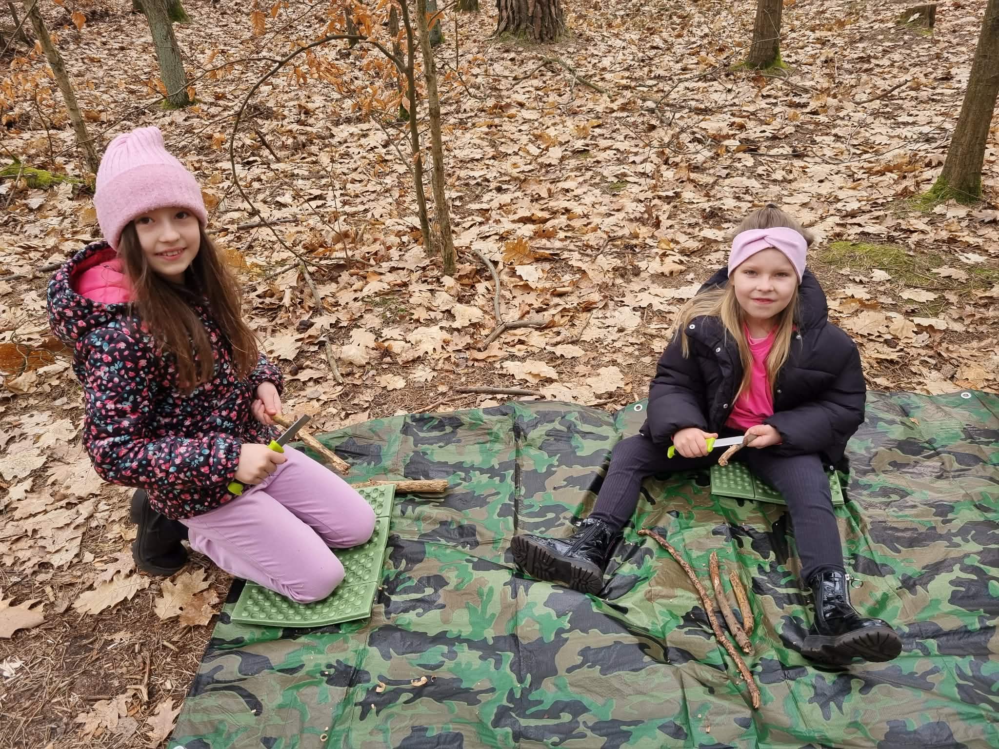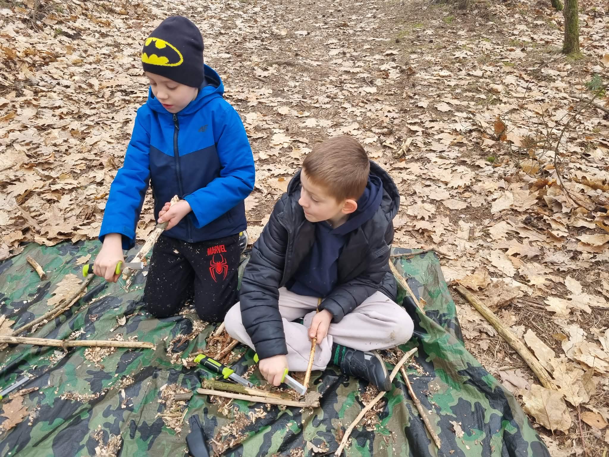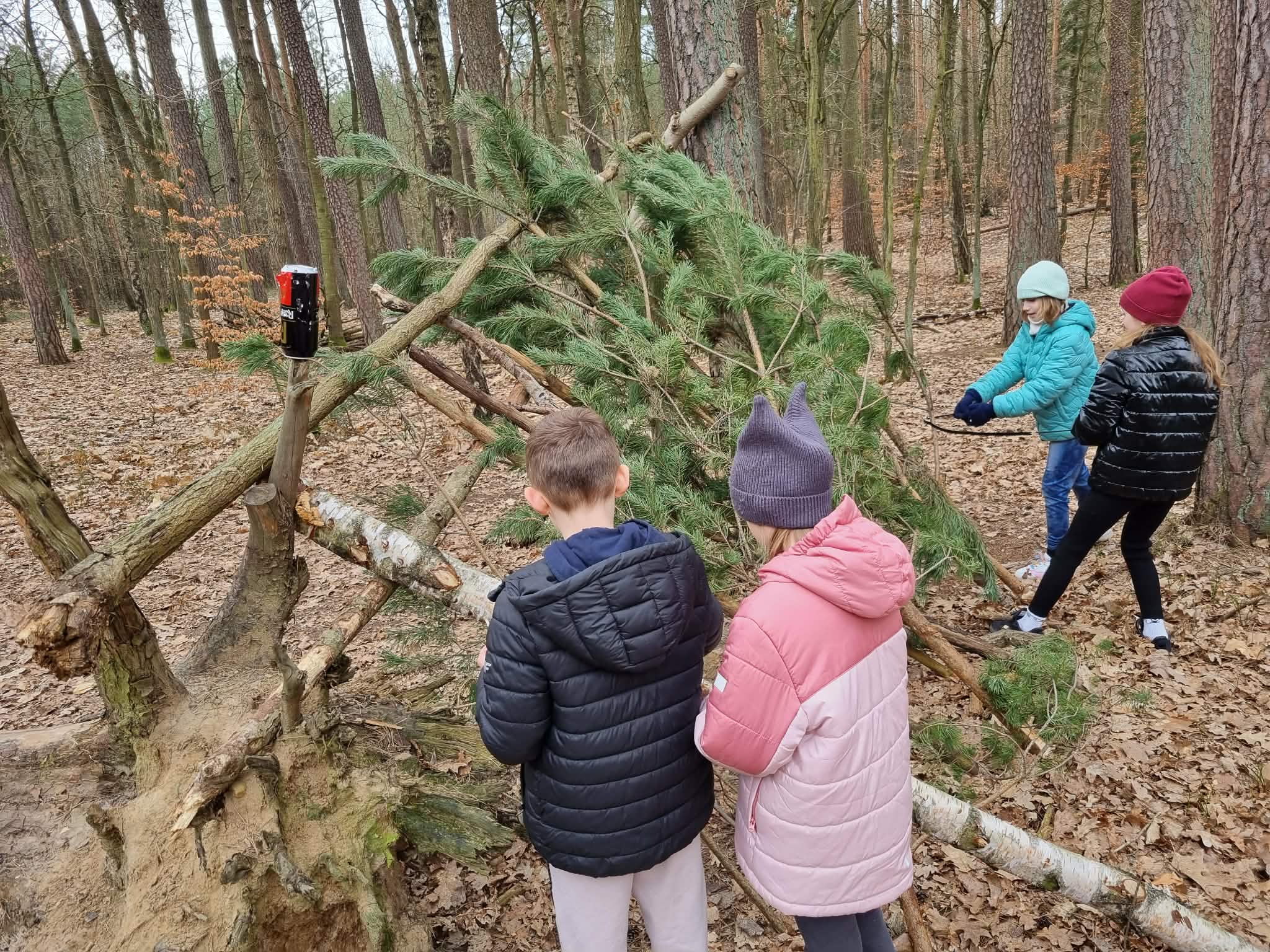 Sztuka rzemiosła leśnego: Uczniowie budowali szałas, który mógłby służyć za schronienie, oraz bezpiecznie strugali patyki.