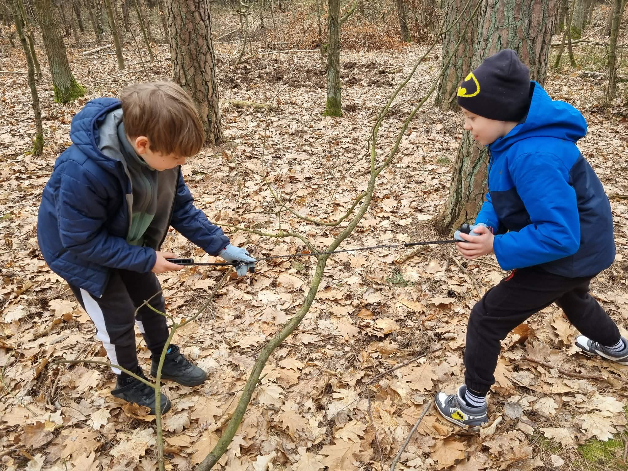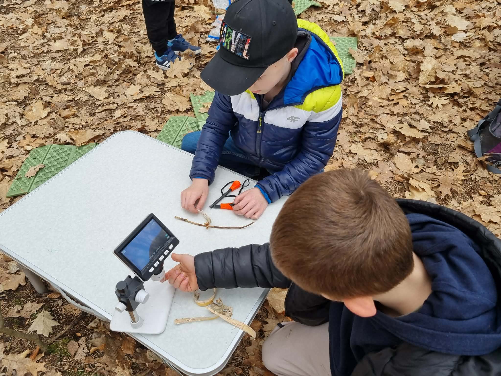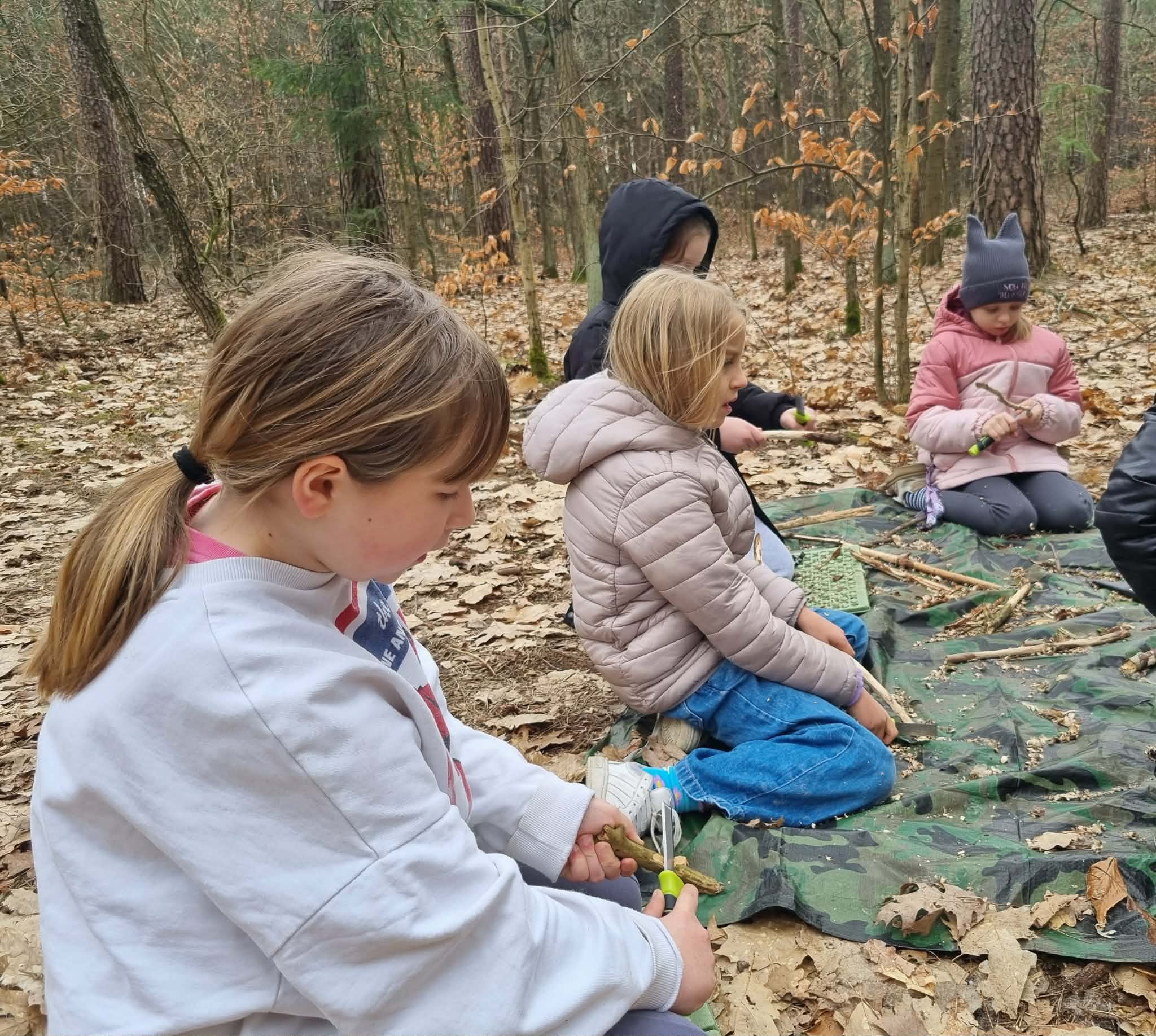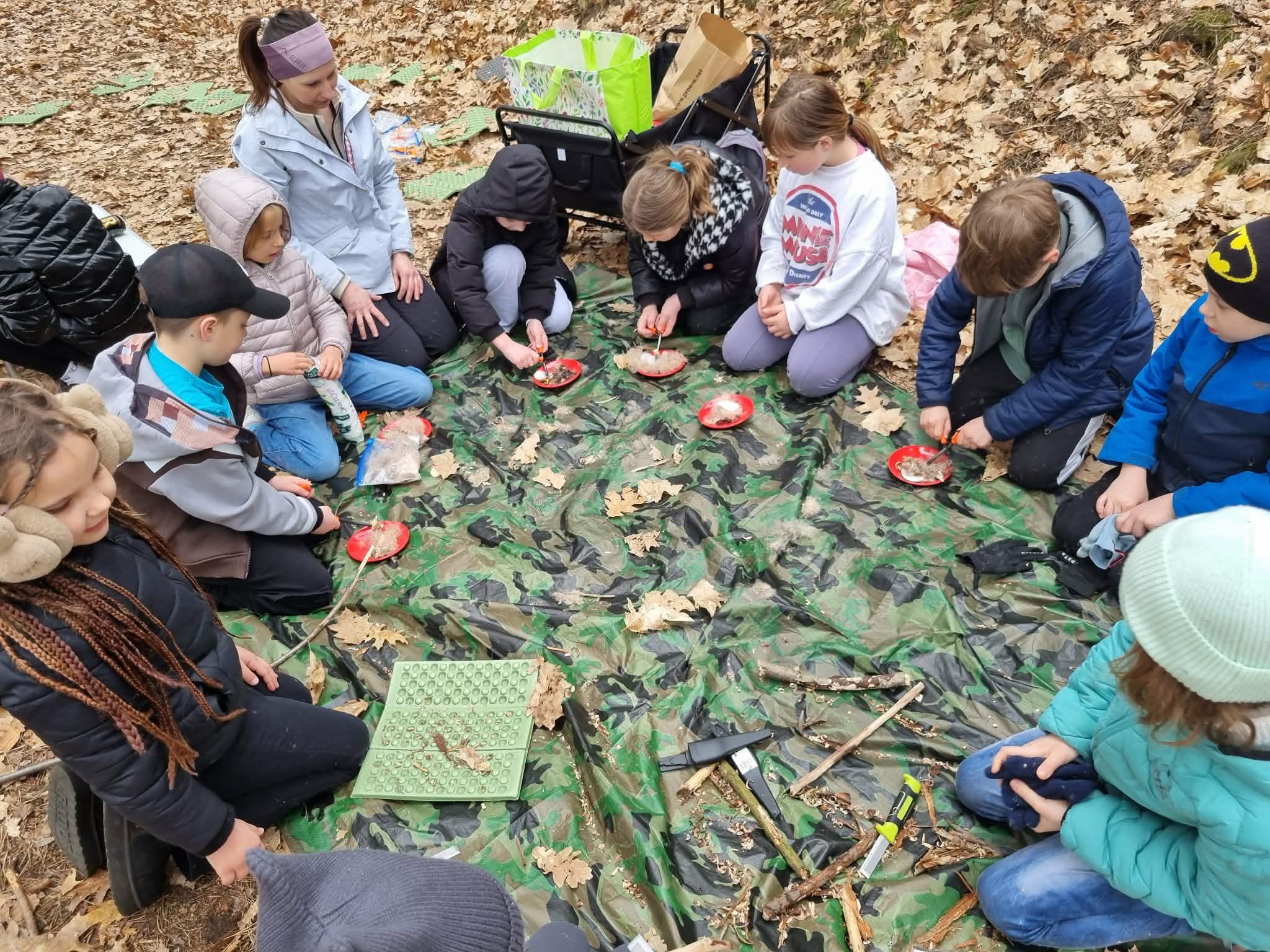 Sztuka rzemiosła leśnego: Uczniowie budowali szałas, który mógłby służyć za schronienie, oraz bezpiecznie strugali patyki.
