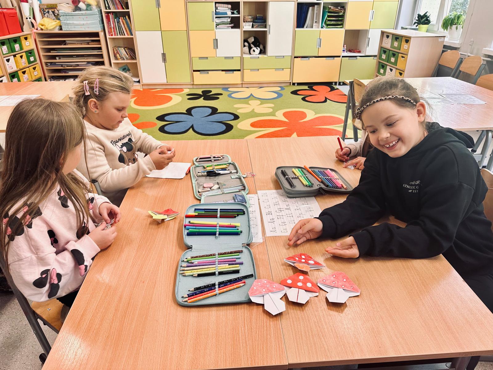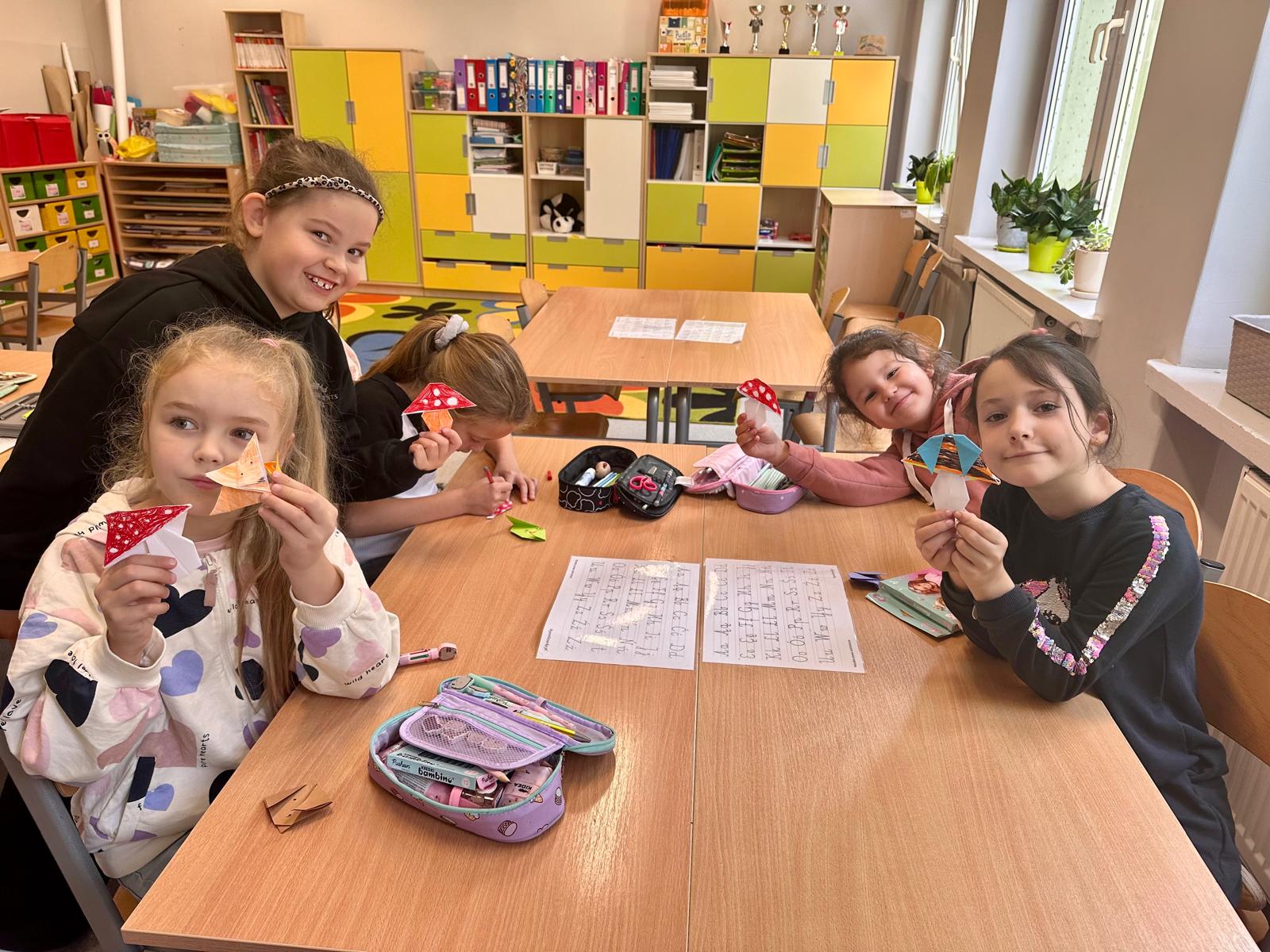 Na zajęciach koła origami 01.10. 25 r. uczniowie klasy 1a wykonali z papieru leśne grzybki - muchomorki. Praca plastyczna była kolejną okazją do rozwijania zdolności manualnych, dokładności i cierpliwości. Każdy uczeń miał możliwość ozdobienia swojego muchomorka według własnego pomysłu - dodając białe kropki lub kolorując go na brązowo jako borowika szlachetnego. Gotowe prace uczniowie zabrali do domu aby stworzyć kolorową leśną wystawę i pochwalić się swoim rodzicom ze swoich nowo poznanych umiejętności.