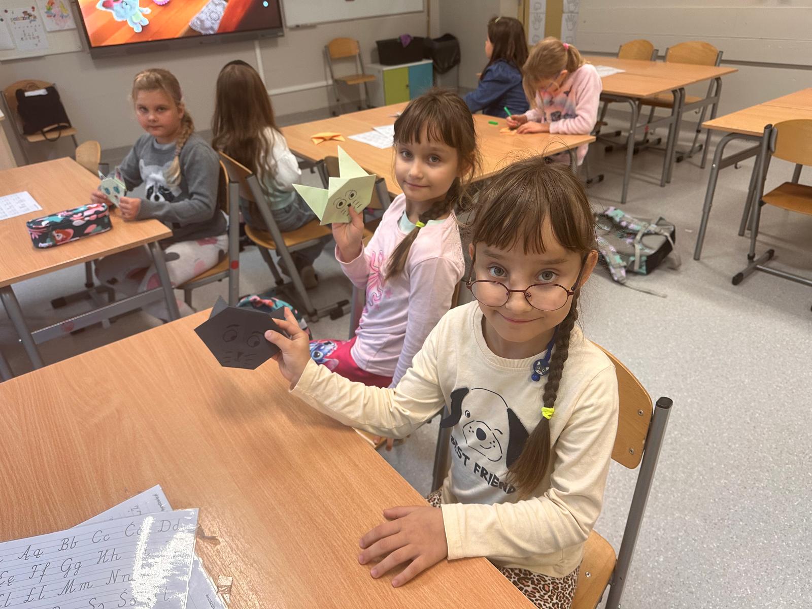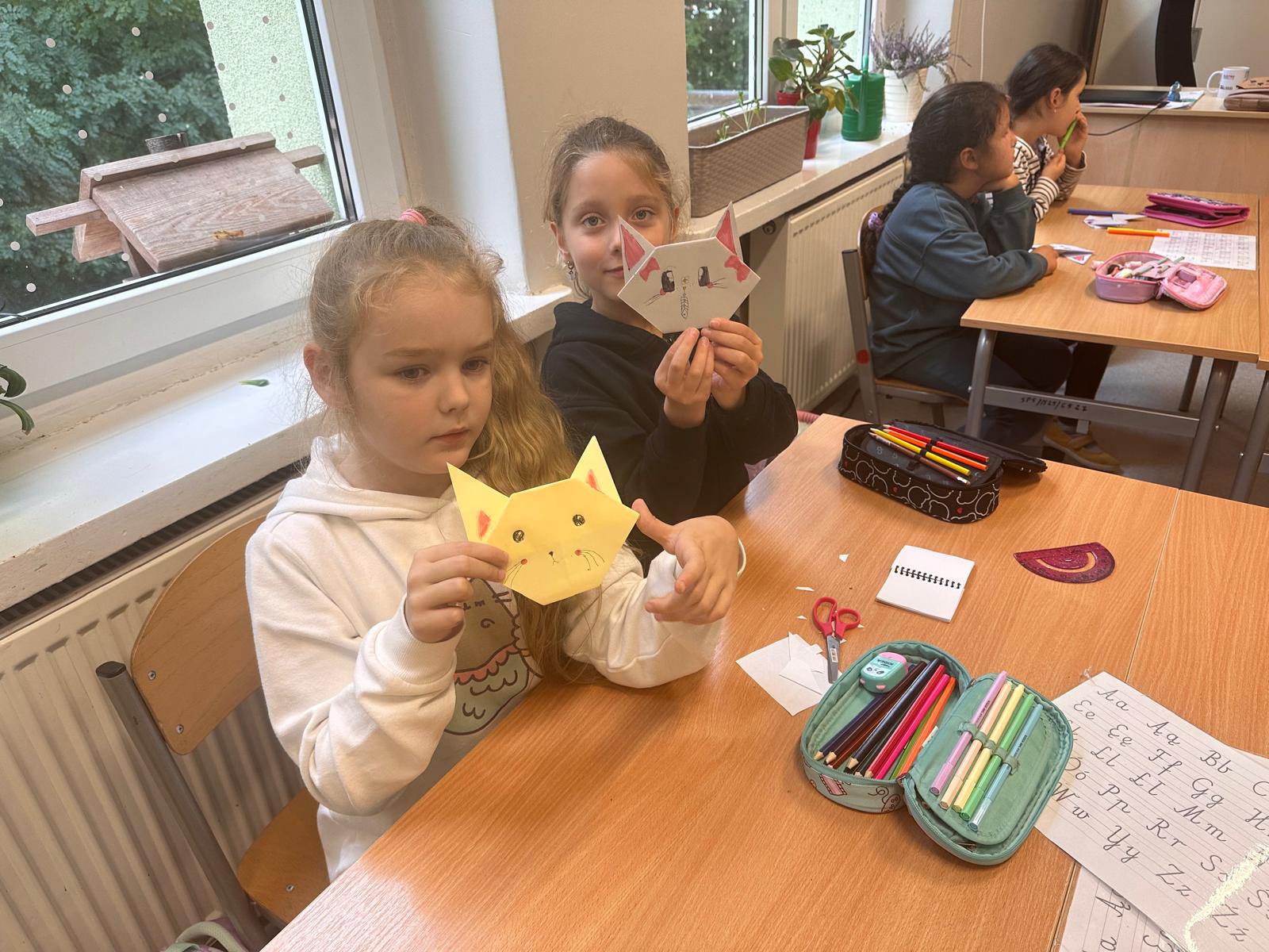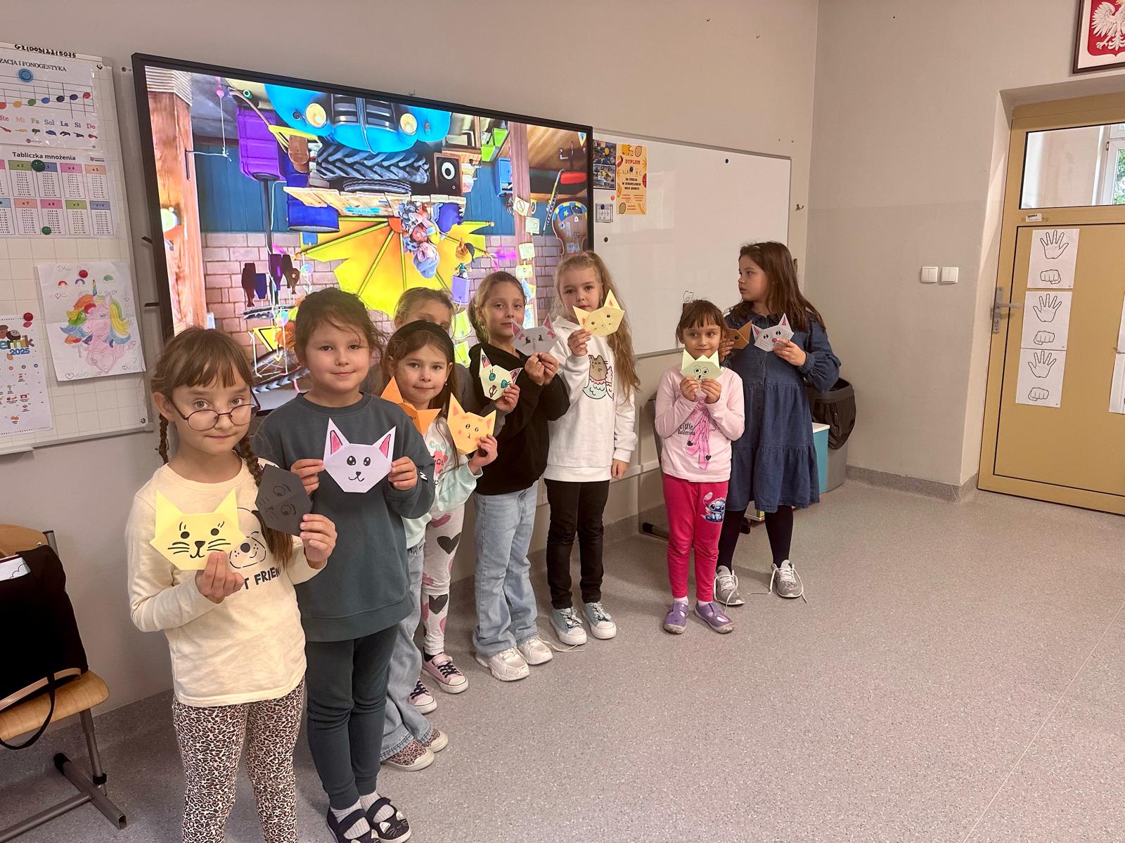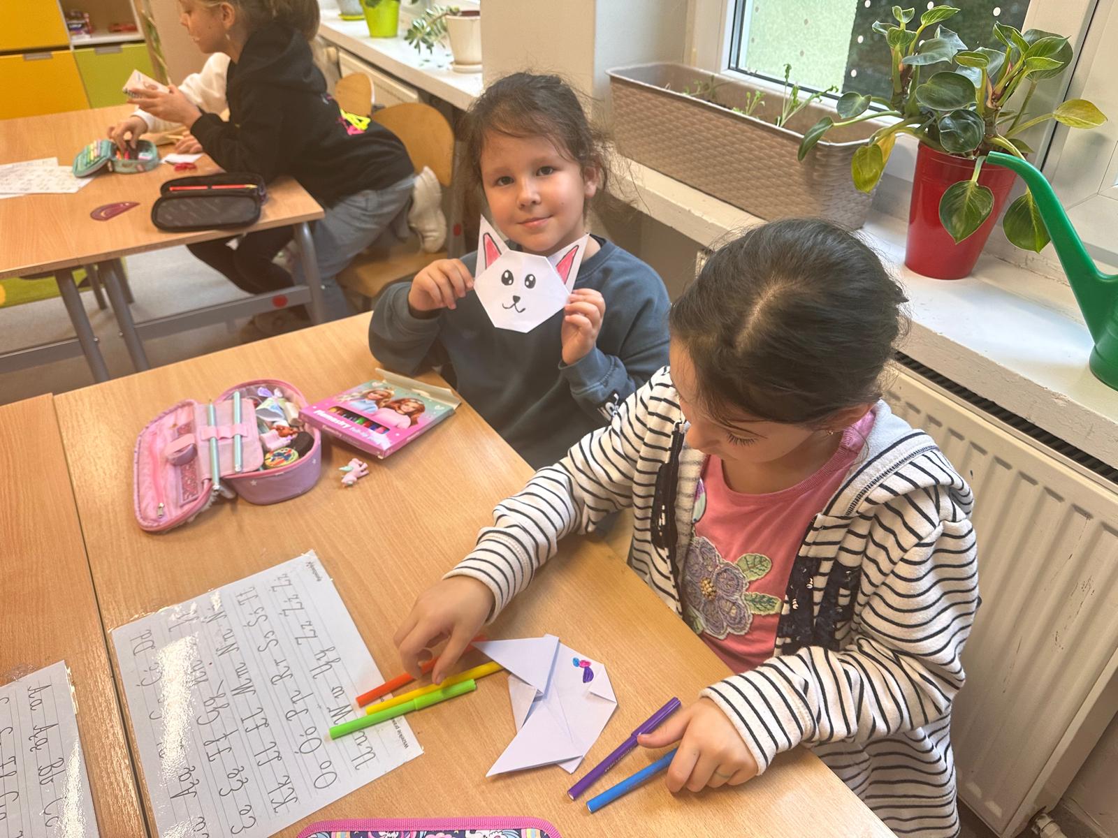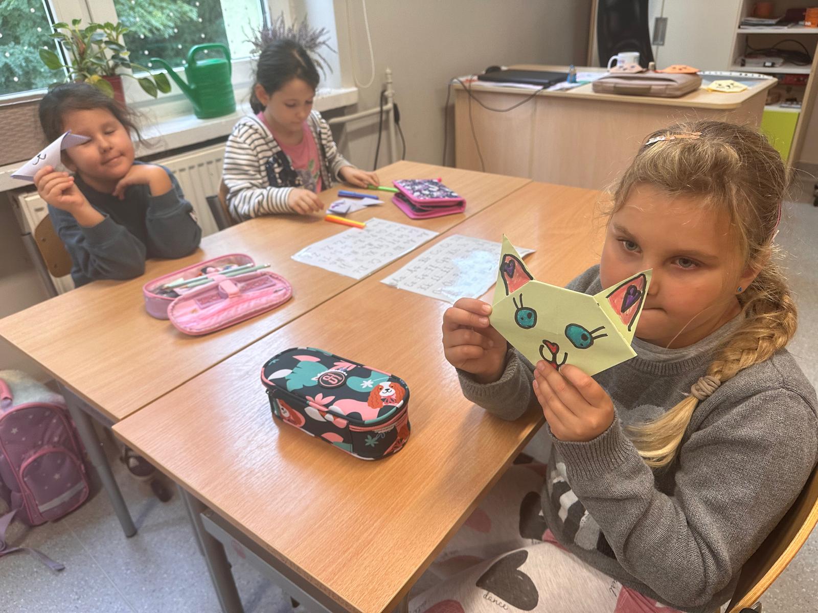 Dzisiaj na zajęciach koła origami składaliśmy z papieru głowę kotka. Do pracy wykorzystaliśmy kwadratową kartkę papieru. Krok po kroku uczyliśmy się odpowiednio zaginać rogi, aby powstały uszy i pyszczek kota.
