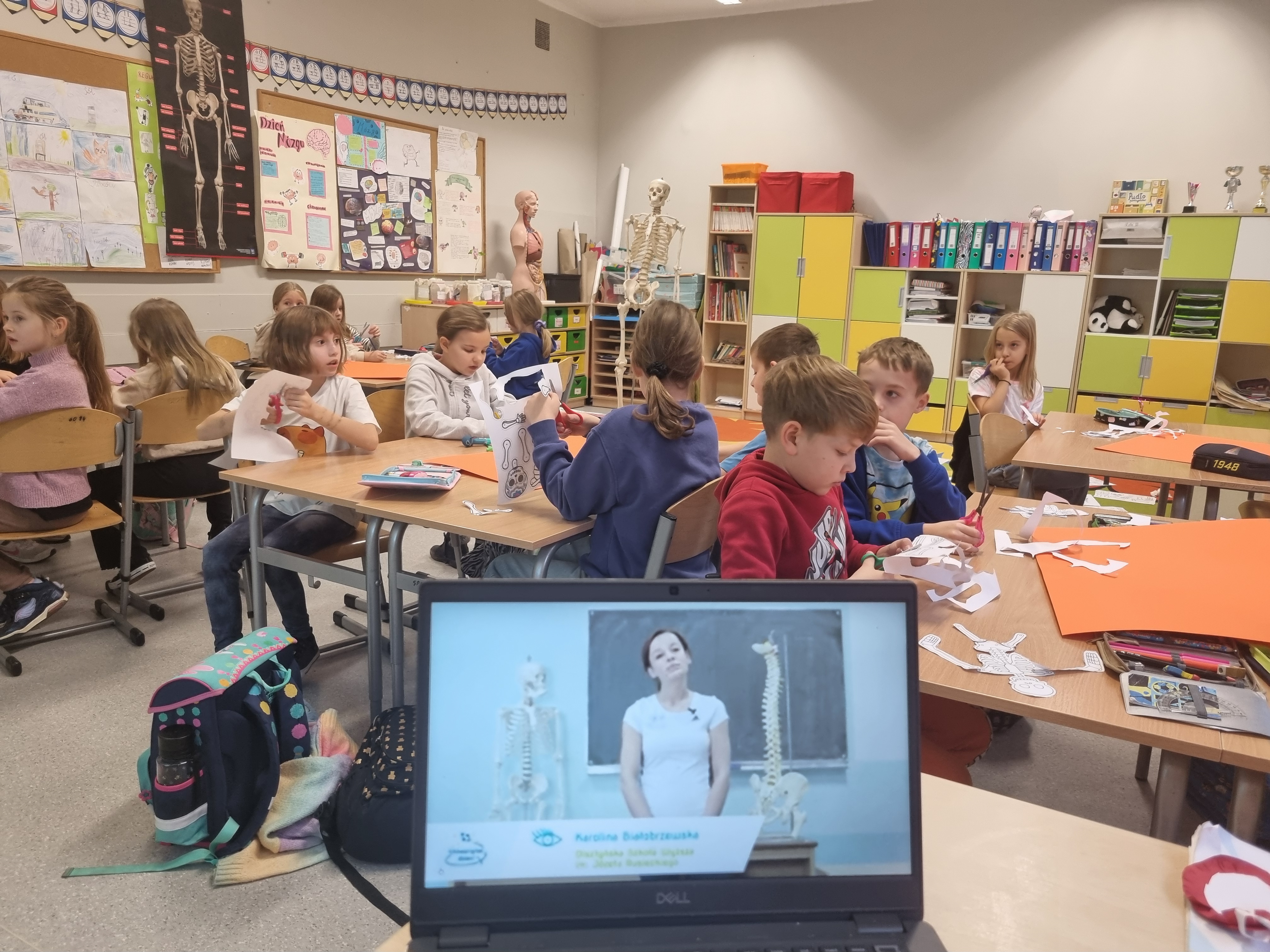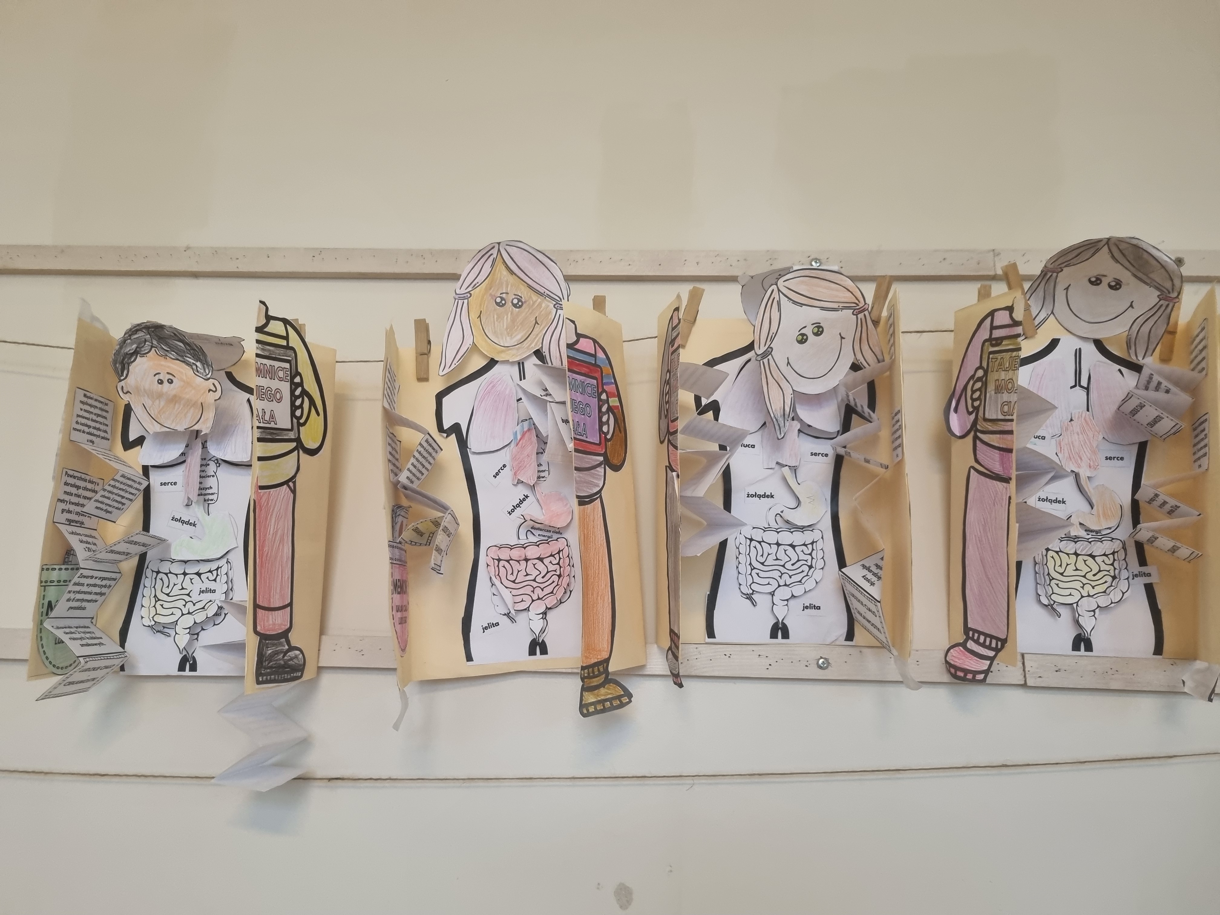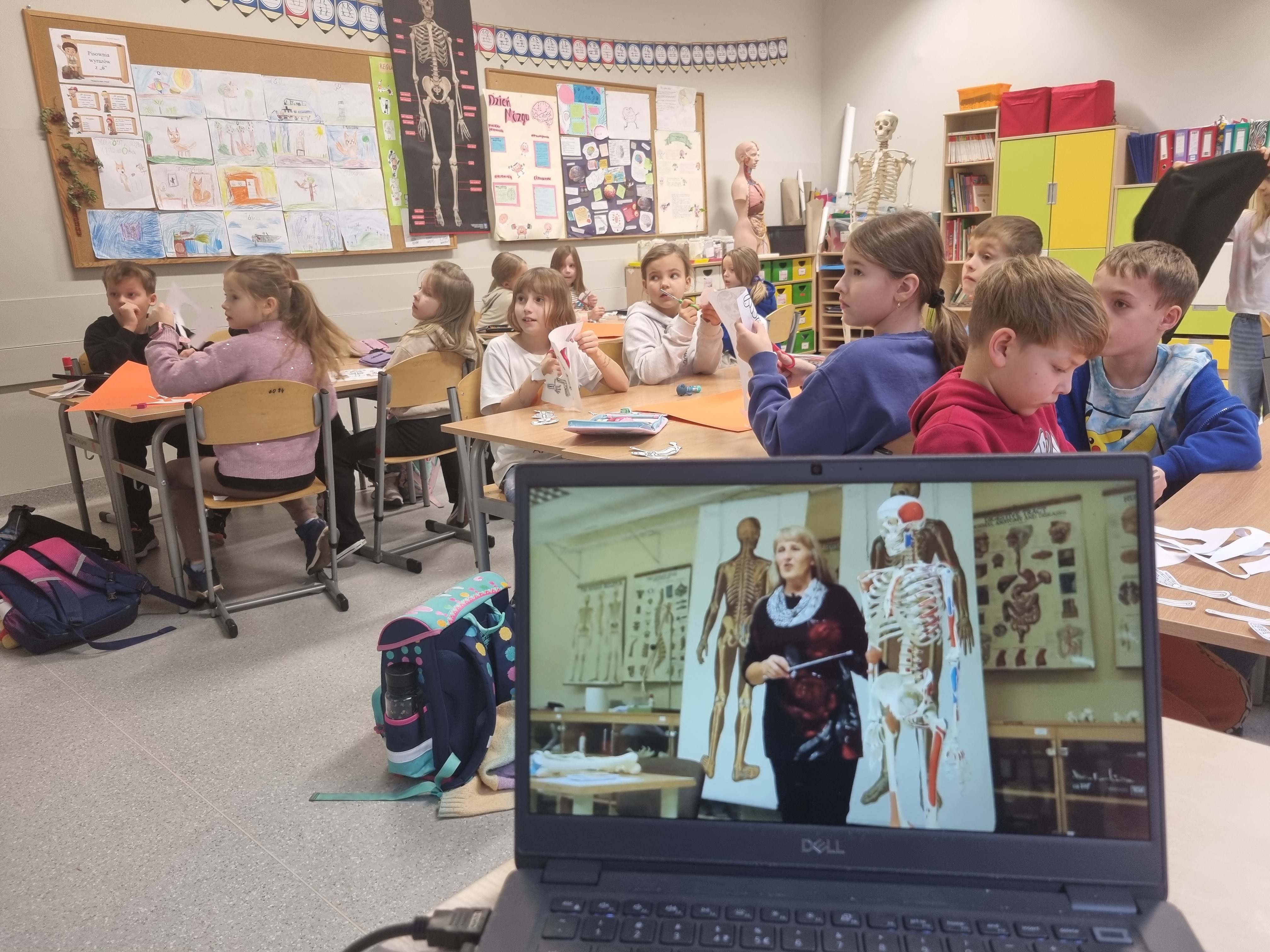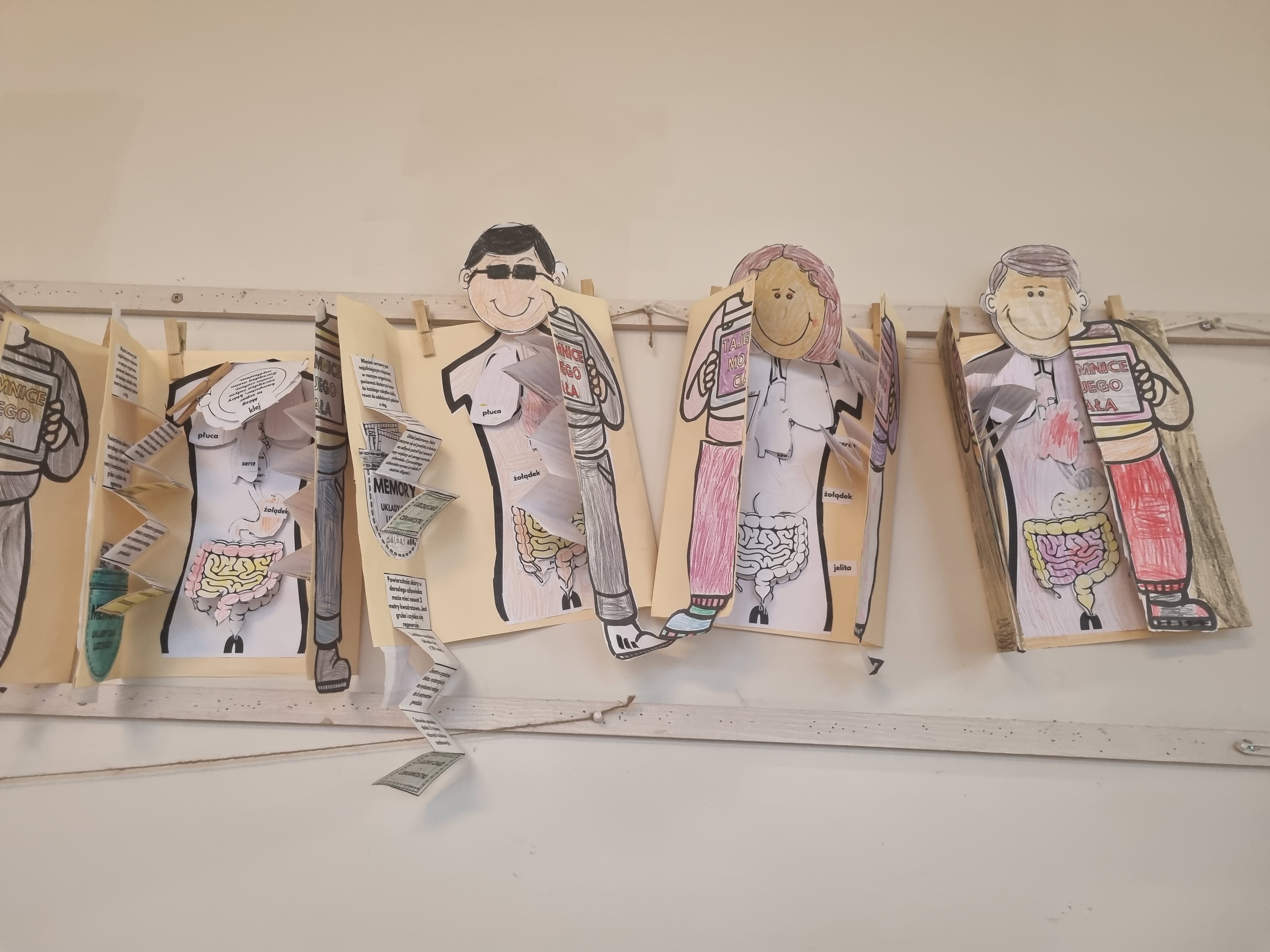 Naszym głównym kompendium wiedzy były książki. Wykorzystaliśmy bogate zasoby biblioteczne oraz prywatne zbiory, które dzieci z dumą przynosiły z domów. Wiedzę tę przelaliśmy na papier, tworząc kolorowe i interaktywne lapbooki – każdy z nich to małe dzieło sztuki pełne ciekawostek, skrytek i schematów. Wykorzystaliśmy też model anatomiczny i szkielet człowieka z pracowni biologicznej.