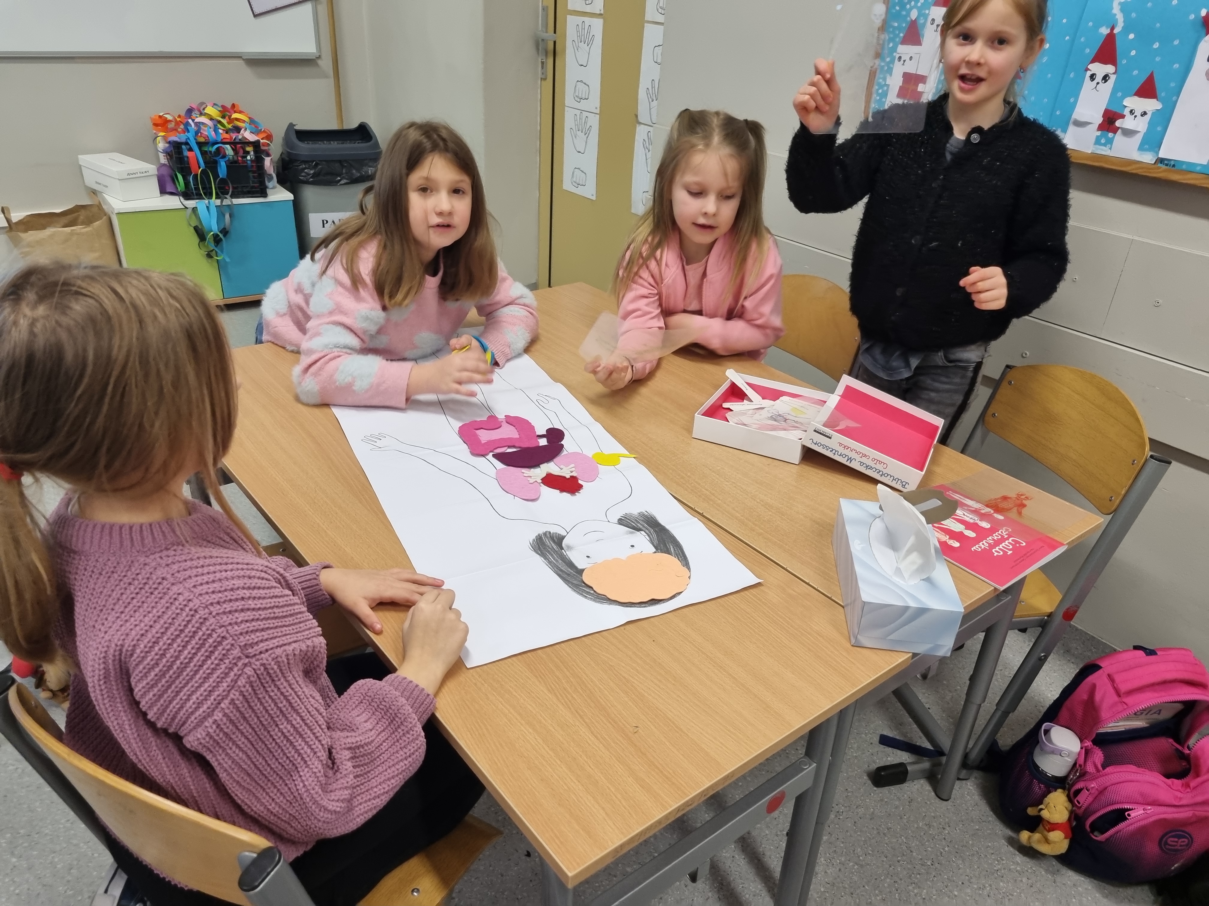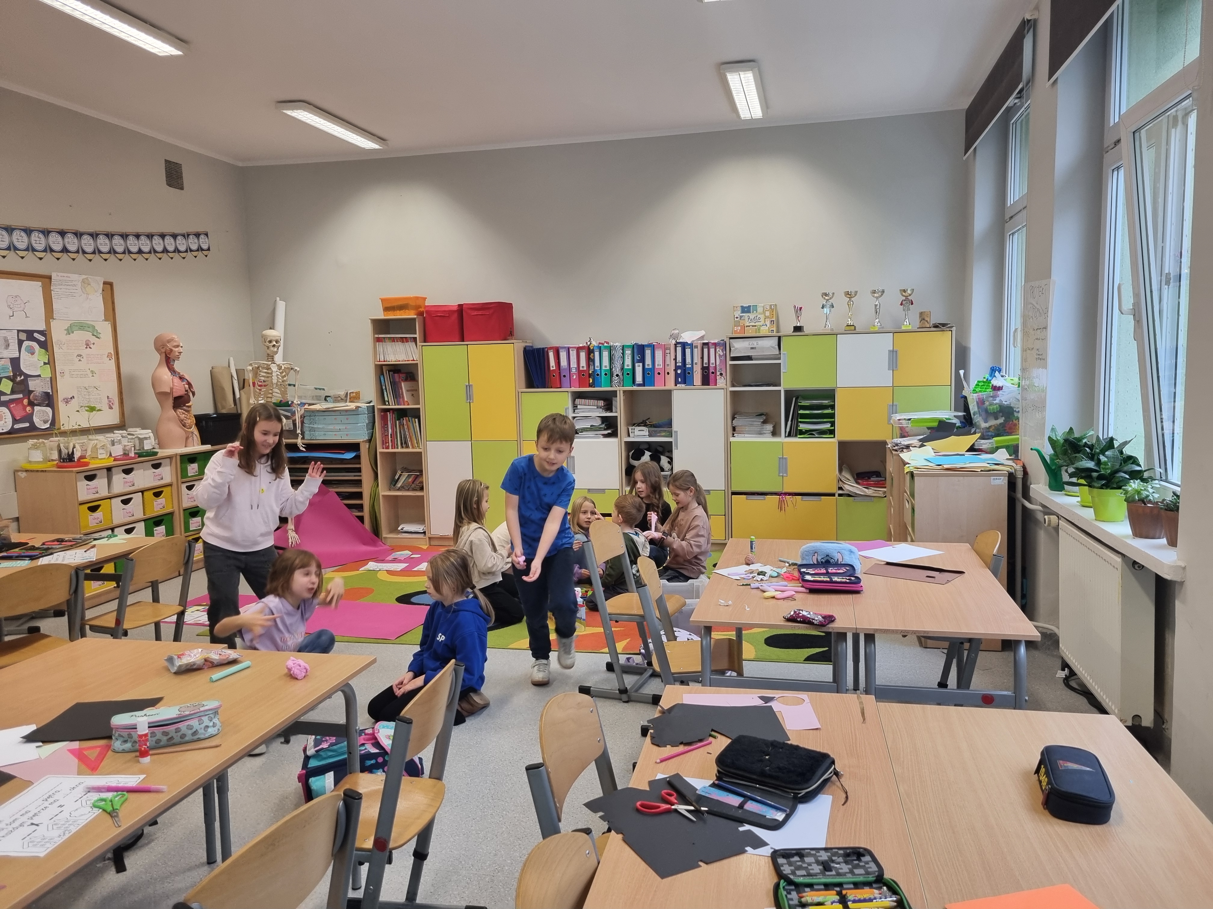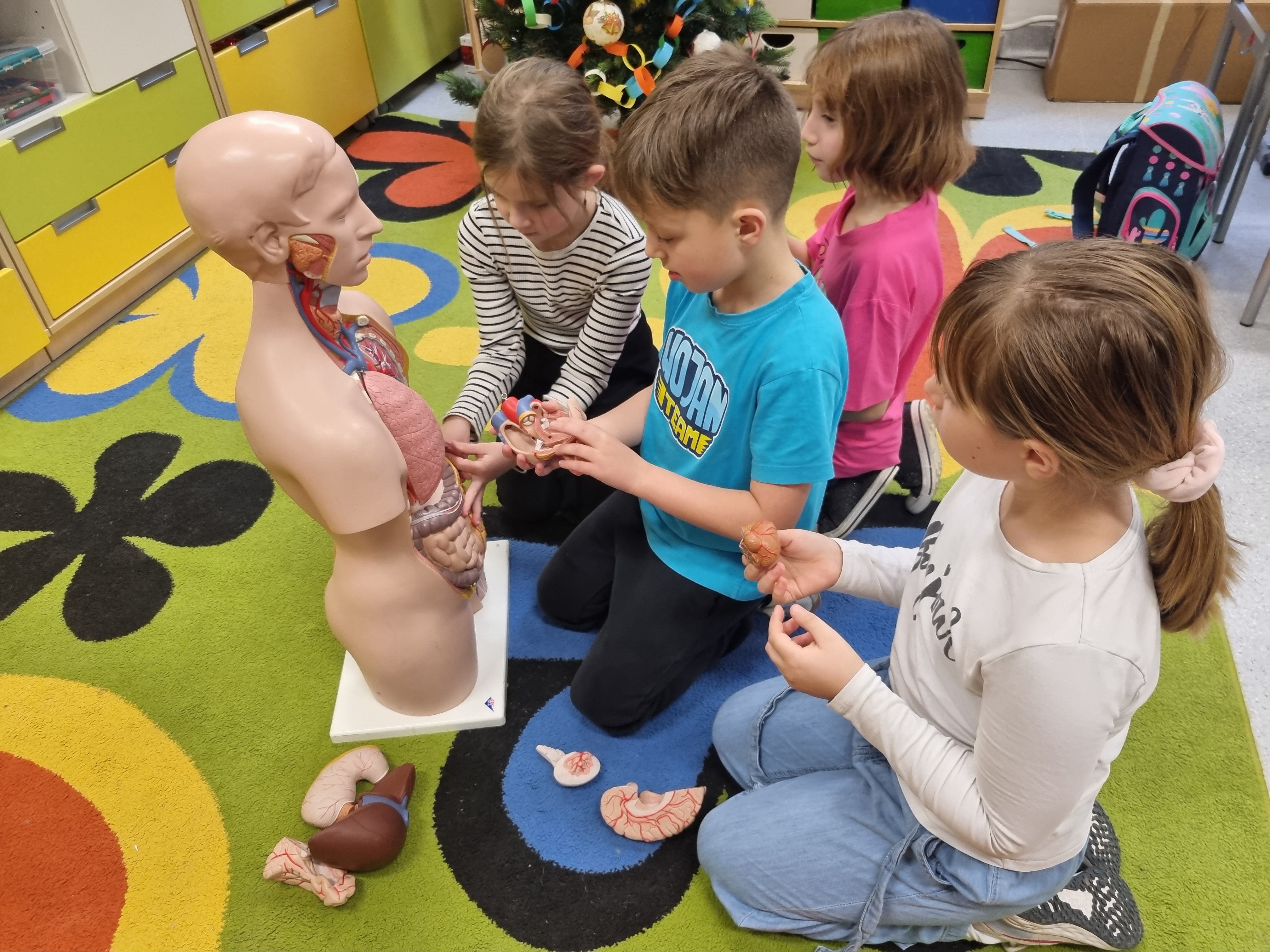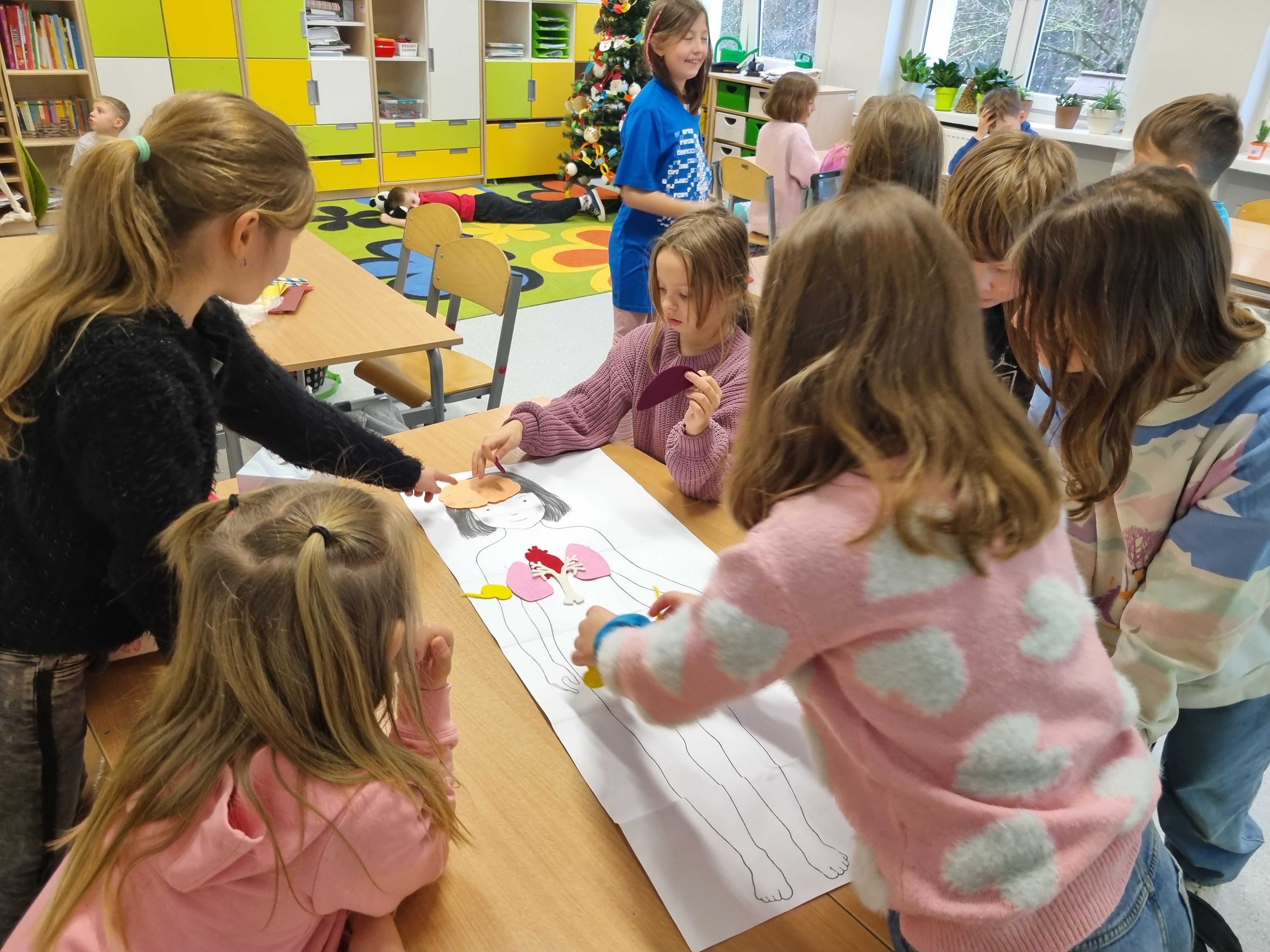 Naszym głównym kompendium wiedzy były książki. Wykorzystaliśmy bogate zasoby biblioteczne oraz prywatne zbiory, które dzieci z dumą przynosiły z domów. Wiedzę tę przelaliśmy na papier, tworząc kolorowe i interaktywne lapbooki – każdy z nich to małe dzieło sztuki pełne ciekawostek, skrytek i schematów. Wykorzystaliśmy też model anatomiczny i szkielet człowieka z pracowni biologicznej.