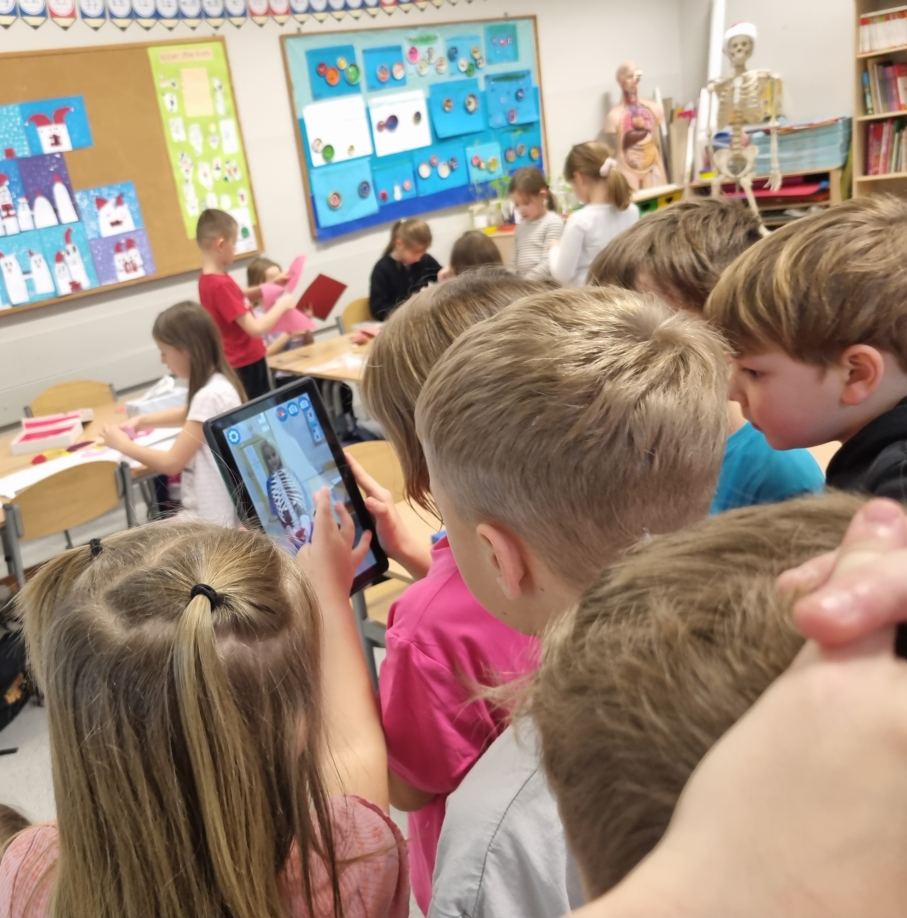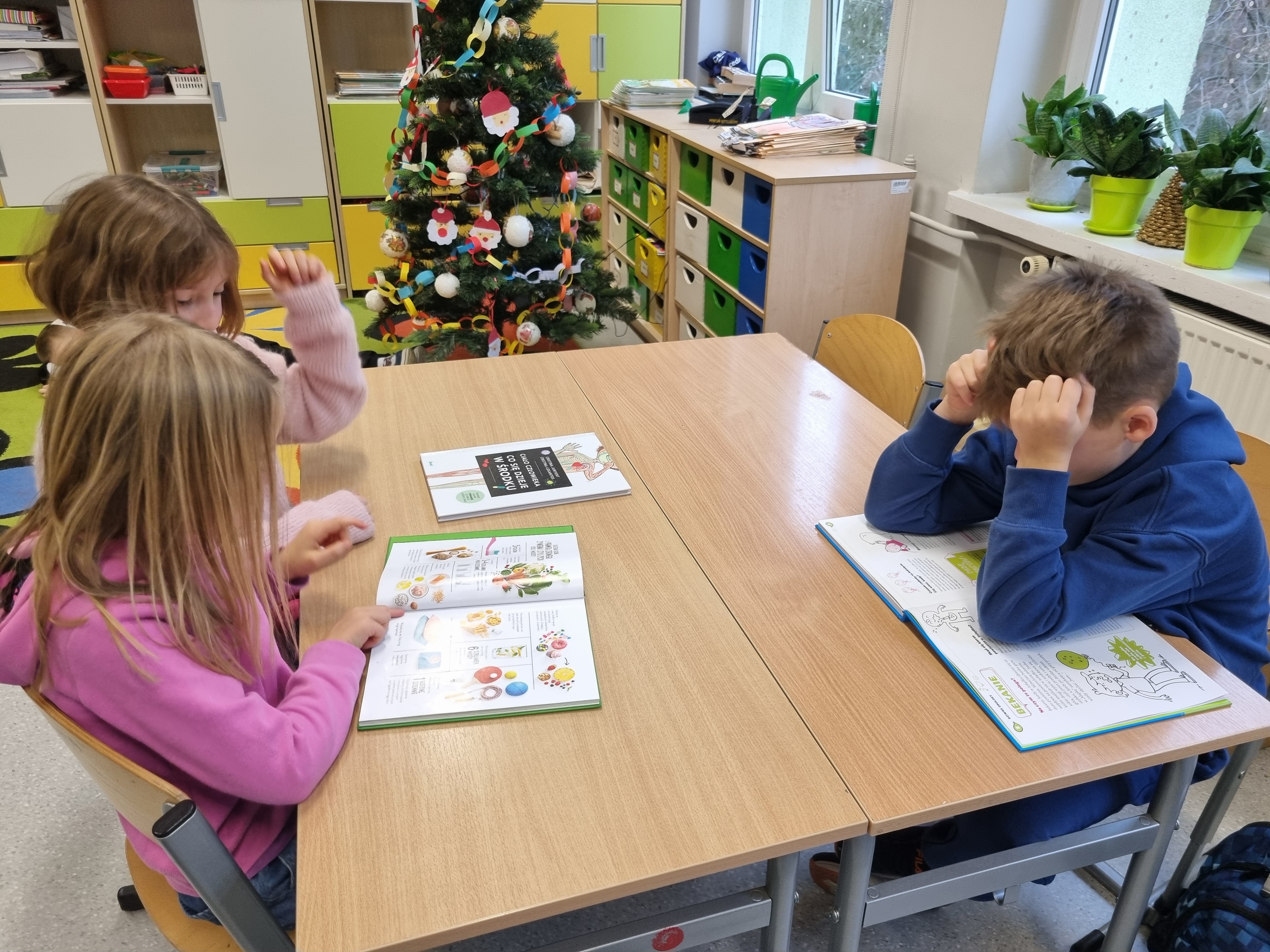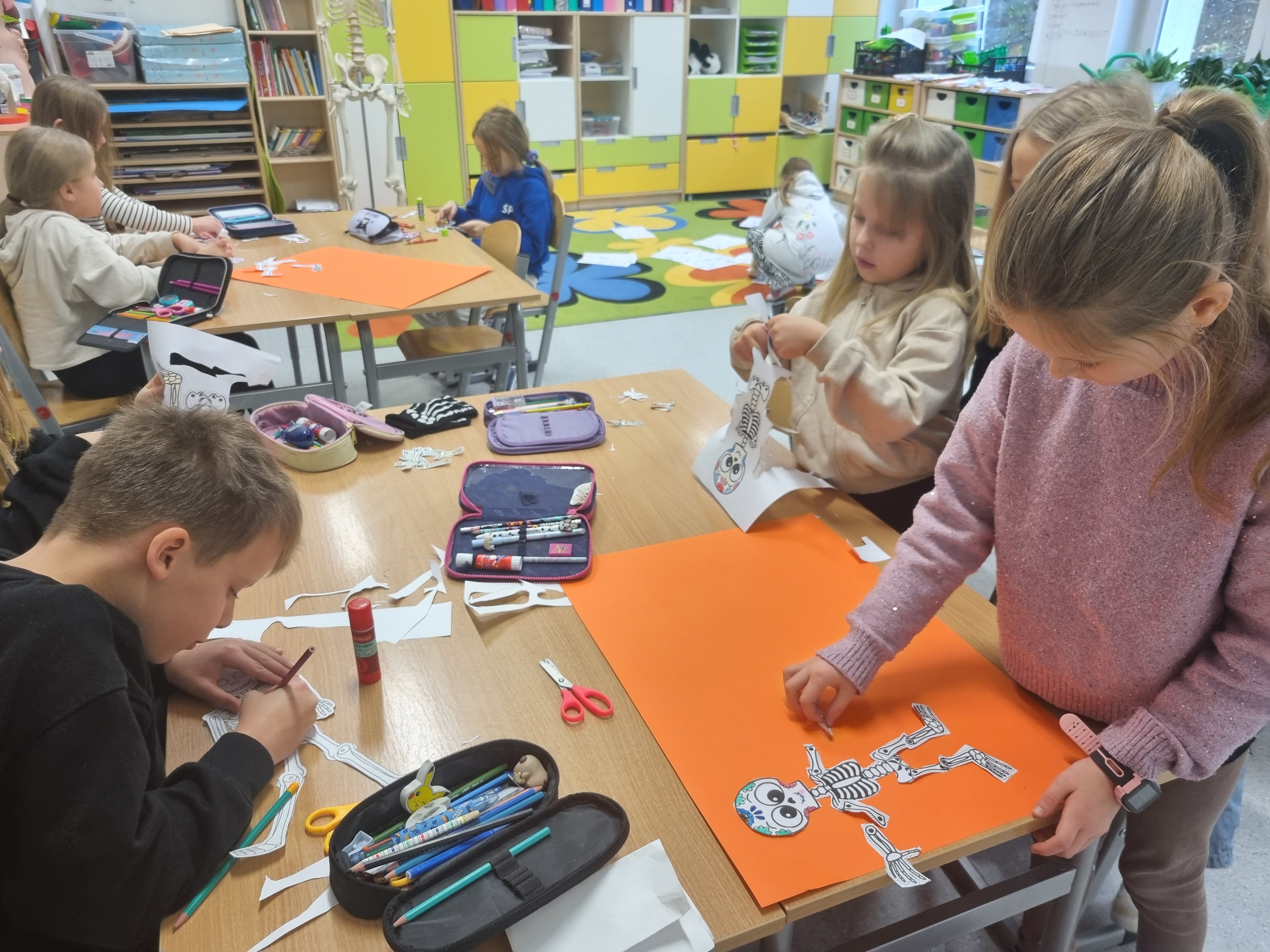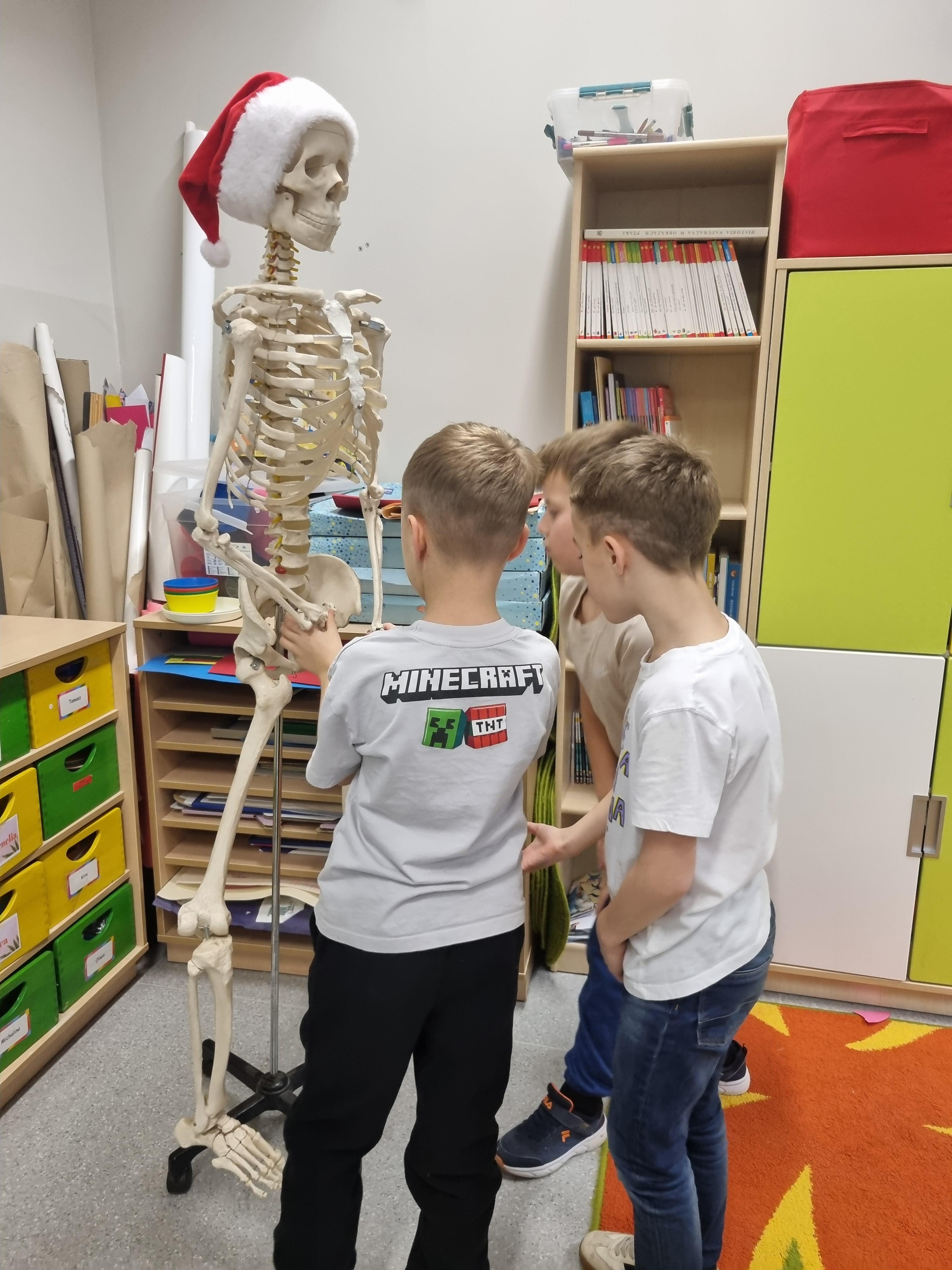 Naszym głównym kompendium wiedzy były książki. Wykorzystaliśmy bogate zasoby biblioteczne oraz prywatne zbiory, które dzieci z dumą przynosiły z domów. Wiedzę tę przelaliśmy na papier, tworząc kolorowe i interaktywne lapbooki – każdy z nich to małe dzieło sztuki pełne ciekawostek, skrytek i schematów. Wykorzystaliśmy też model anatomiczny i szkielet człowieka z pracowni biologicznej.
