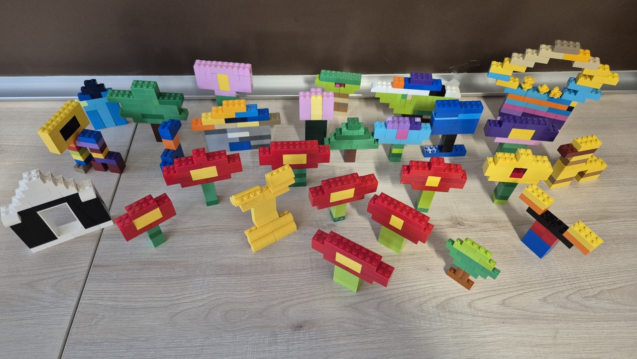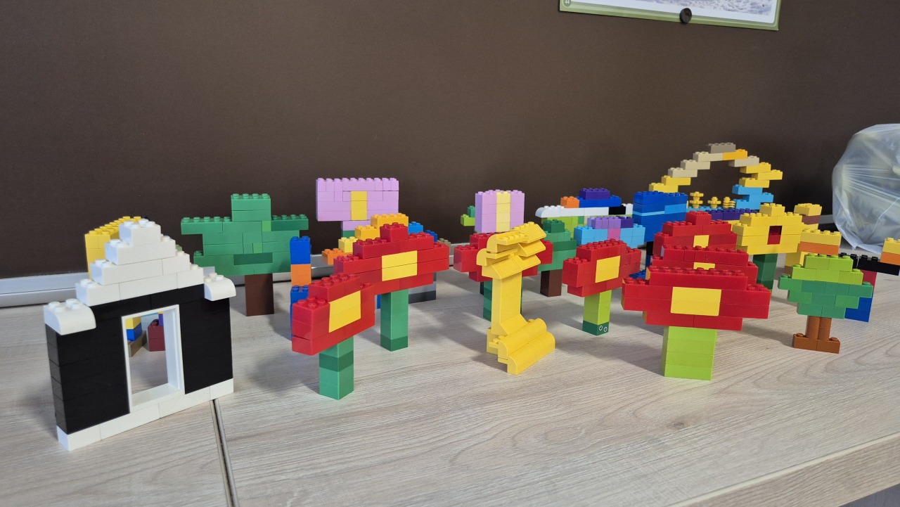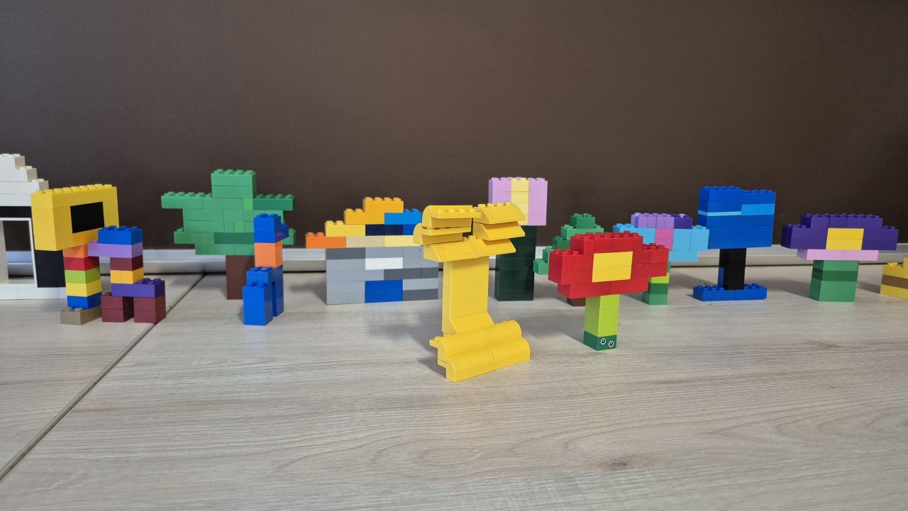 Na zakończenie zajęć wspólnie budowaliśmy z klocków LEGO – powstały m.in. kwiat, dom, żyrafa, drzewo oraz choinka.