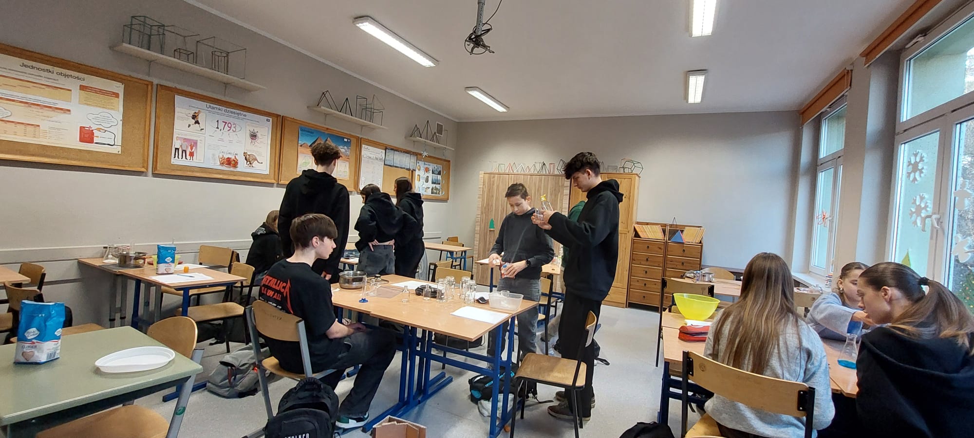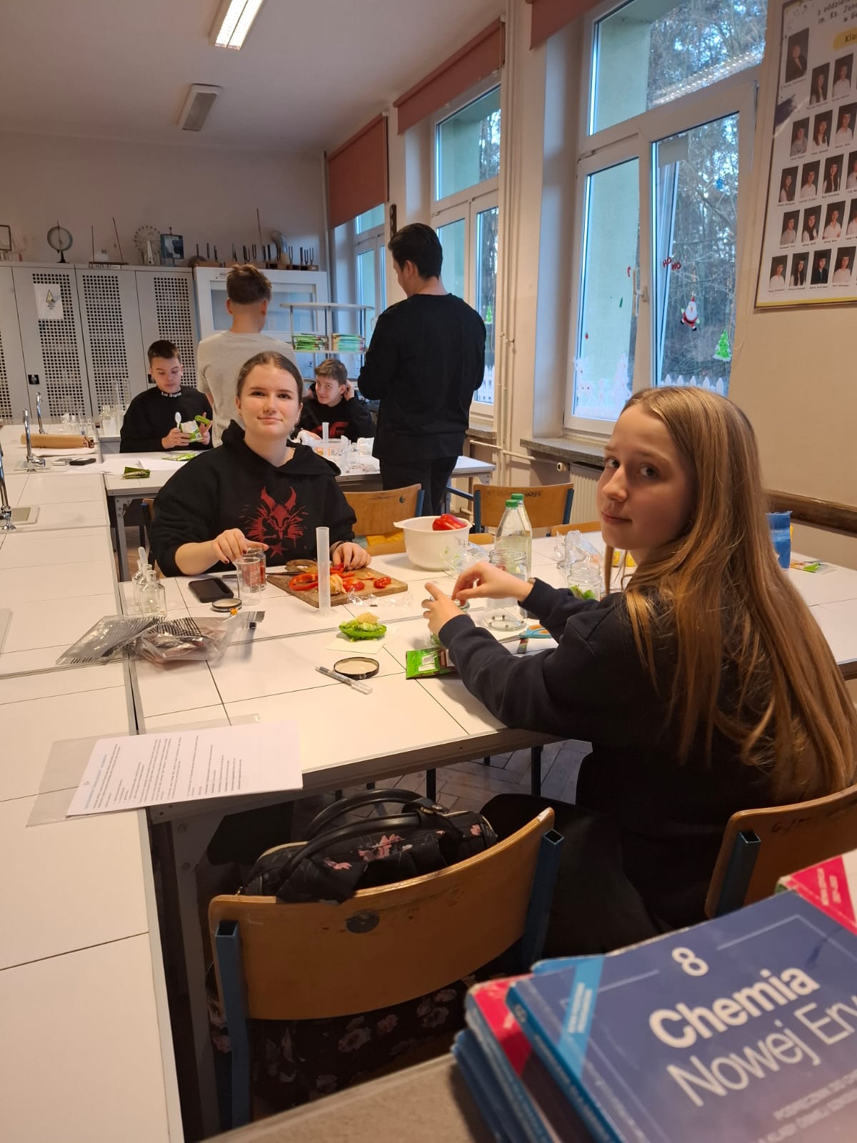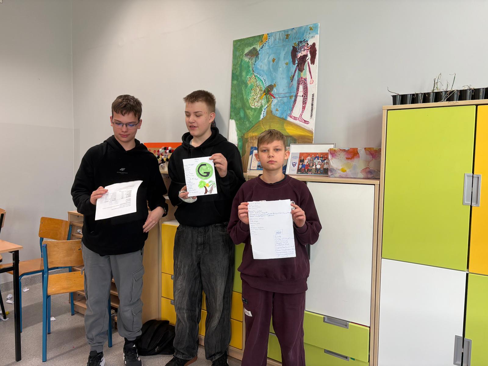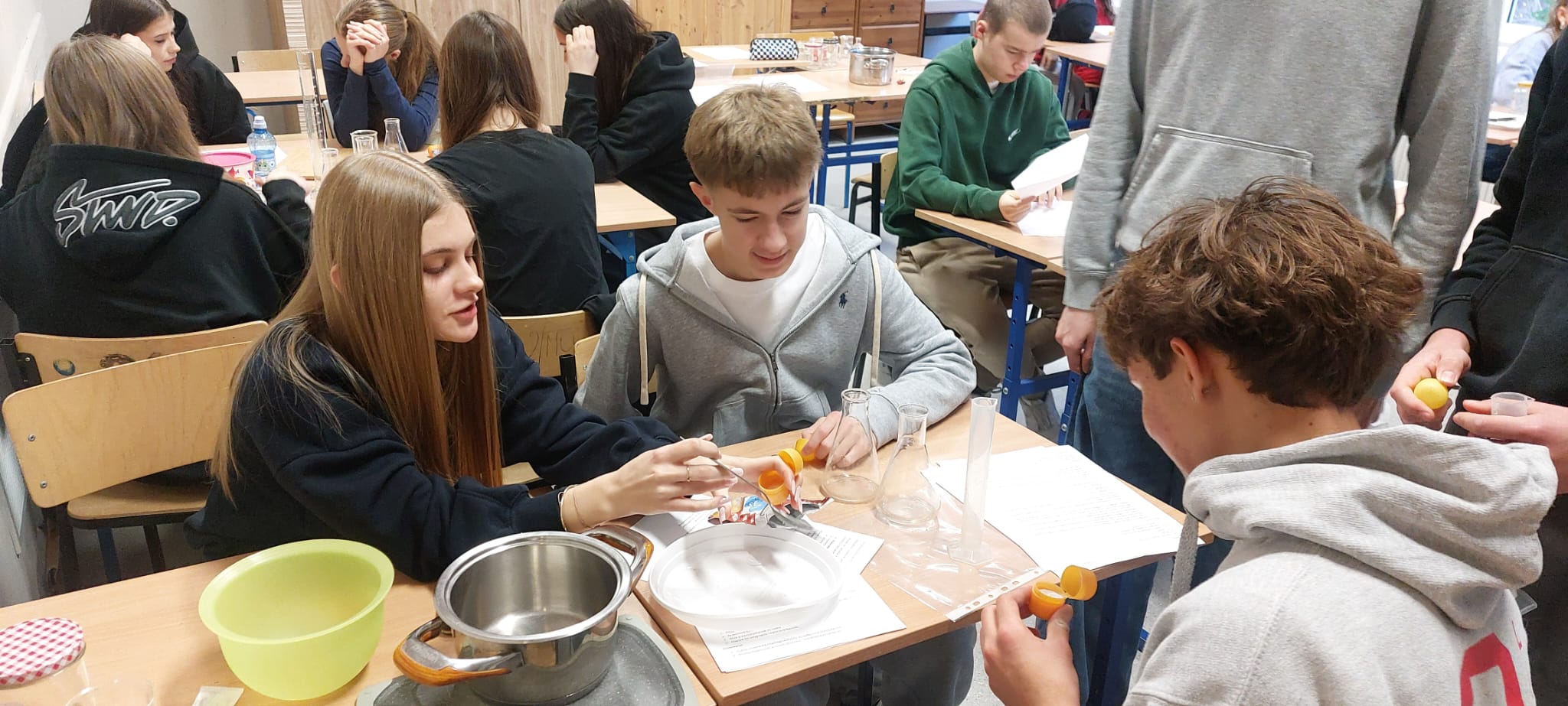 20.01.26r w naszej szkole odbyły się zajęcia projektowe. Podczas zajęć projektowych" Chemia od kuchni" uczniowie klas 7-8 odkrywali, że chemia towarzyszy nam na co dzień, także w kuchni. Zajęcia łączyły działania praktyczne z częścią teoretyczną, dzięki czemu uczniowie mogli lepiej zrozumieć omawiane zagadnienia. Uczniowie samodzielnie przygotowali paprykę w occie, poznając proces pasteryzacji i jego znaczenie w utrwalaniu żywności. W doświadczeniu " Tęcza w próbówce" obserwowali róznice w gęstości roztworów. Dużym zainteresowaniem cieszyły się doświadczenia "Wybuchowe jajo" oraz "Wulkan z sody i octu", podczas których uczniowie obserwowali powstanie dwutlenku węgla i wzrost ciśnienia gazów w zamkniętych pojemnikach. Na zakończenie zajęć uczniowie przygotowali roztwór soli fizjologicznej, ucząc się obliczania stężenia procentowego, a także wykonali karmelowe lizaki, obserwując pzremiany cukru pod wpoływem temperatury. Oprócz doświadczeń uczniowie poznali niezbędną teorię oraz rozwiązywali zadania związane z tematyką wykonywanych eksperymentów. Zajęcia były wartościową lekcją nauki poprzez działanie, rozwijały ciekawość poznawczą uczniów oraz łączenia wiedzy teoretycznej z praktyką. Klasy 5-6 natomiast miały temat projekty