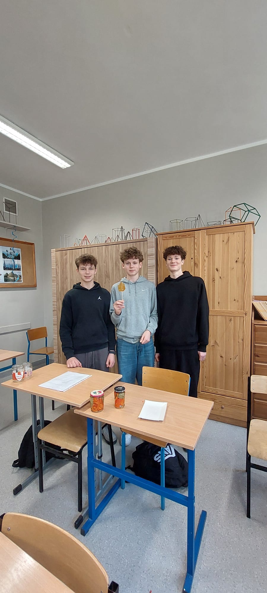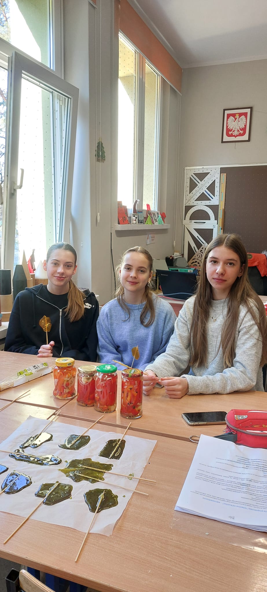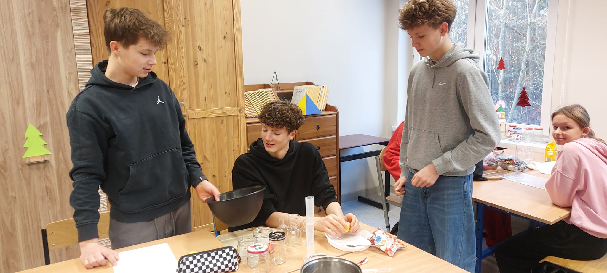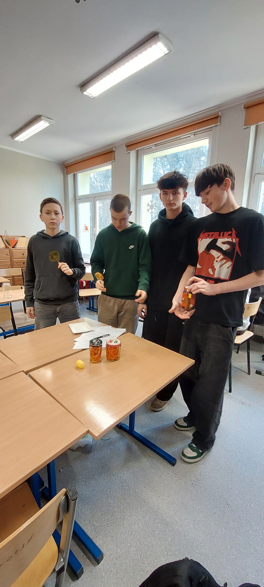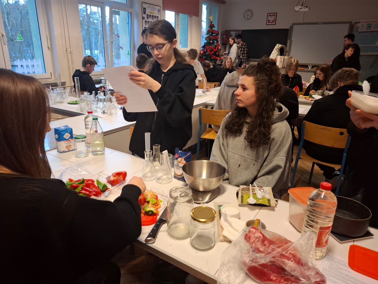20.01.26r w naszej szkole odbyły się zajęcia projektowe. Podczas zajęć projektowych" Chemia od kuchni" uczniowie klas 7-8 odkrywali, że chemia towarzyszy nam na co dzień, także w kuchni. Zajęcia łączyły działania praktyczne z częścią teoretyczną, dzięki czemu uczniowie mogli lepiej zrozumieć omawiane zagadnienia. Uczniowie samodzielnie przygotowali paprykę w occie, poznając proces pasteryzacji i jego znaczenie w utrwalaniu żywności. W doświadczeniu " Tęcza w próbówce" obserwowali róznice w gęstości roztworów. Dużym zainteresowaniem cieszyły się doświadczenia "Wybuchowe jajo" oraz "Wulkan z sody i octu", podczas których uczniowie obserwowali powstanie dwutlenku węgla i wzrost ciśnienia gazów w zamkniętych pojemnikach. Na zakończenie zajęć uczniowie przygotowali roztwór soli fizjologicznej, ucząc się obliczania stężenia procentowego, a także wykonali karmelowe lizaki, obserwując pzremiany cukru pod wpoływem temperatury. Oprócz doświadczeń uczniowie poznali niezbędną teorię oraz rozwiązywali zadania związane z tematyką wykonywanych eksperymentów. Zajęcia były wartościową lekcją nauki poprzez działanie, rozwijały ciekawość poznawczą uczniów oraz łączenia wiedzy teoretycznej z praktyką. Klasy 5-6 natomiast miały temat projekty