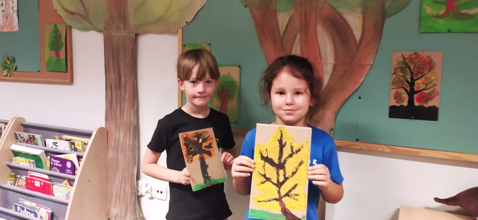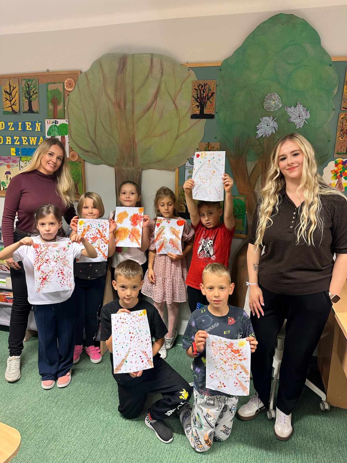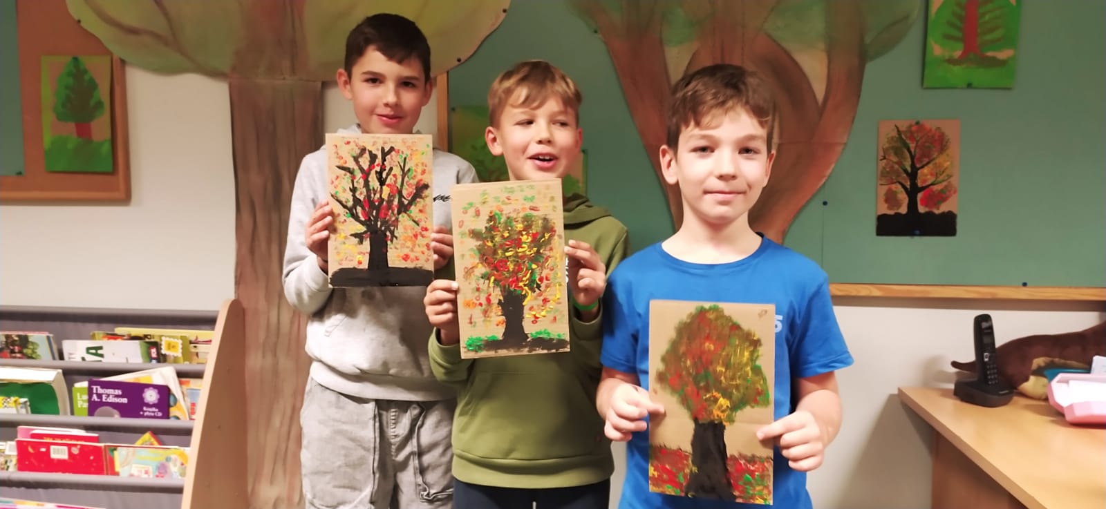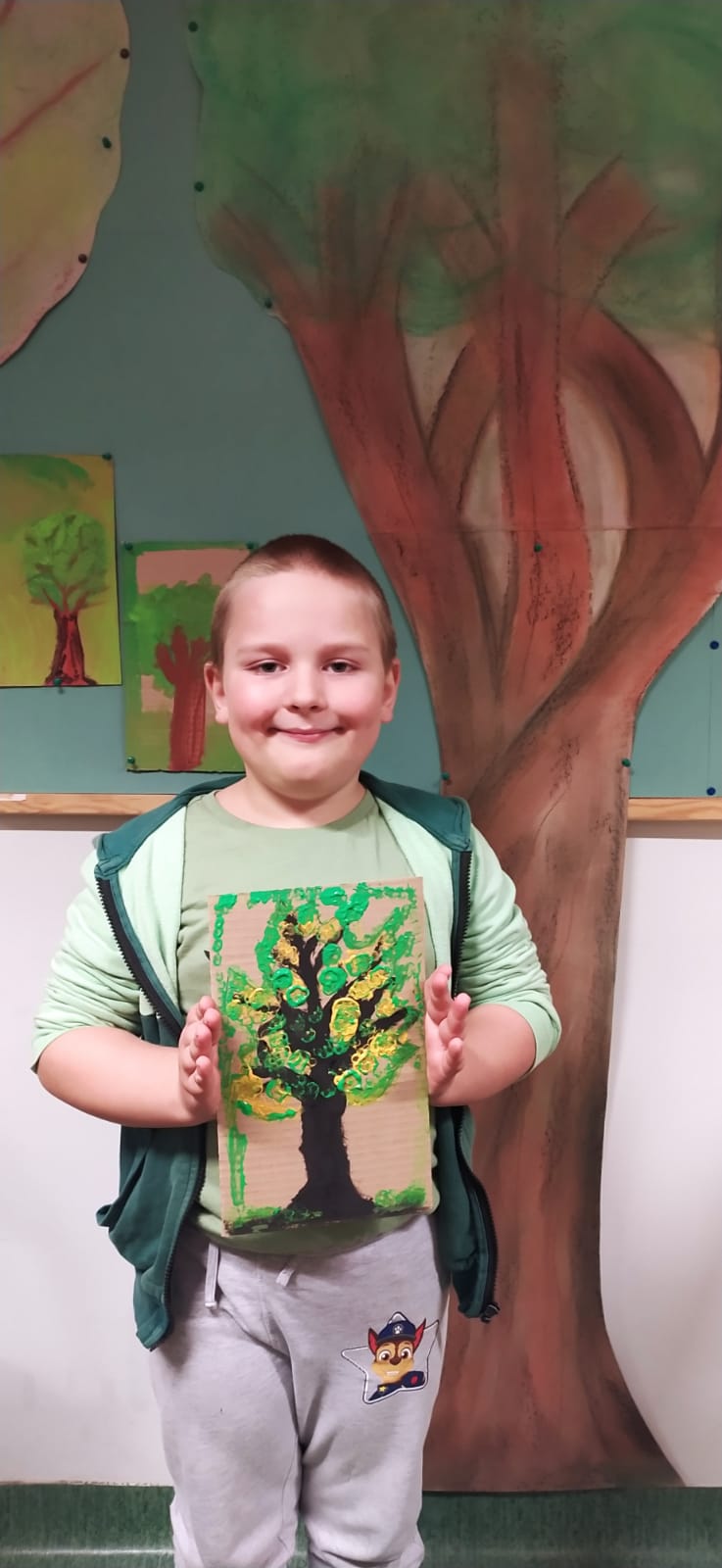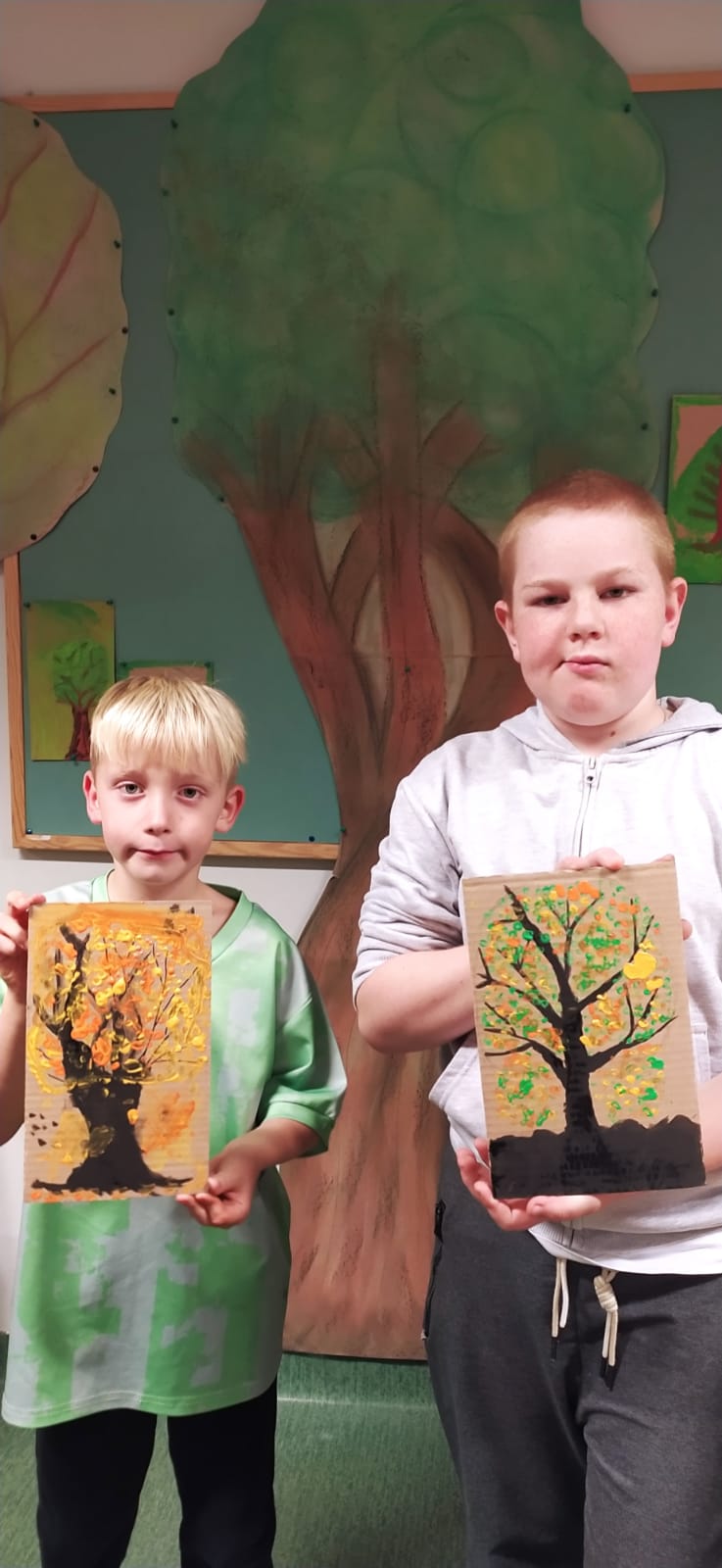 Nasi uczniowie po zakończonych lekcjach tworzyli "portrety drzew". Na kartonach malowali: pędzlem, patyczkami i wyklejali bibułą. Powstały różnorodne drzewa jesienne, przepełnione życiem.