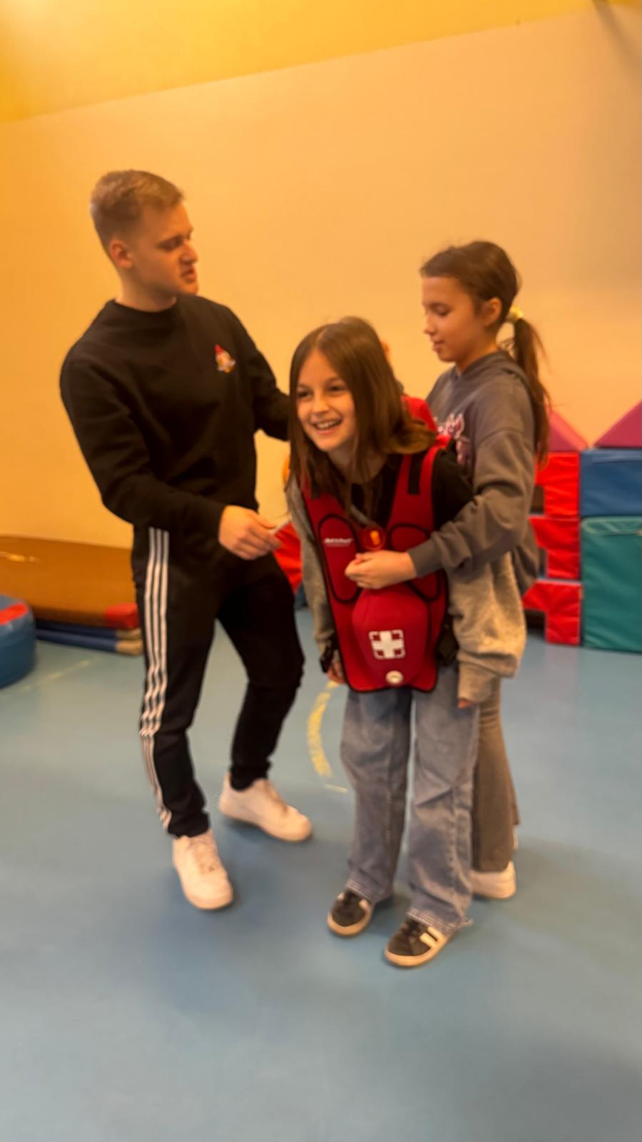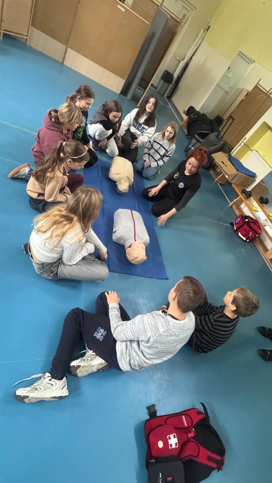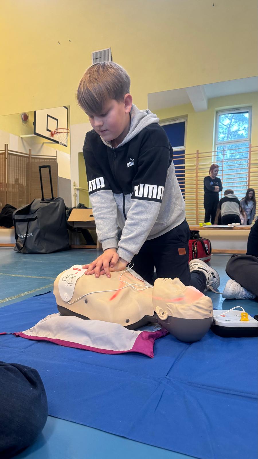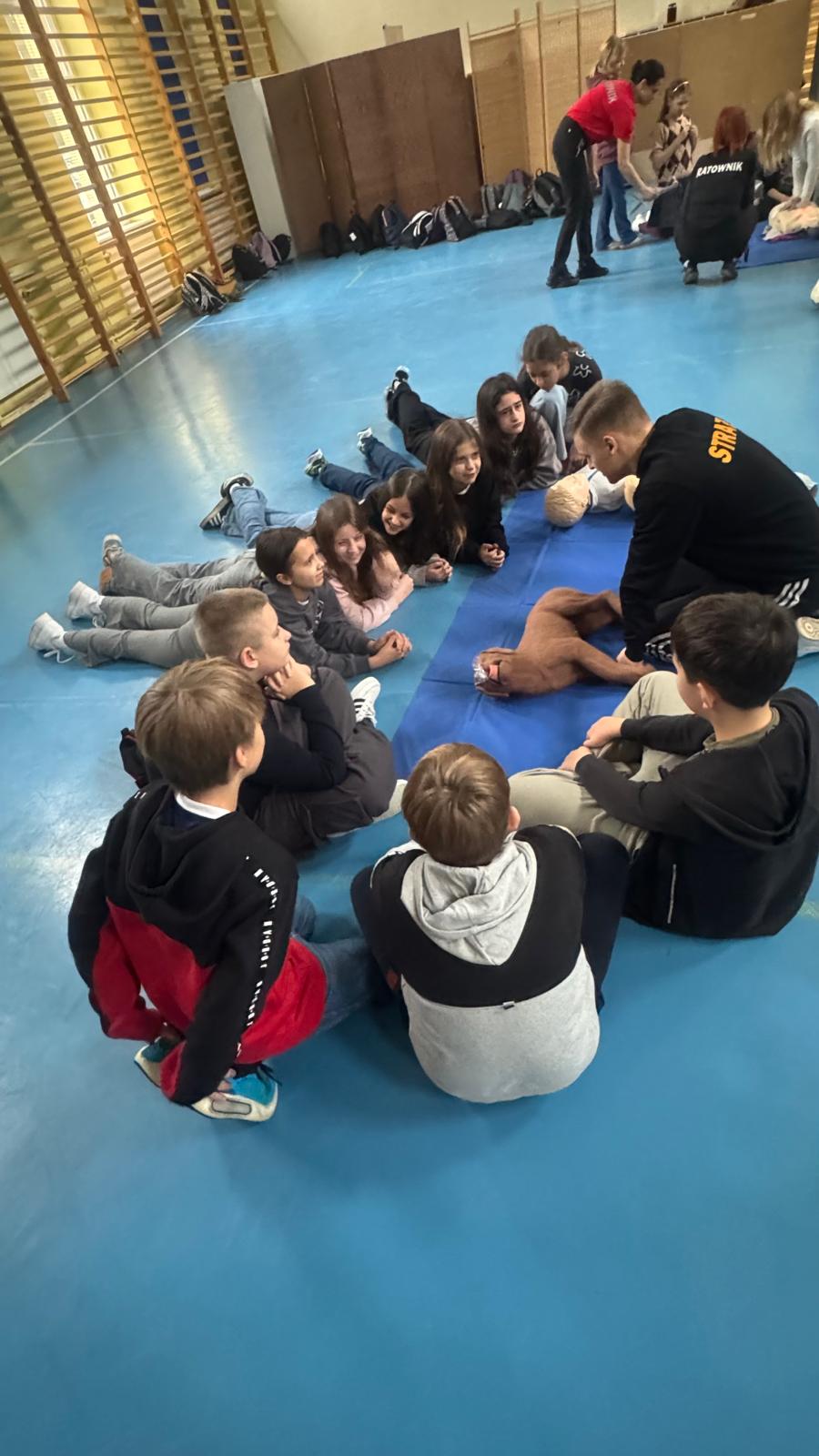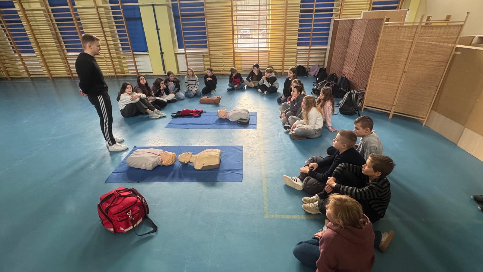 W dniu 2.12.2025 w klasie 5a dobyły sie warsztaty z pierwszej pomocy przedmedycznej, których celem było rozwijanie świadomości dotyczącej bezpieczeństwa oraz nauka reagowania w sytuacjach zagrożenia zdrowia i życia. Zajęcia przeprowadzili wykwalifikowani instruktorzy oraz strażak z fundacji " uRATUJsie", którzy w przystępny i angażujący sposób wprowadzili uczniów w podstawowe zasady udzielania pierwszej pomocy. Podczas warsztatów uczniowie dowiedzieli się jak prawidłowo ocenić sytuację, wezwać pomoc oraz zabezpieczyć miejsce zdarzenia, ułożyć poszkodowanego w pozycji bezpiecznej. Uczniowie nauczyli się, jak pomóc innym w przypadku zadławienia, a także jak przywrócić akcję serca psom. Najwiekszym zainteresowaniem cieszyła się część praktyczna dotycząca resuscytacji krążeniowo- oddechowej, podczas której uczniowie mieli okazję przećwiczyć uciak klatki piersiowej na profesjonalnym fantomie, a także obsługa urządzenia ratującego życie AED. Warsztaty spotkały się z dużym entuzjazmem uczniów, którzy aktywnie brali udział we wszystkich ćwiczeniach. Zajęcia nie tylko zwbogaciły ich wiedzę, ale przede wszystkim wyposażyły w praktyczne umiejętności, które mogą okazać się nieocenione w sytuacjach nagłych. Dziękujemy fundacji" uRATUJsie" za odwiedziny i ogromną porcję przedatnej wiedzy.