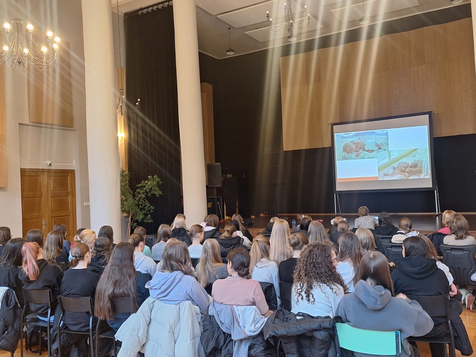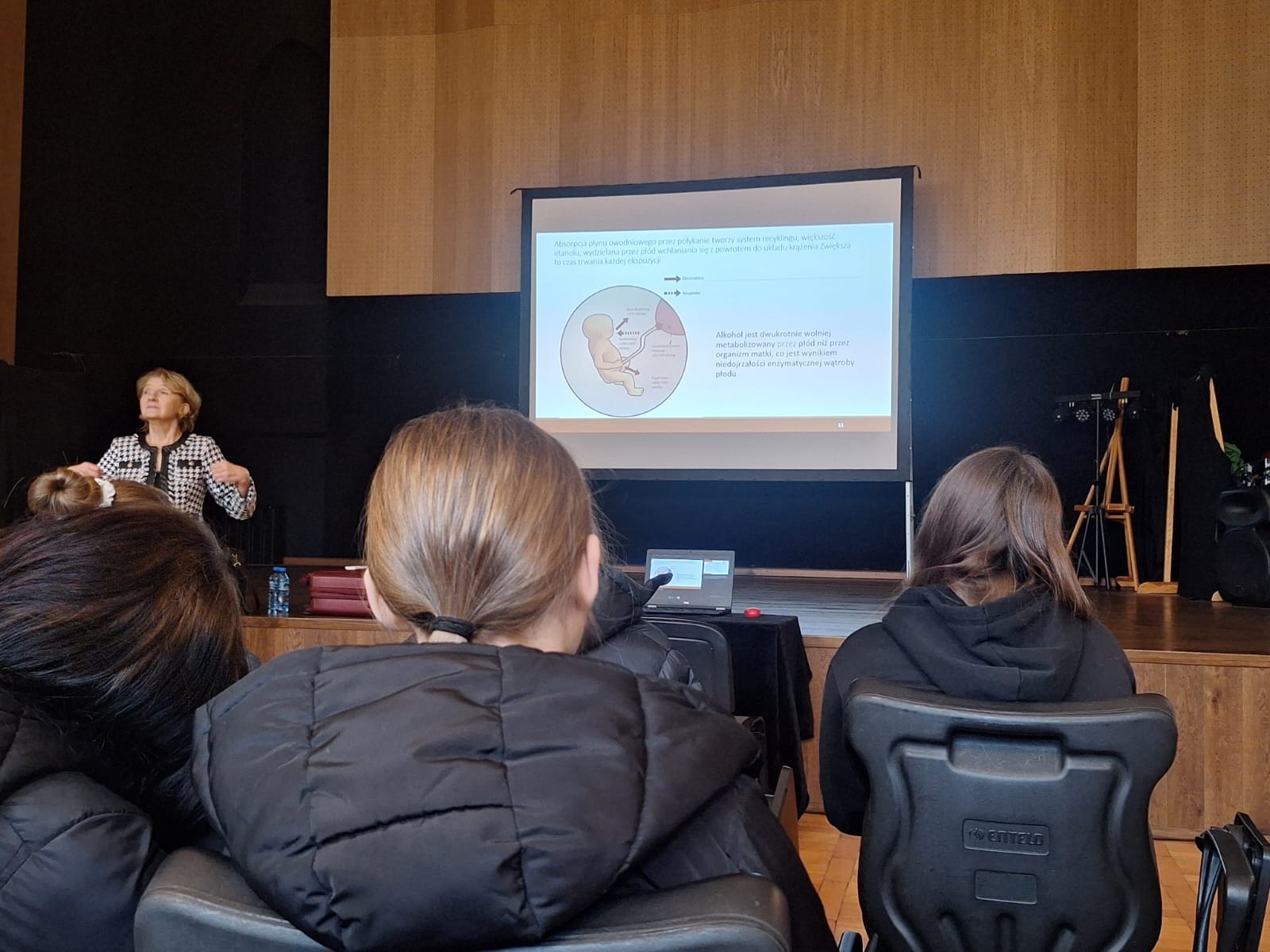 Pani profesor omówiła, w jaki sposób alkohol oddziałuje na płód i rozwój dziecka, podkreślając, że nawet niewielkie dawki alkoholu mogą negatywnie wpływać na zdrowie rozwijającego się dziecka. Uczennice poznały również konsekwencje spożywania alkoholu w ciąży i poza nią.