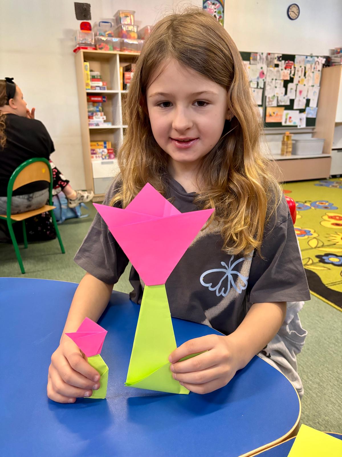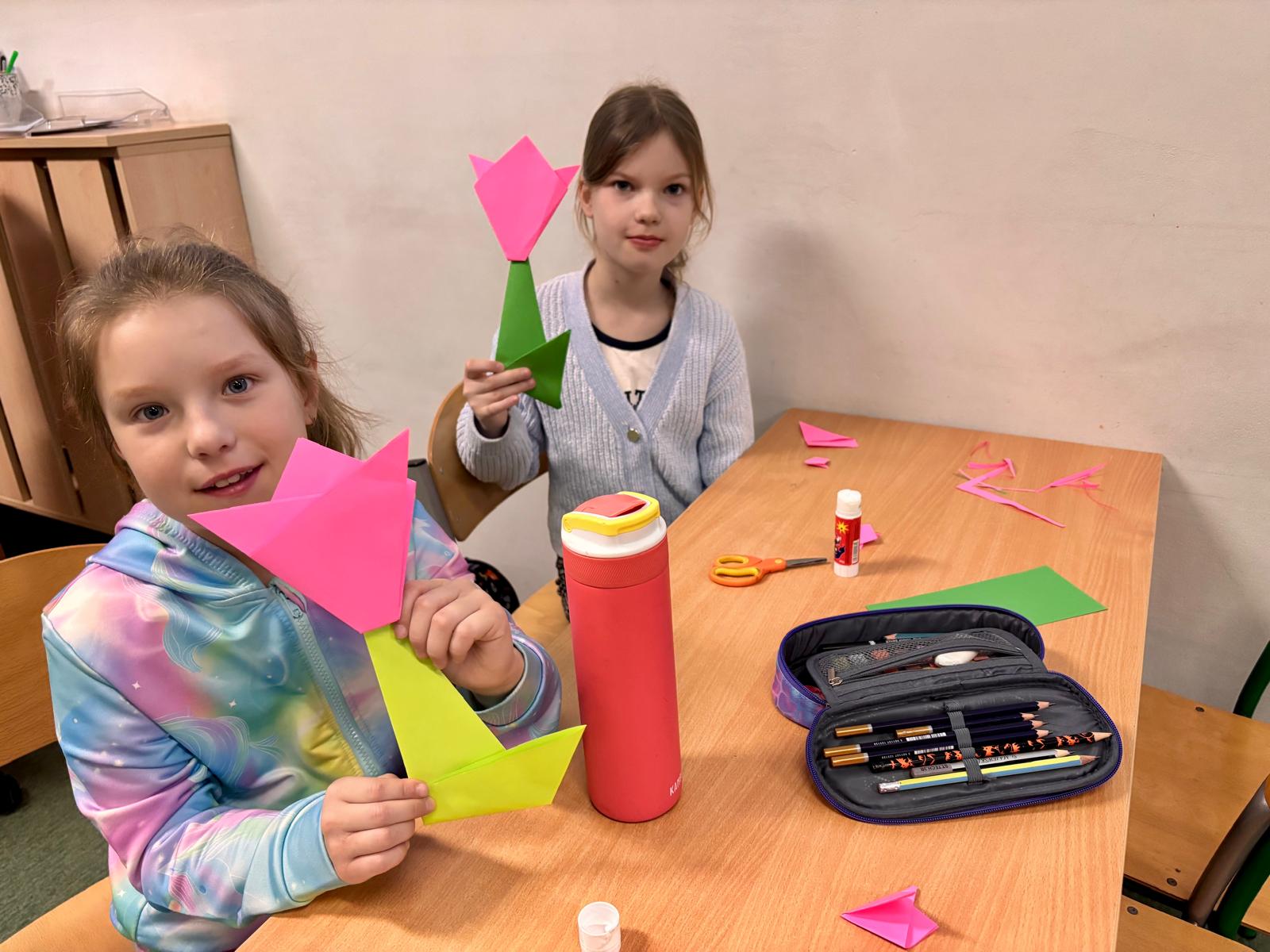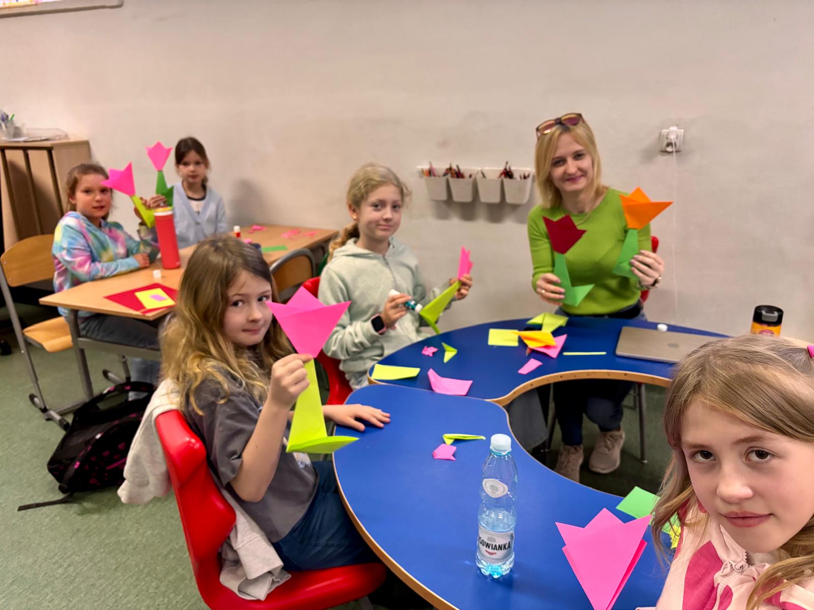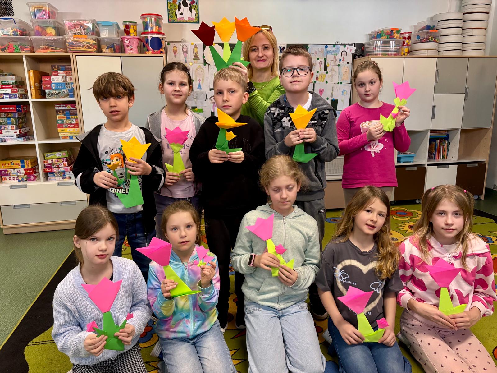 Uczniowie klas 2a i 3a wspólnie przywitali wiosnę podczas zajęć koła origami. Tym razem skupiliśmy się na składaniu kolorowych, papierowych tulipanów. Dzieci z dużym zaangażowaniem trenowały precyzję i cierpliwość, tworząc piękne, wiosenne dekoracje. Efektem naszej pracy jest radosny, papierowy ogród, który ozdobił naszą salę!