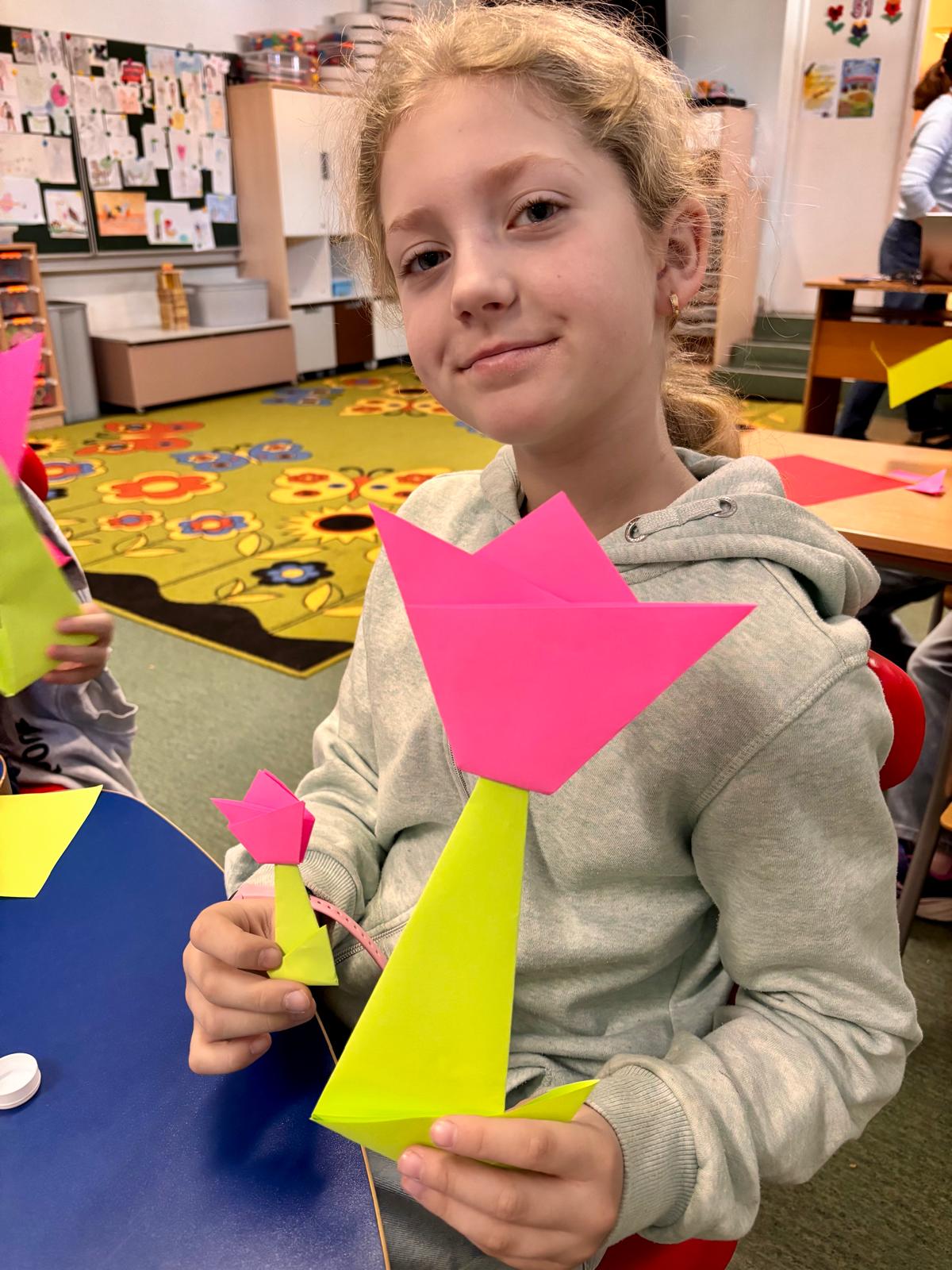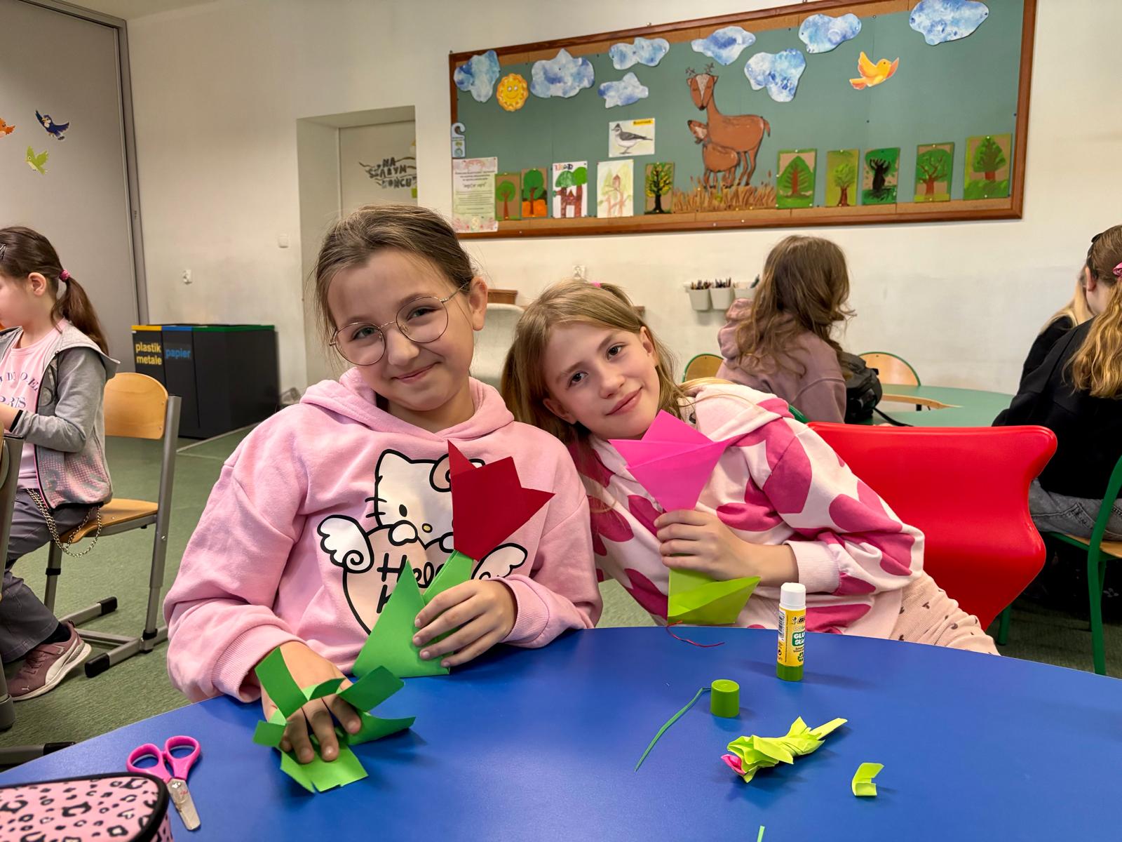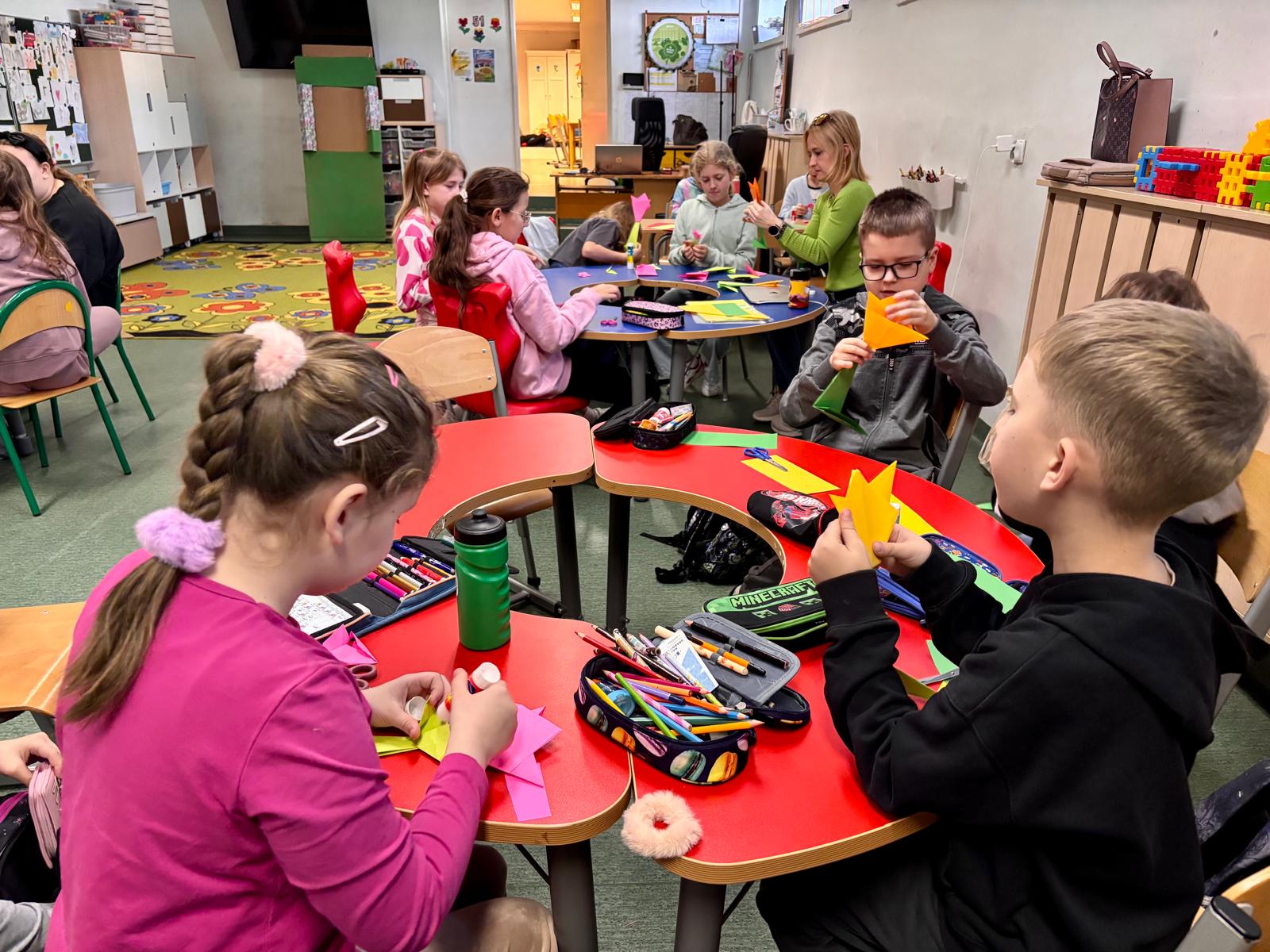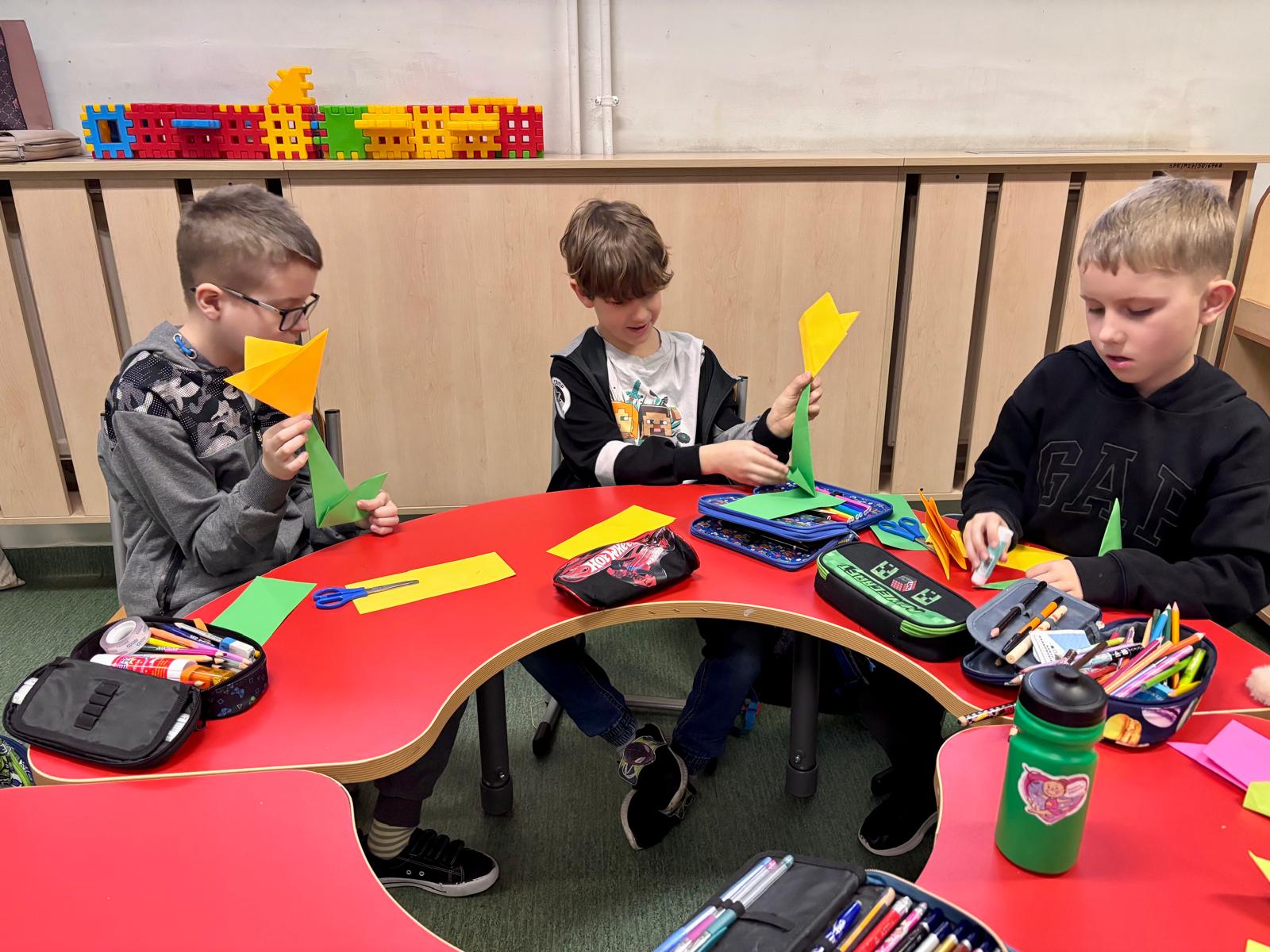 Uczniowie klas 2a i 3a wspólnie przywitali wiosnę podczas zajęć koła origami. Tym razem skupiliśmy się na składaniu kolorowych, papierowych tulipanów. Dzieci z dużym zaangażowaniem trenowały precyzję i cierpliwość, tworząc piękne, wiosenne dekoracje. Efektem naszej pracy jest radosny, papierowy ogród, który ozdobił naszą salę!